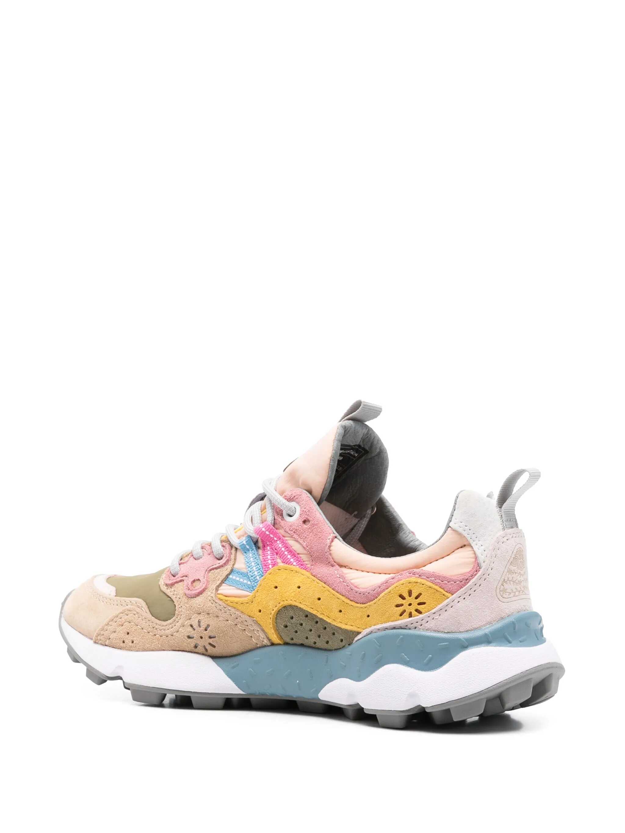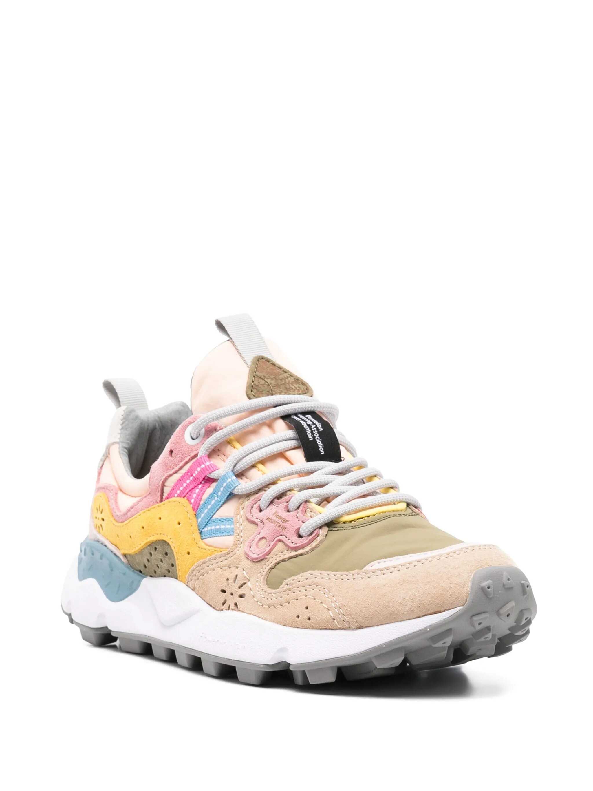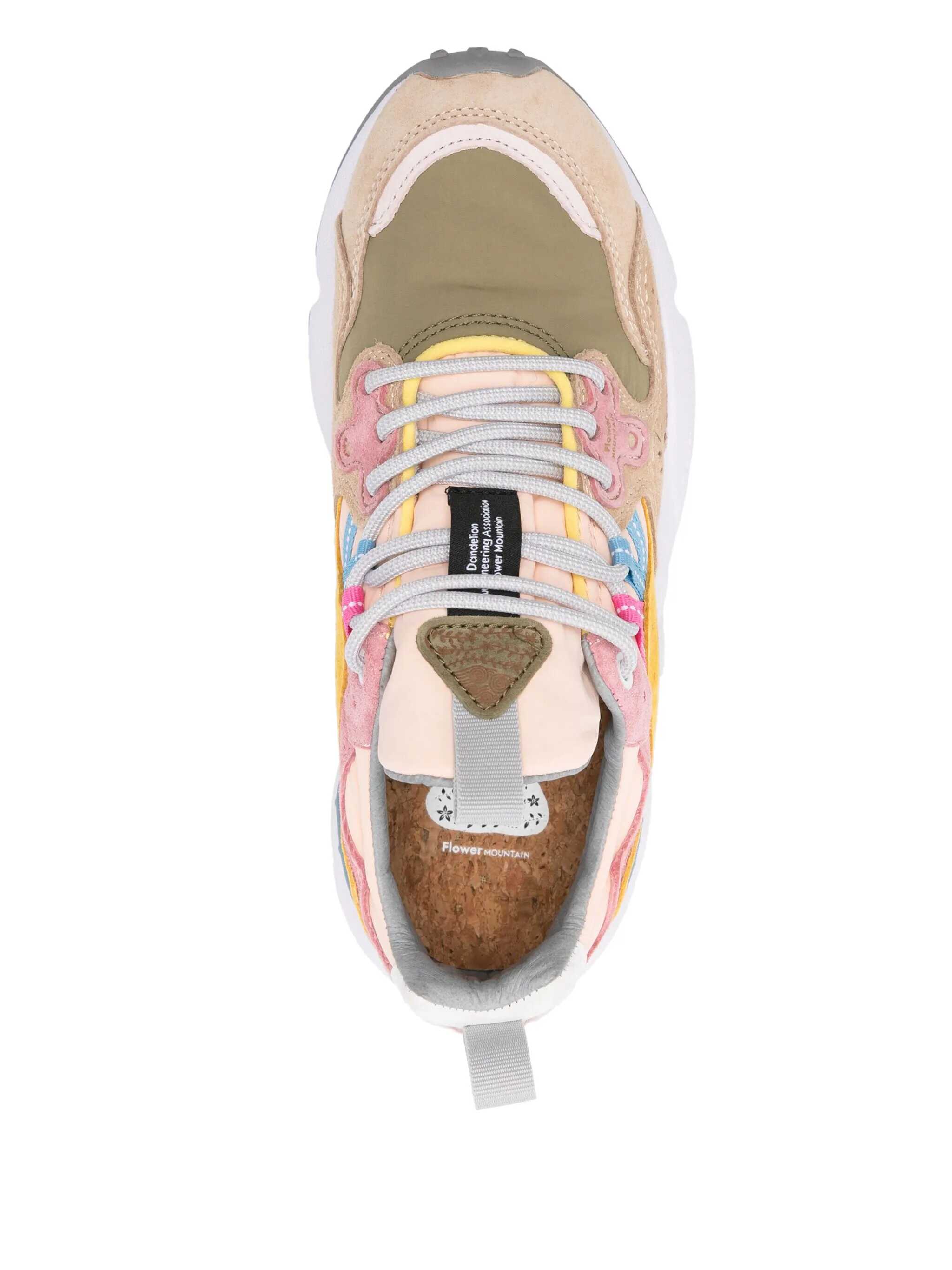 "Flower Mountain sneakers made of technical fabric with multicolored suede inserts. Reinforced eyelets and trekking laces. Antibacterial natural cork insole, ultra-light rubber sole with a serrated tread."
