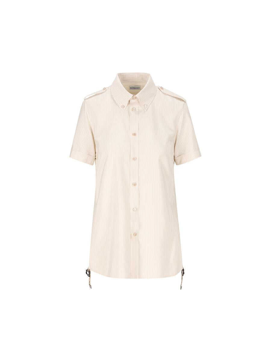 - Material: 100% silk - Color: beige - Other details: woven with a delicate pinstripe pattern and adjustable side gathers with Burberry Check straps and B-shaped buckles, pointed collar, curved hem - Front button closure - Item number: 8108159C2713