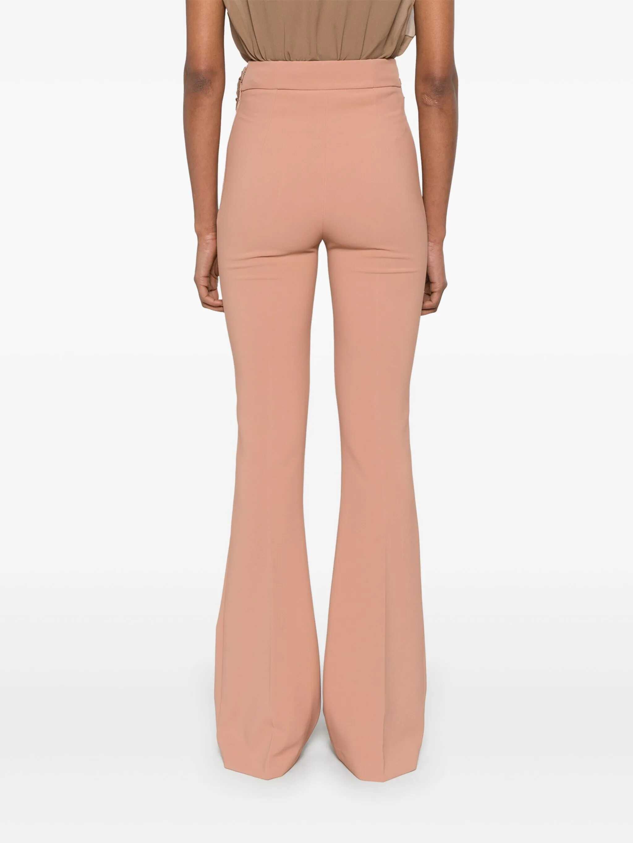 Light crepe trousers with flared leg at the bottom. The style detail is the satin band, softened by the bow motif.