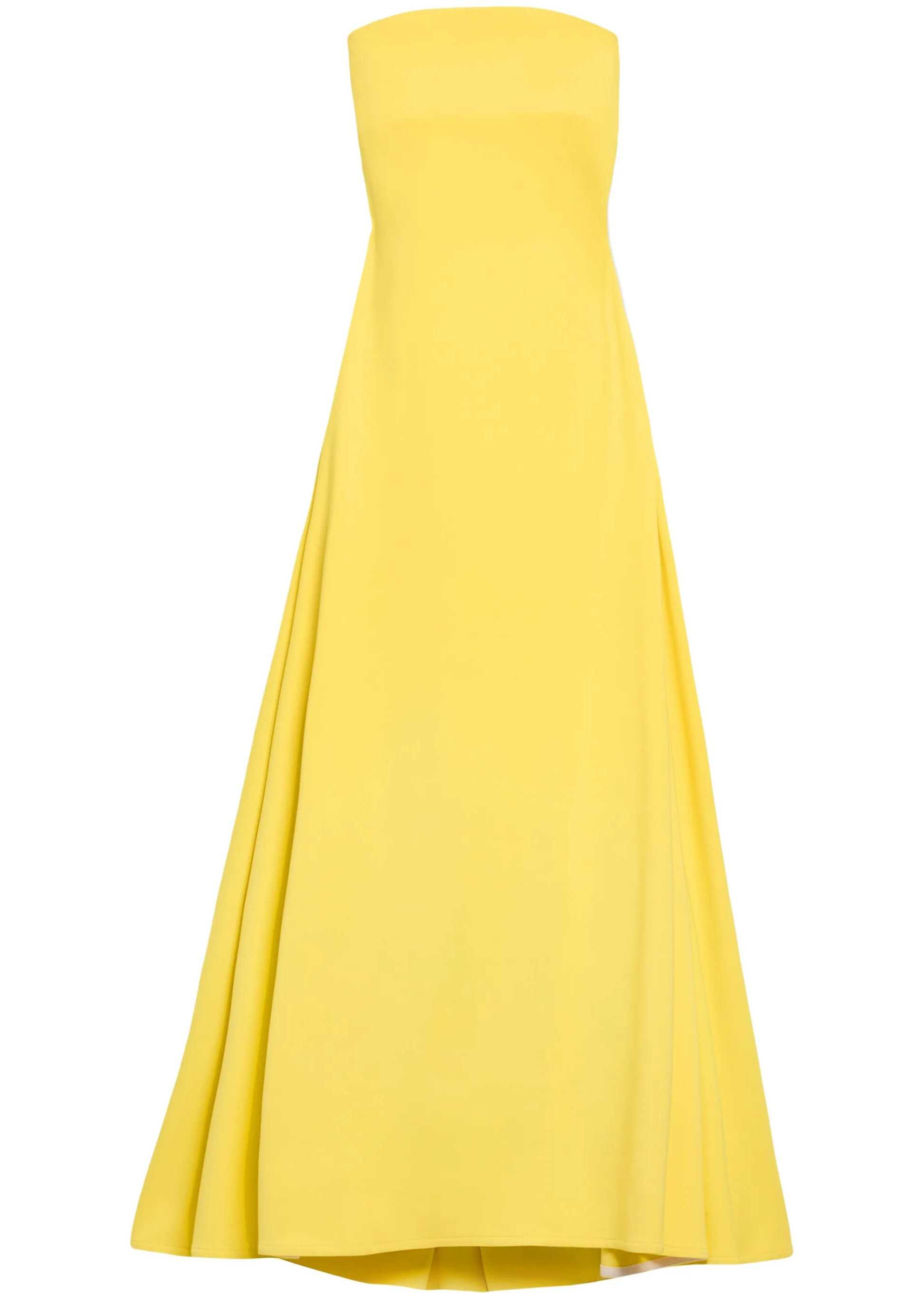 Bustier long dress in yellow stretch viscose. It features a rounded neckline without straps, an internal structured bustier, concealed side zip with a side hook-and-eye closure, a flared silhouette from the hips down, and a folded train at the back. Fitted fit.