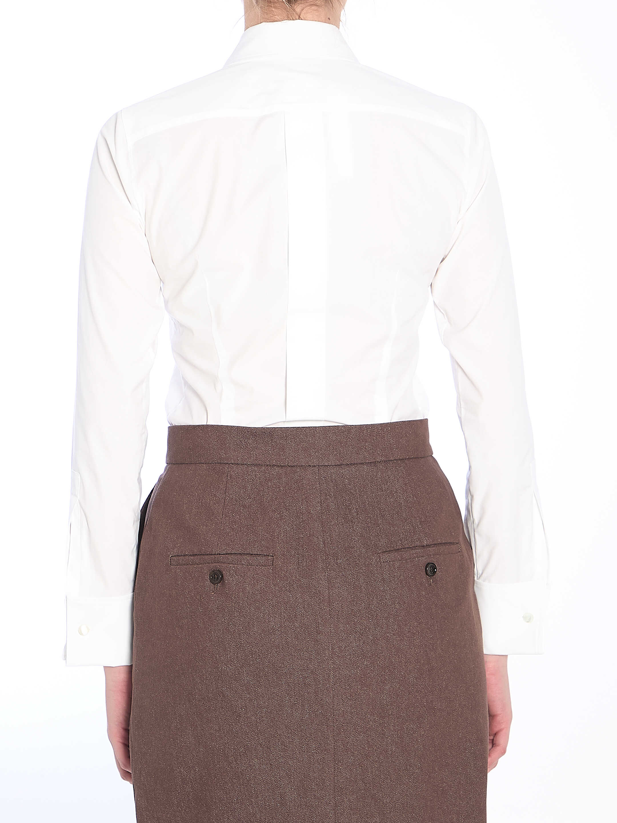 Bodysuit shirt in optical white stretch cotton poplin. It features a pointed collar, front button closure, an integrated sheer fabric bottom with snap button fastening, and high cuffs with engraved "M" cufflinks.