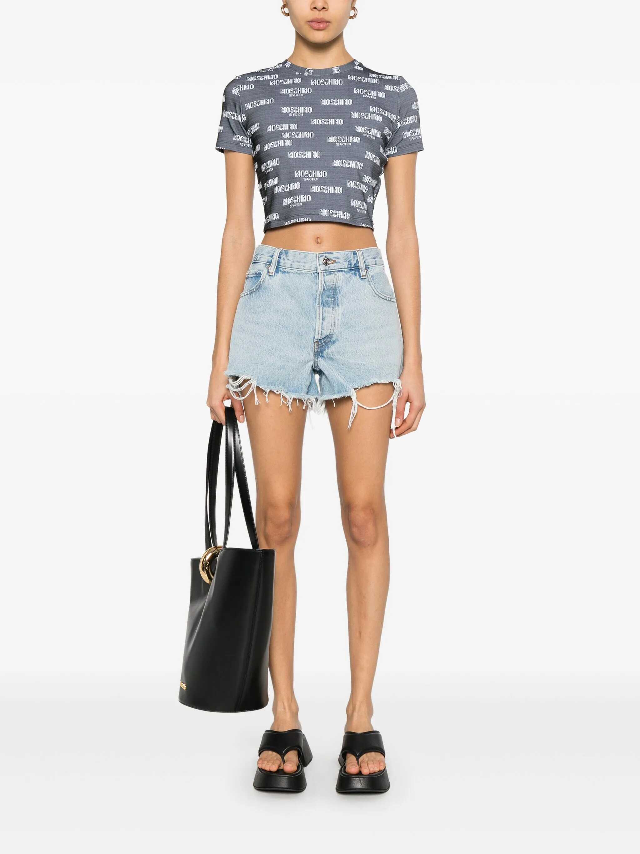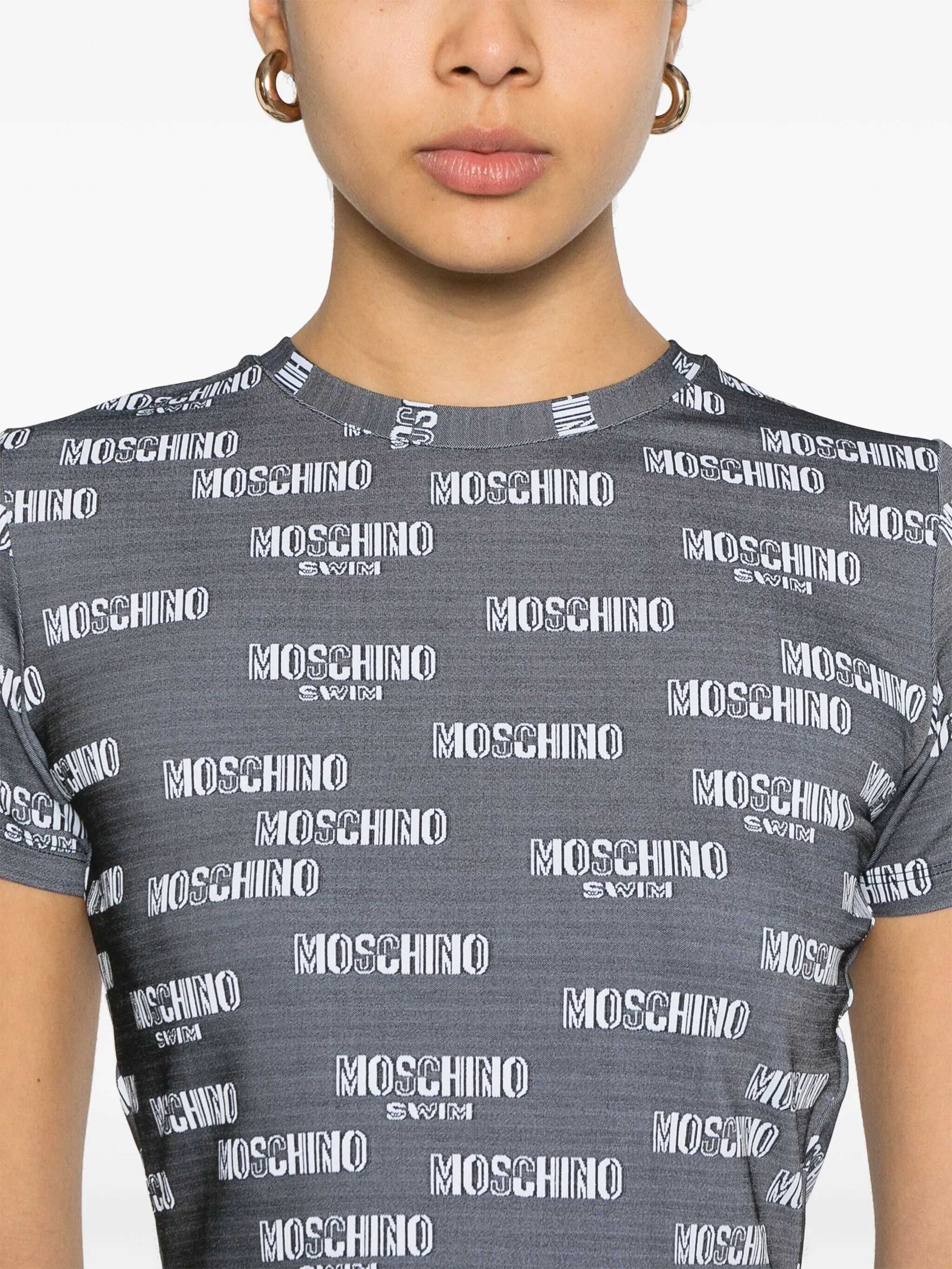 Grey stretch t-shirt from Moschino Swim featuring crew neck, short sleeves, with logo and cropped