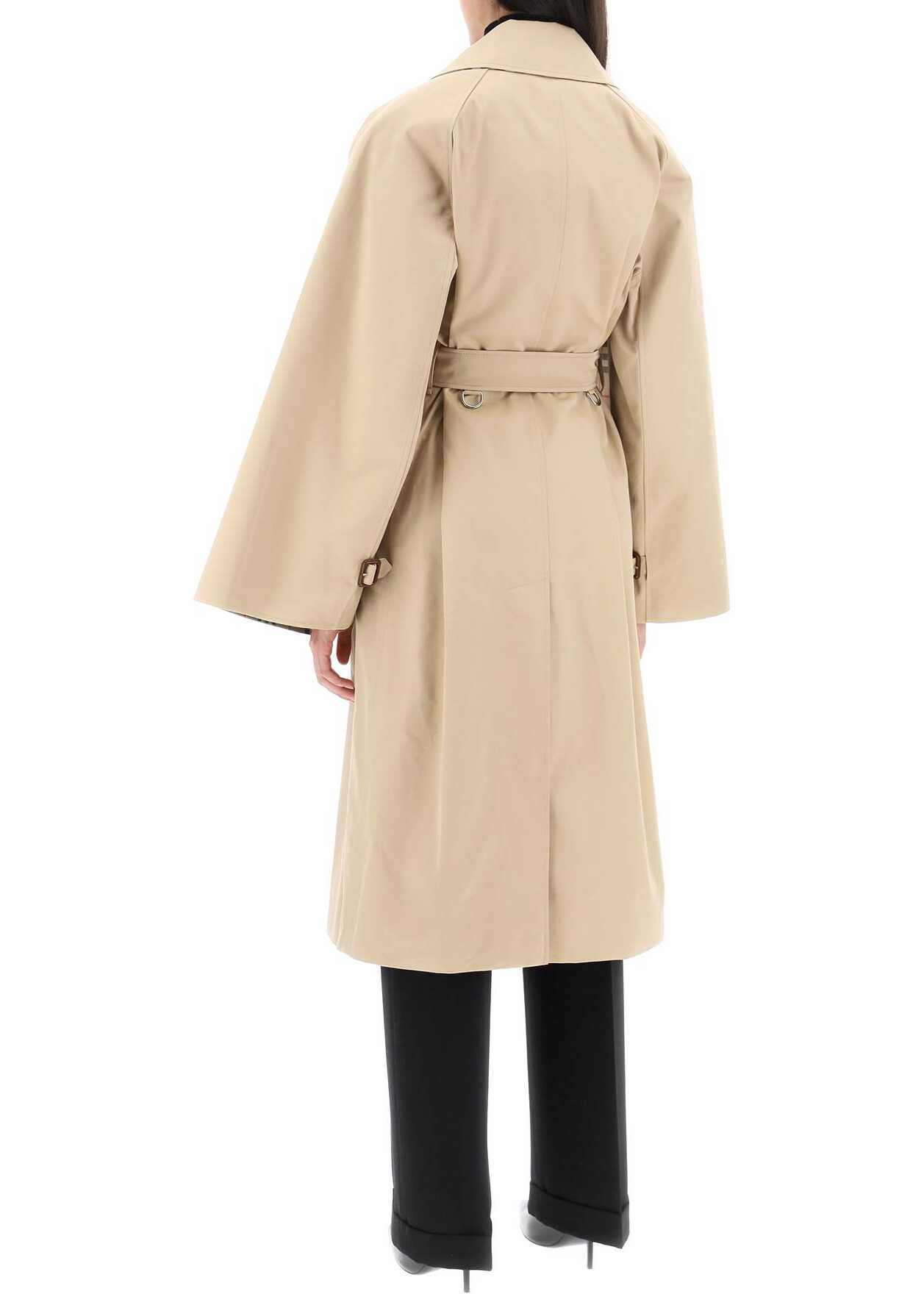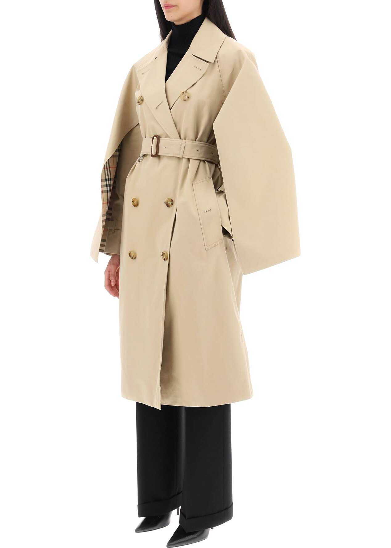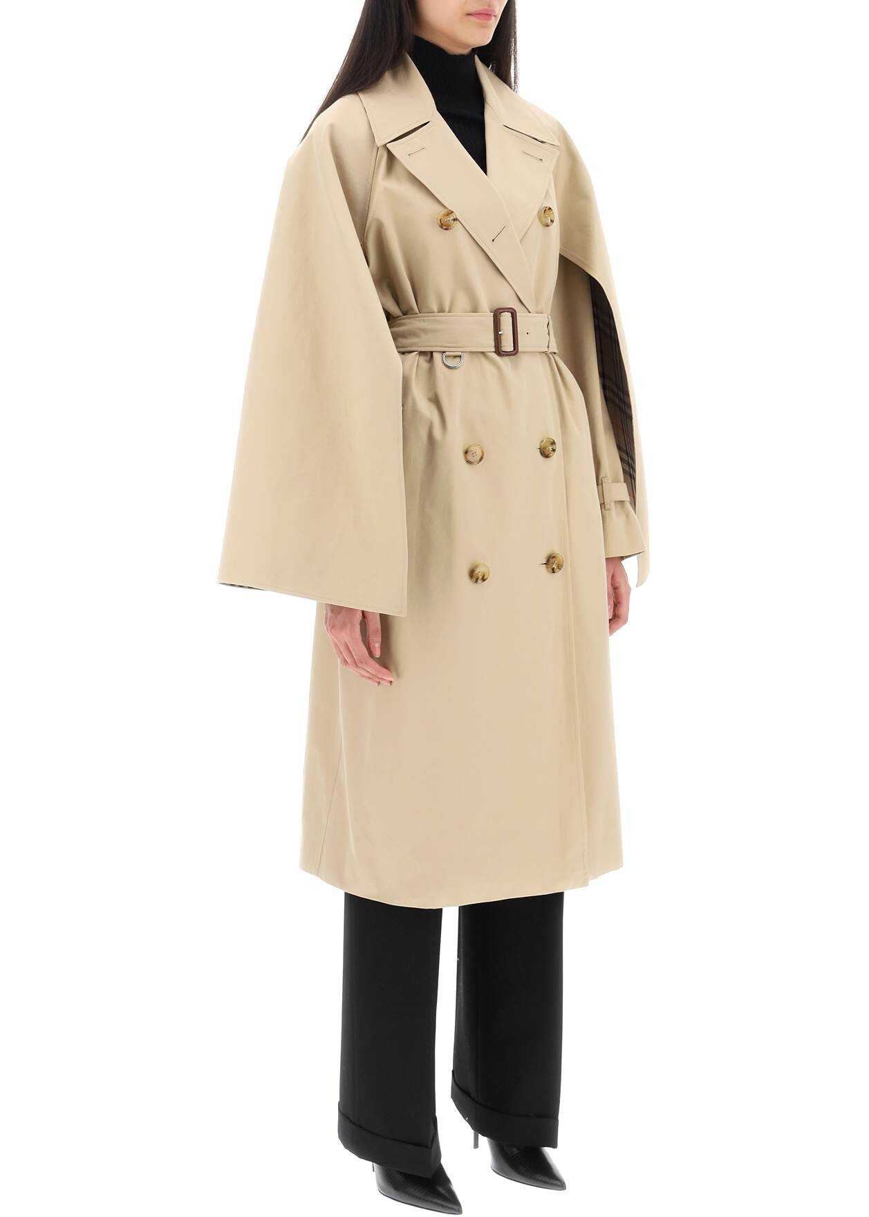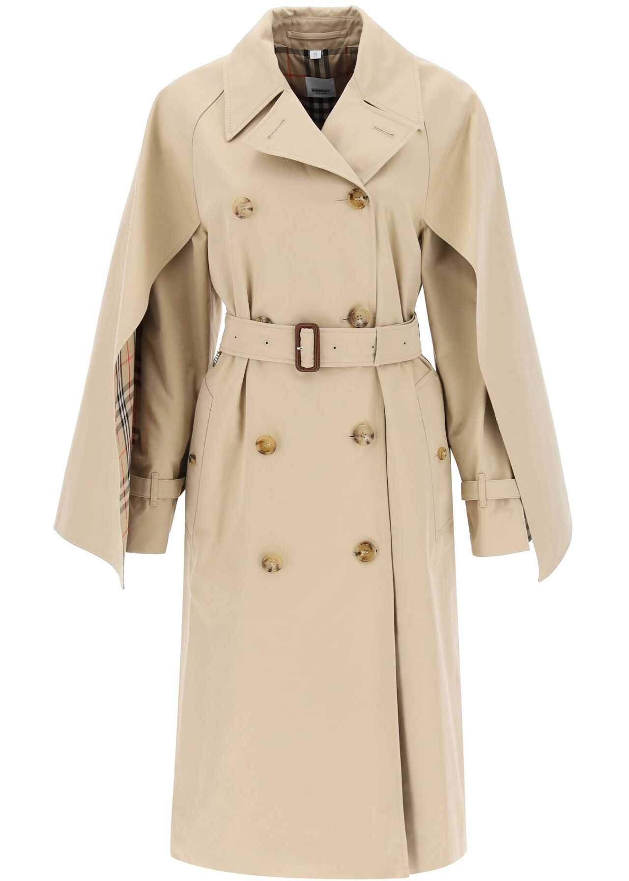 Burberry raincoat crafted in pure cotton gabardine. Double-breasted design with eight-button closure, characterized by adjustable cape sleeves with straps and button at cuffs and finished with inner Burberry Check detail. It features peak lapel, side welt pockets and adjustable belt with buckle embellished with D-rings on the waistline. Inner lining in cuprous with Burberry Check motif. Regular fit. The model is 177 cm tall and wears size UK 6.