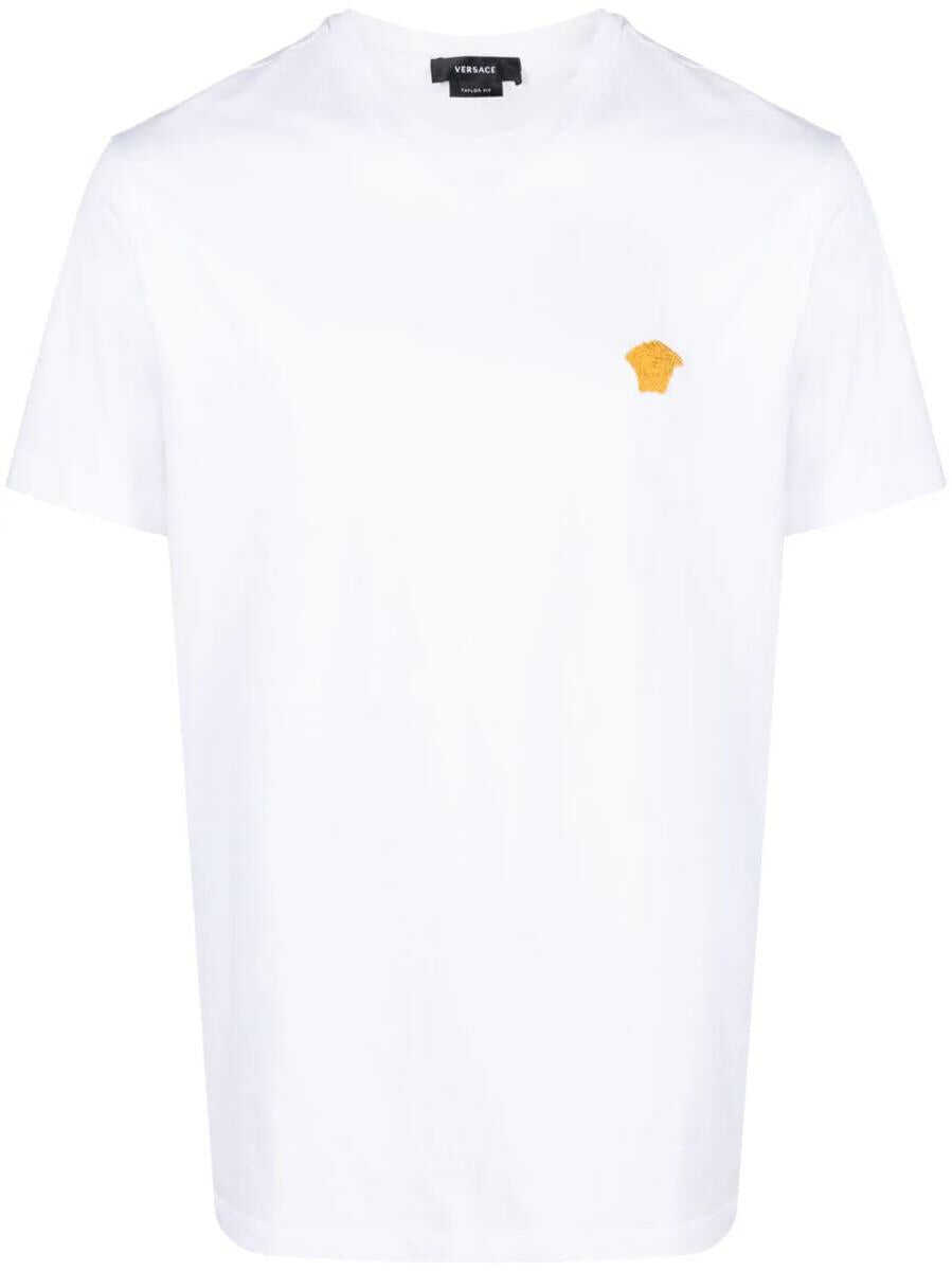 White, cotton, jersey knit, Medusa head motif, short sleeves, round neckline and straight hem.