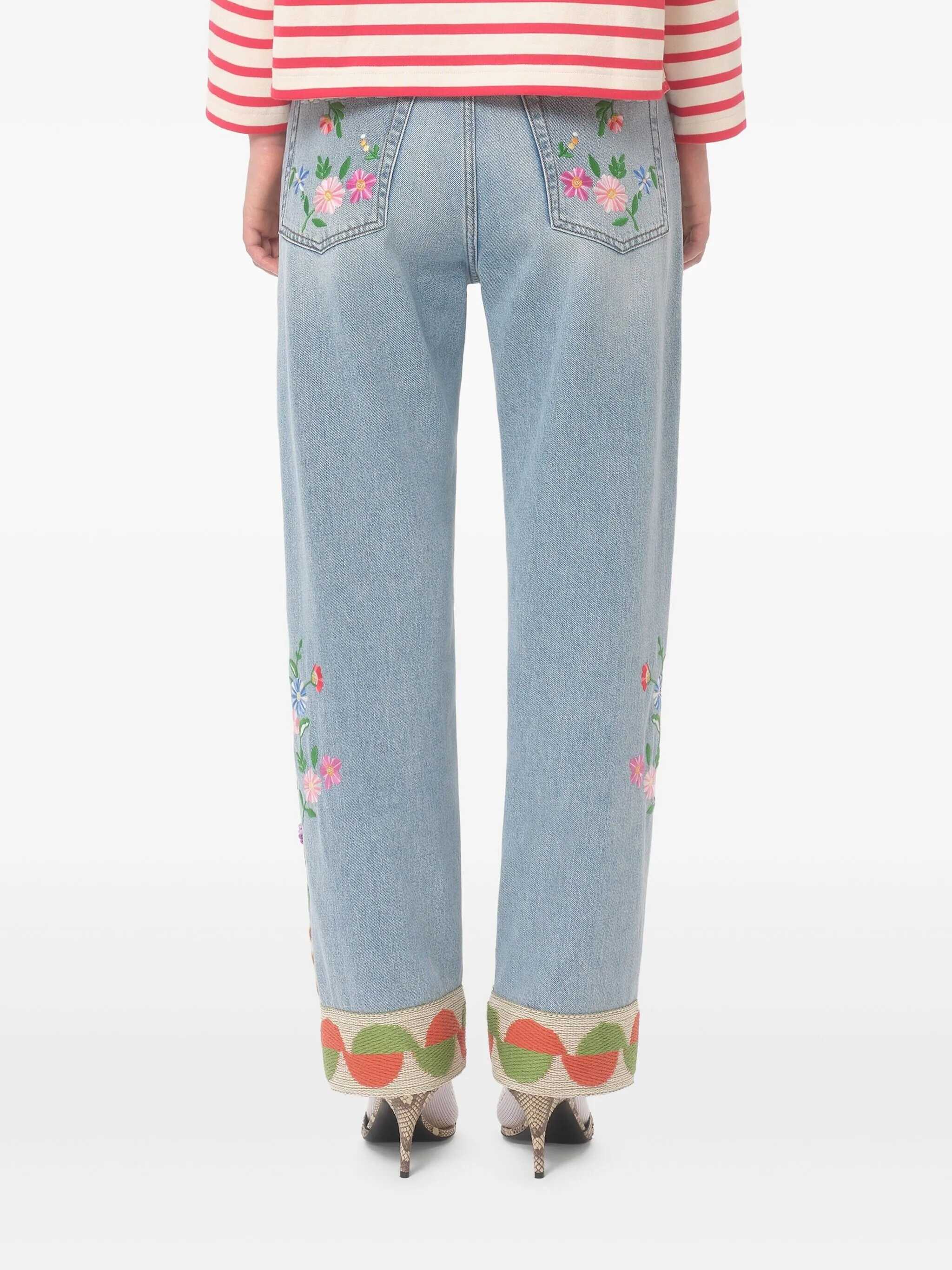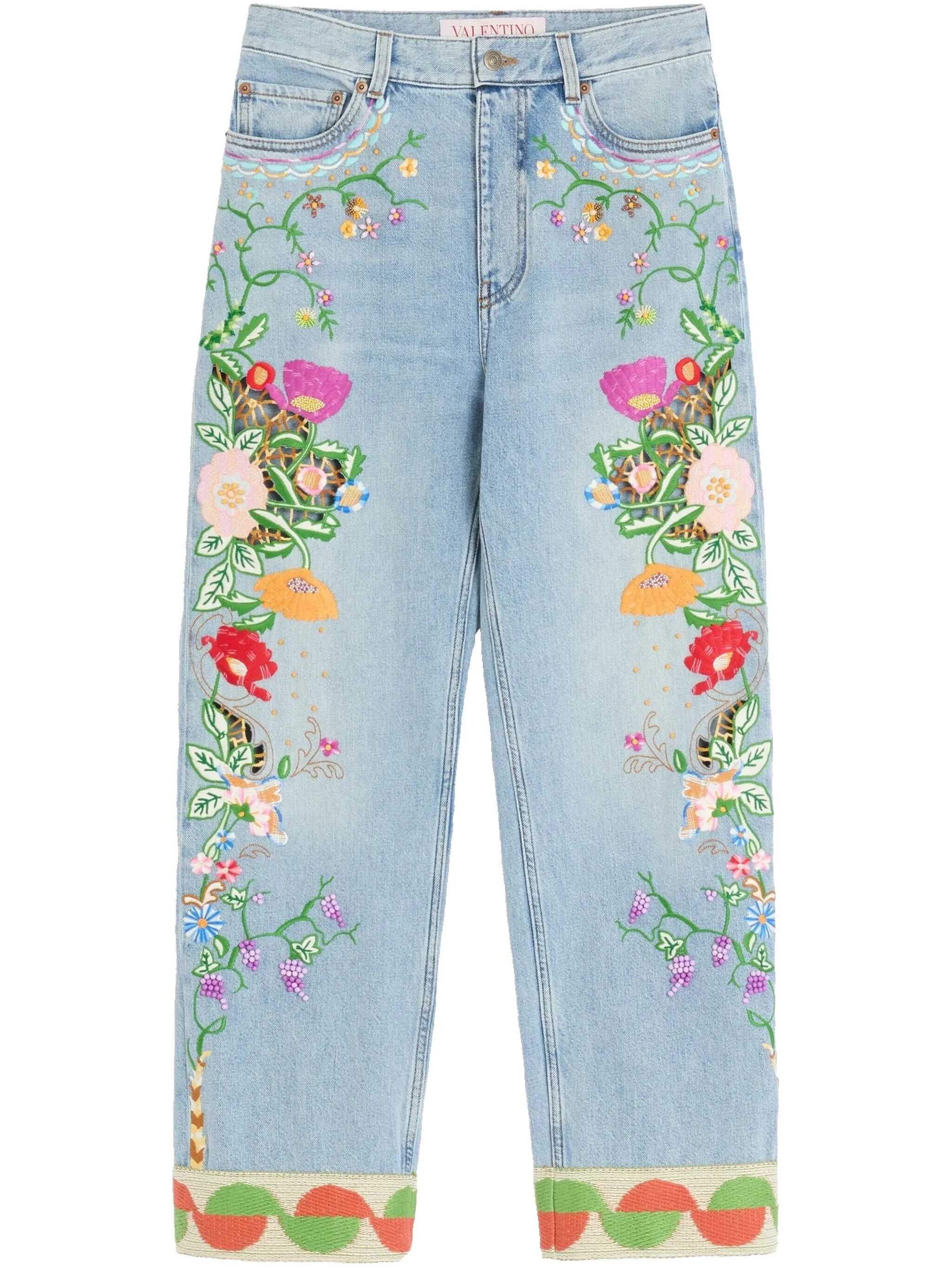Valentino Garavani straight-leg jeans made of light blue cotton denim with colorful floral and decorative embroidery. Featuring a front closure with a metallic button and zip, belt loops, five classic pockets, a leather logo patch on the back, and a jacquard fabric trim.