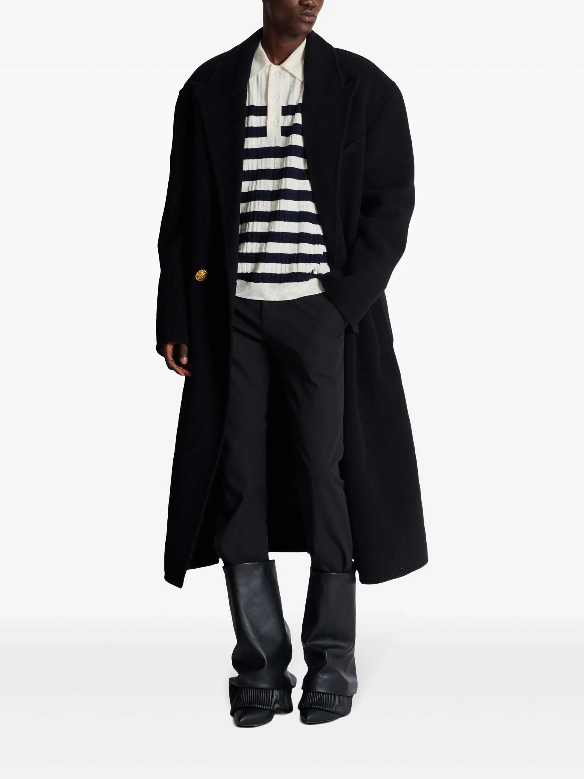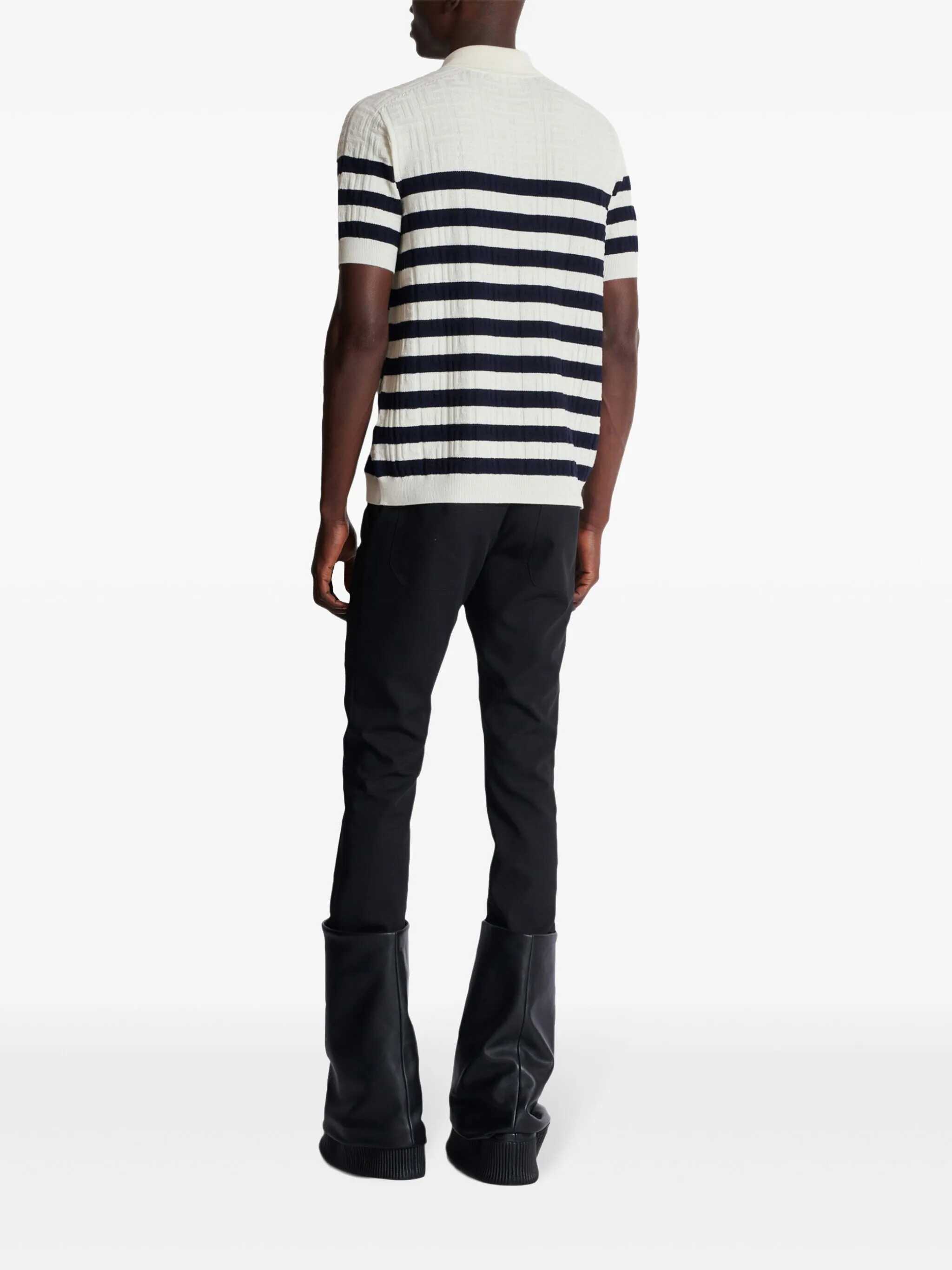 Polo in beige wool, collar, short sleeves, hidden closure with buttons, stripes print, embossed logo, rib hem, 100% wool, Made in Italy, the models is 1.91 and wears size L
