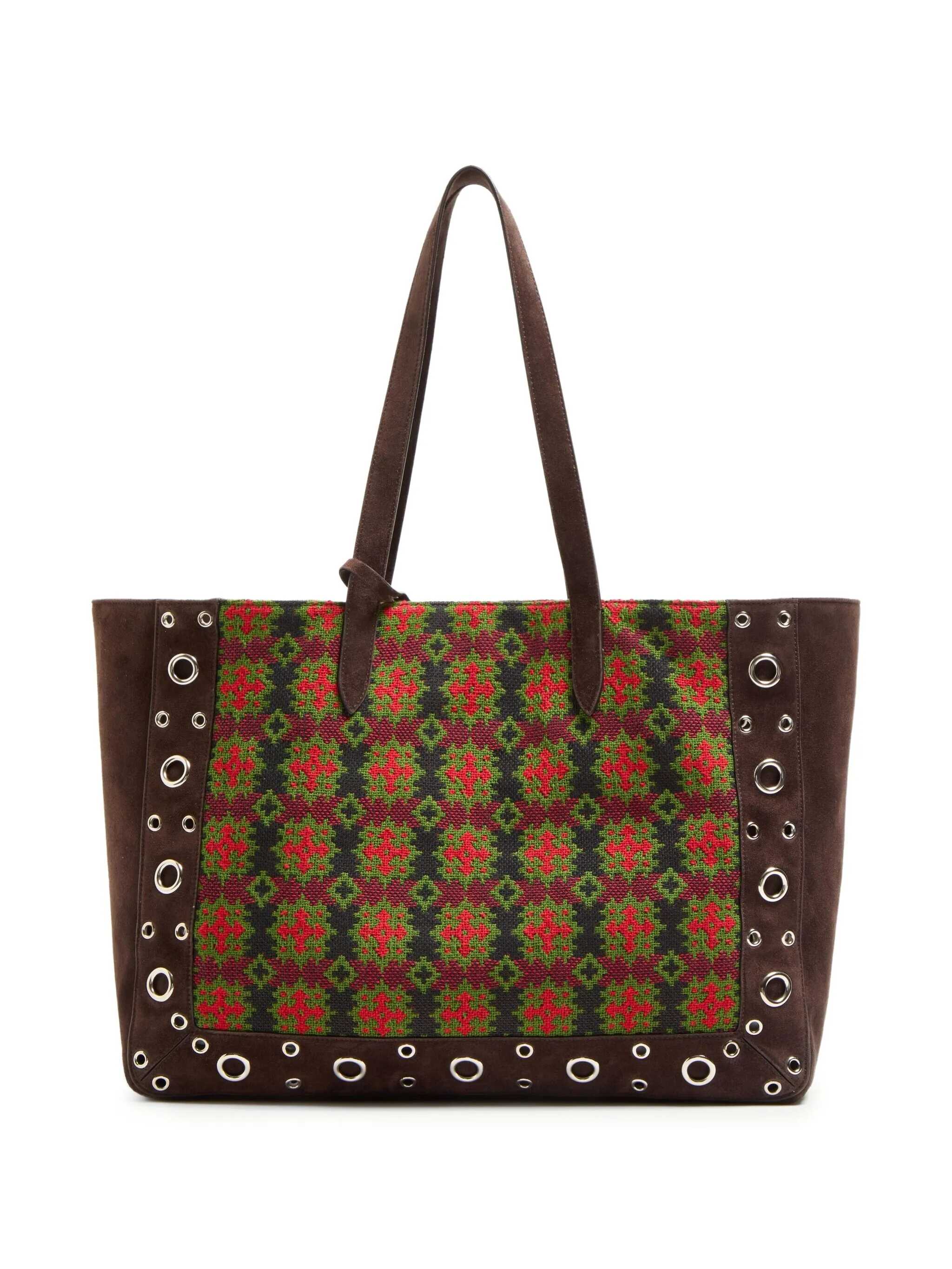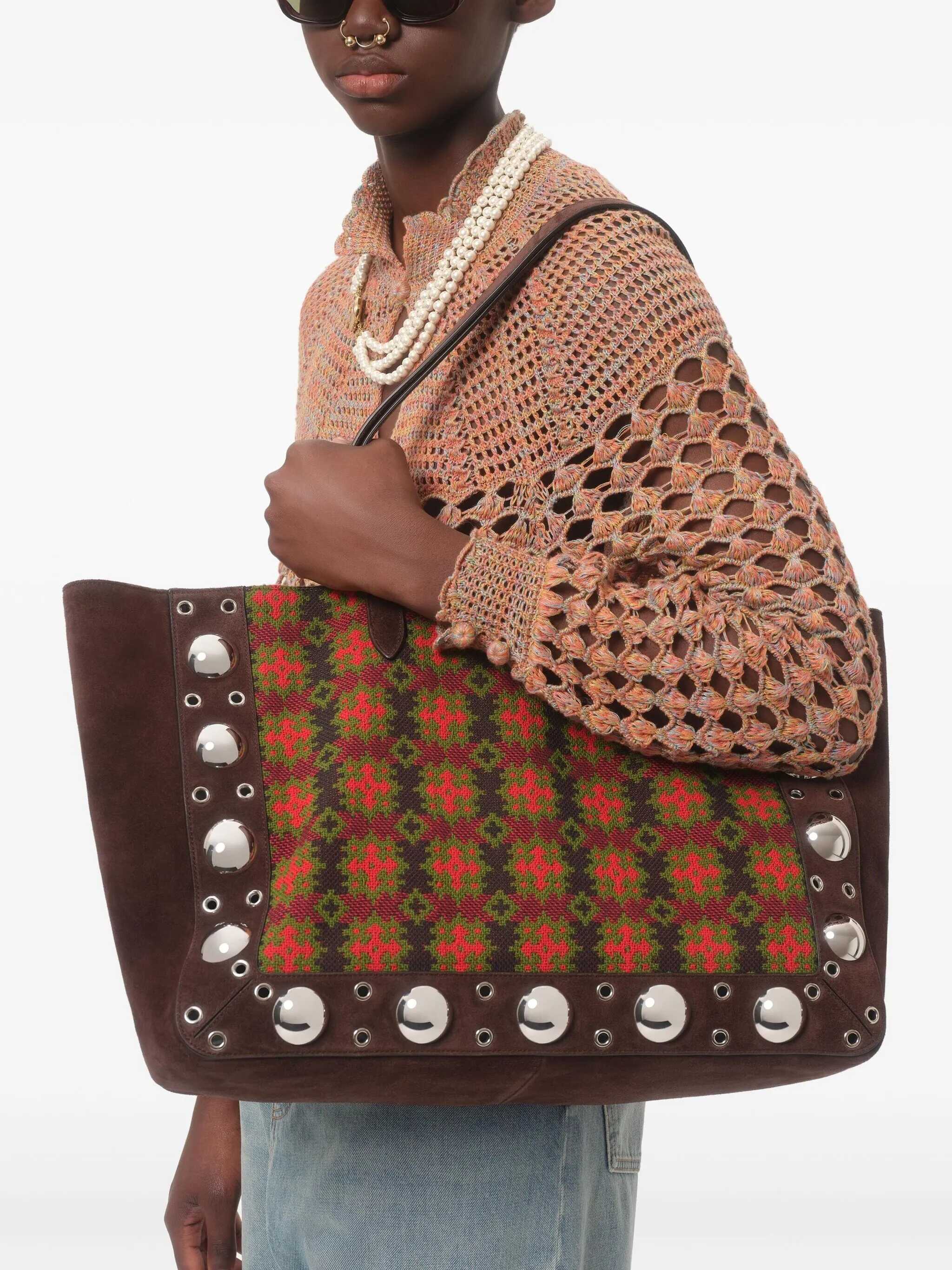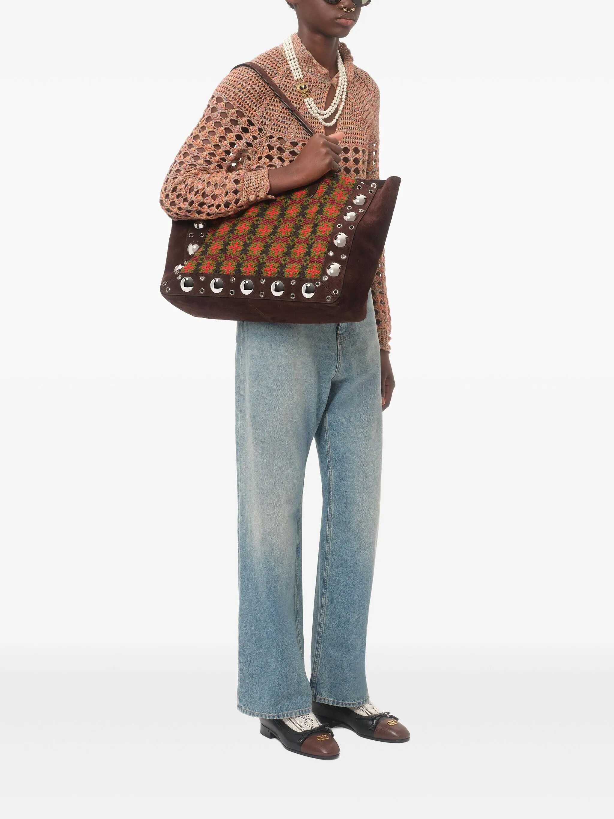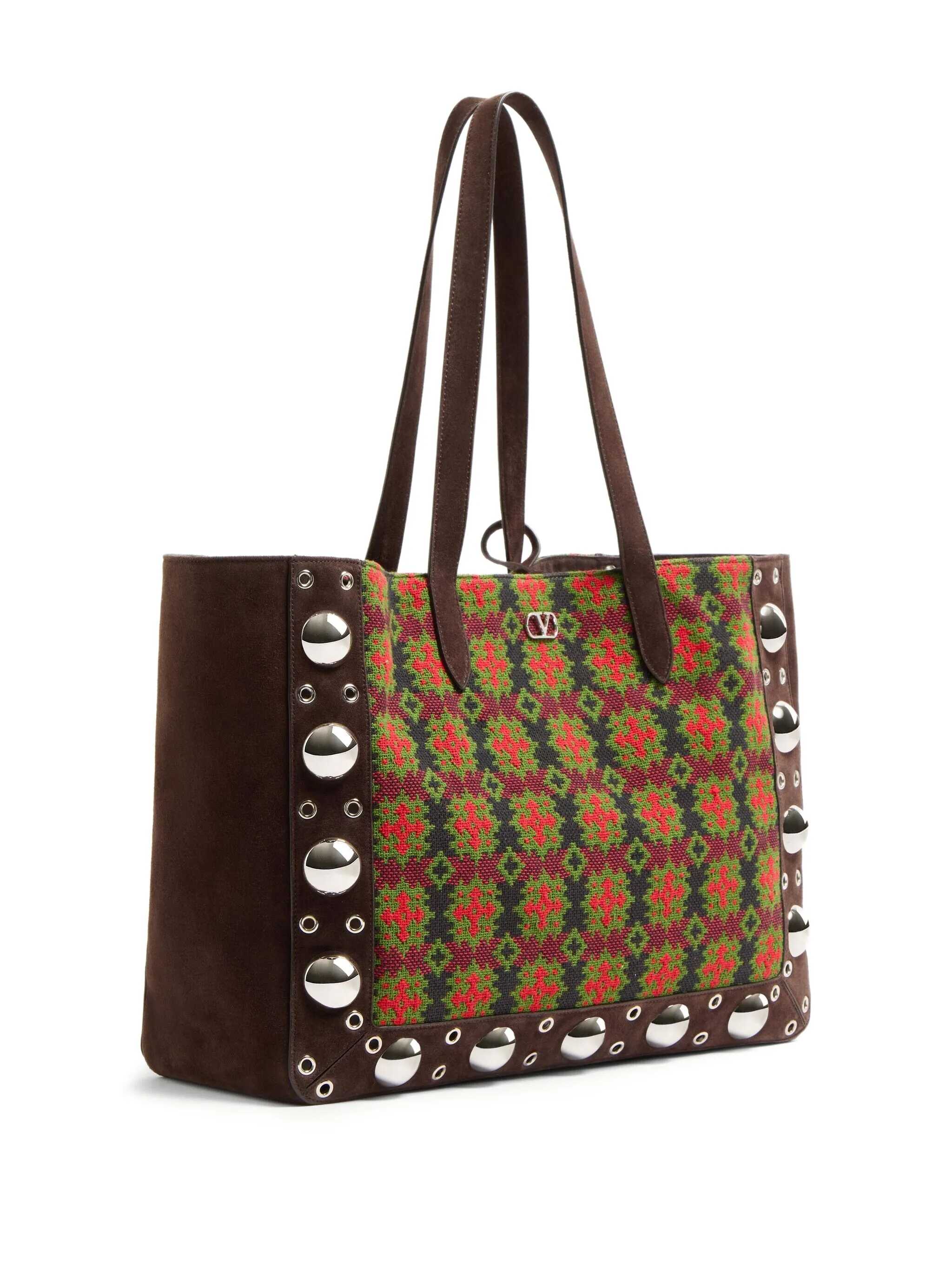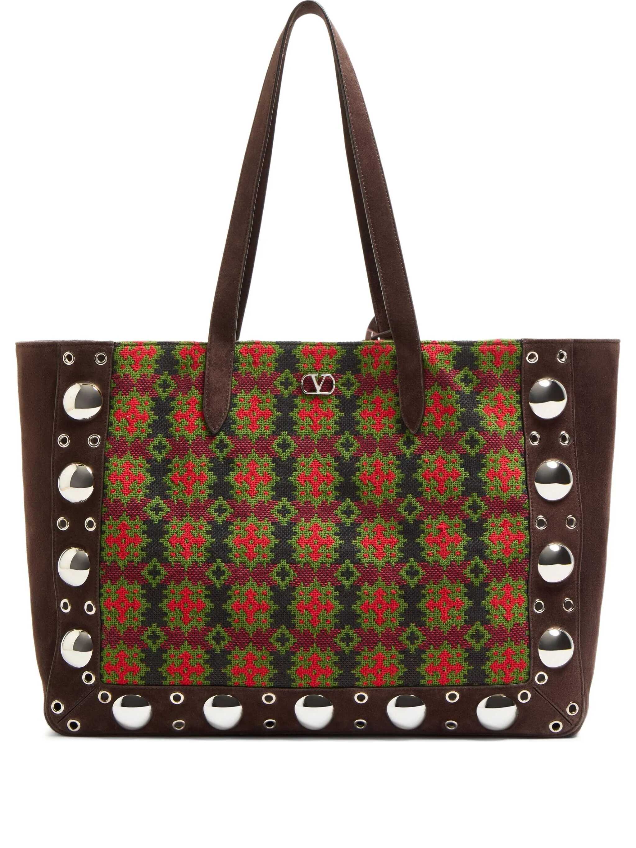 Large 'Nellcôte' shopping bag in jacquard fabric with geometric pattern, suede trim decorated with ball studs and rivets, metal VLogo Signature on the front, double fixed handle, and removable inner clutch