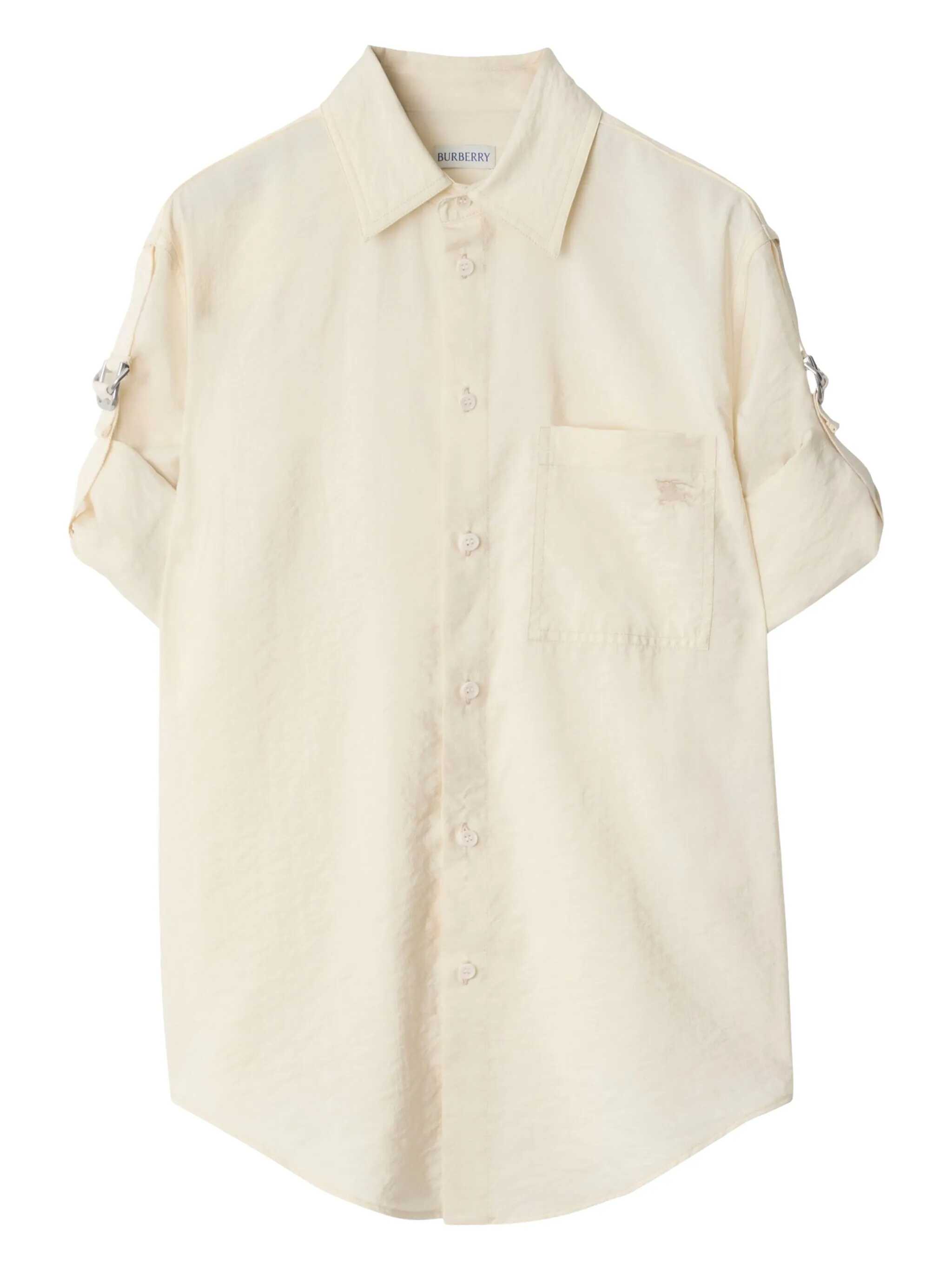 Burberry shirt crafted from an ivory silk blend. Featuring a classic collar, front button closure, an applied chest pocket with Equestrian Knight Design embroidery, long sleeves with Burberry check straps and B-shaped buckles, and a rounded hem.