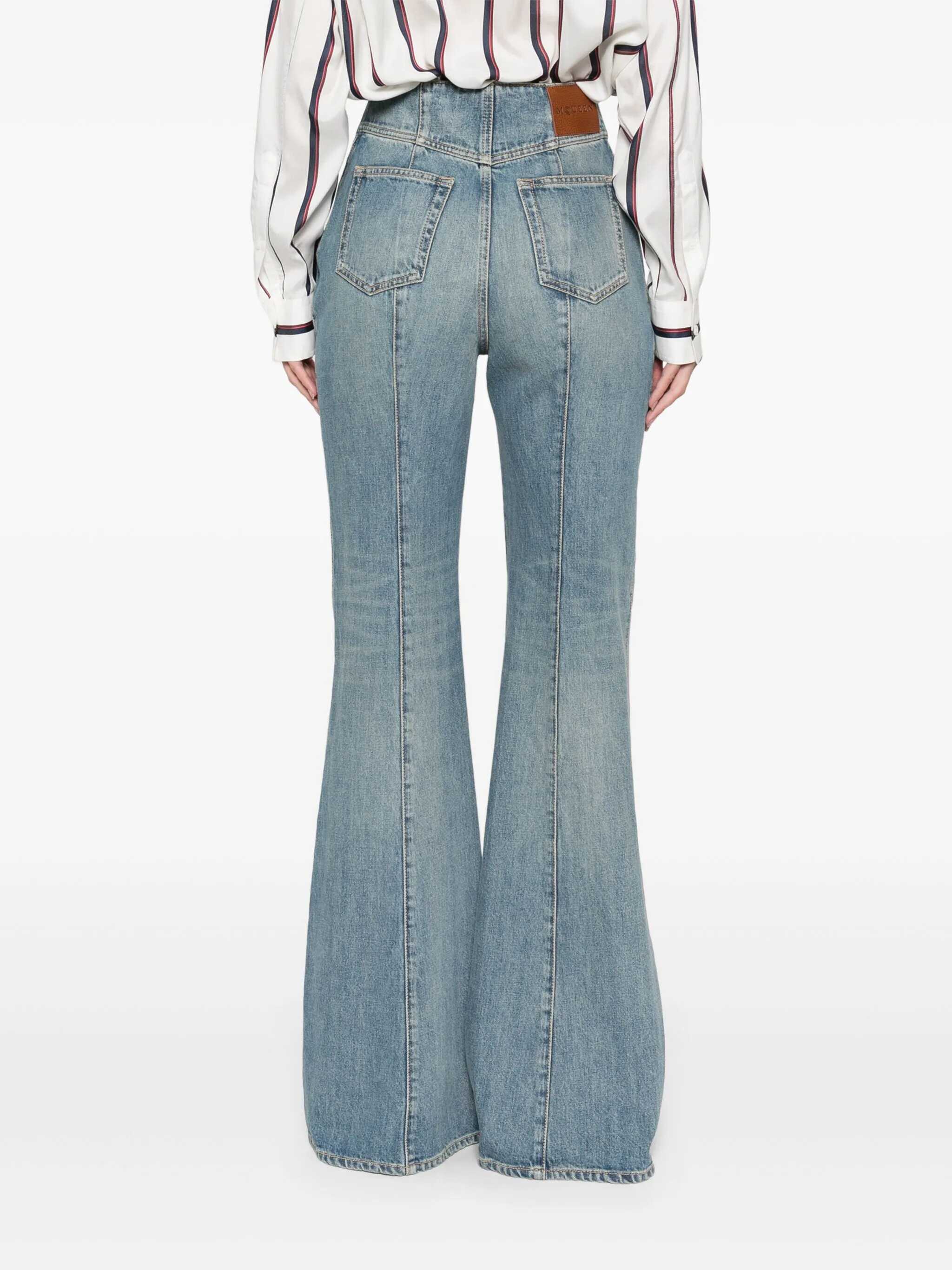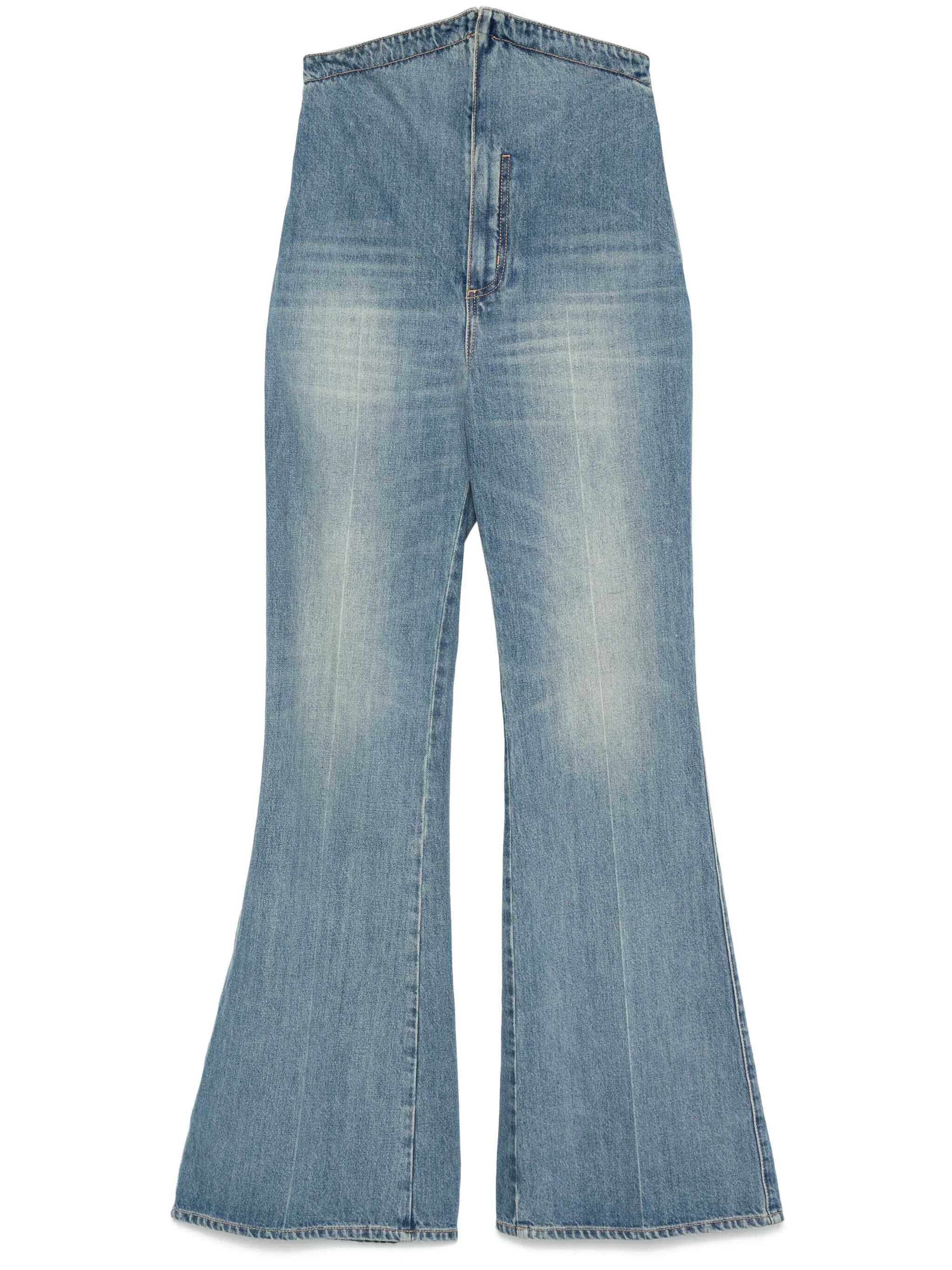 Denim pants, bootcut model, high waist with turn-up, zip and button closure, side pockets