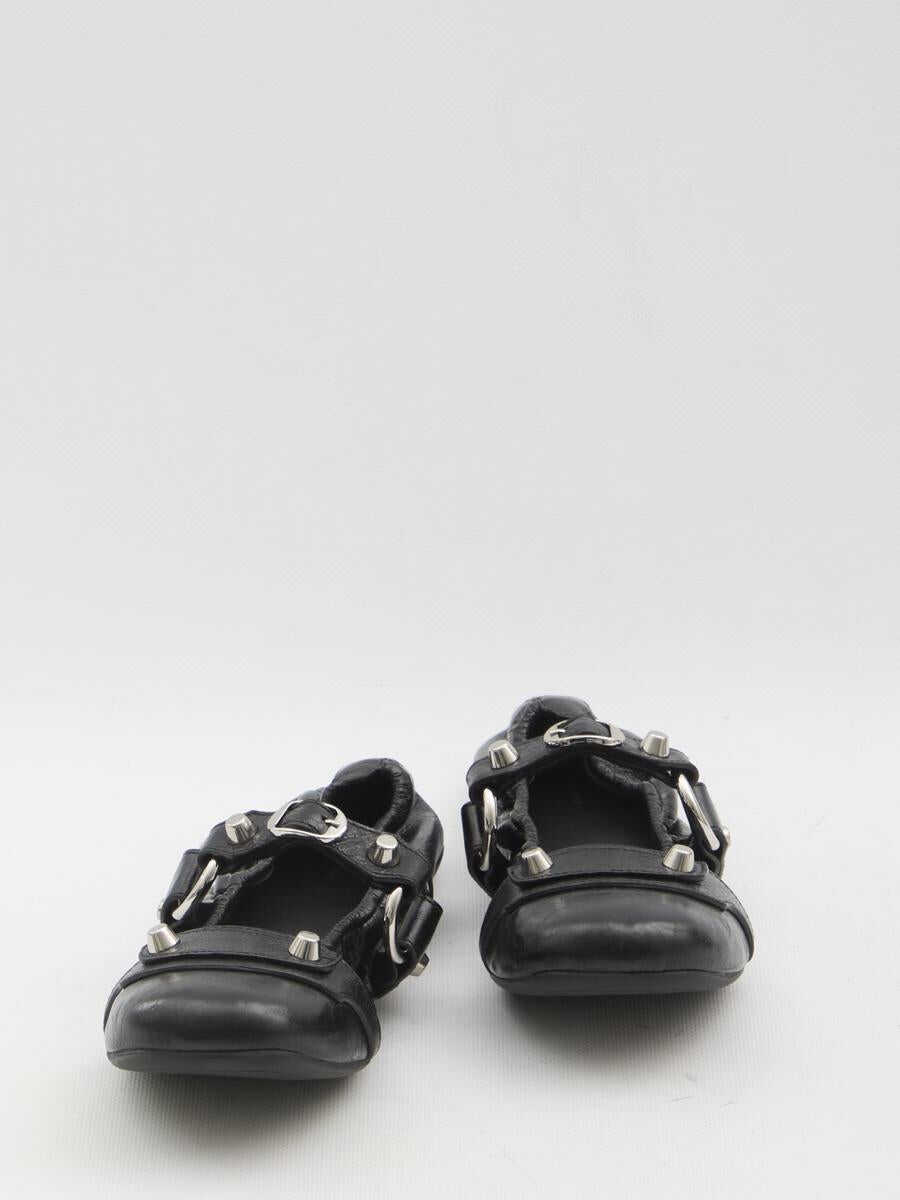 Le City ballet flats in black "Arena Storico" lambskin leather with an elastic trim. They feature a round toe, metal details on the toe, a strap with rings, and metallic accents on the upper. Rubber sole. Dust bag included. Any imperfections in the leather should not be considered manufacturing defects but rather a characteristic of the material.