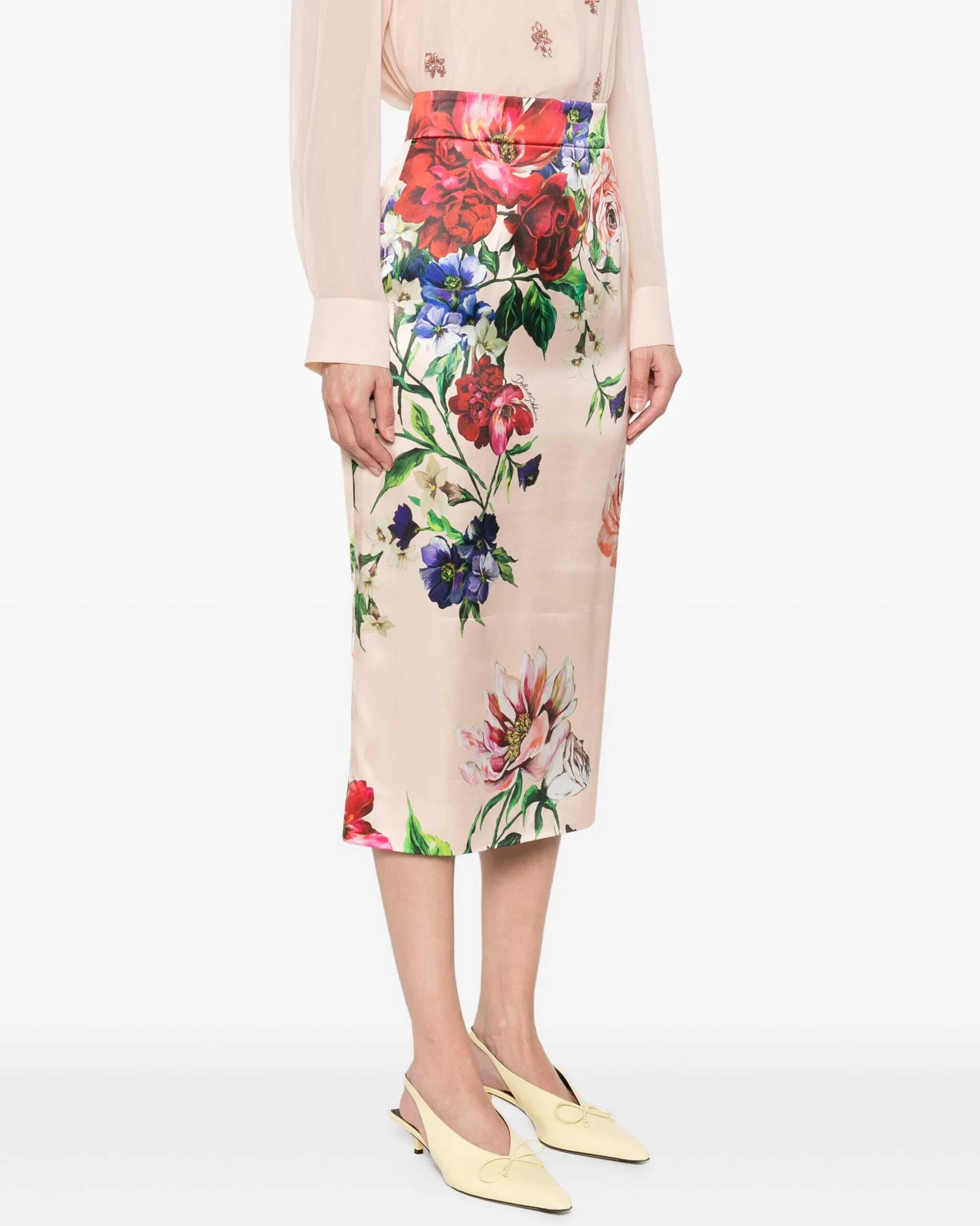 Midi skirt in blush pink stretch satin with Fiori print. It features front stitching, a cursive logo on the front, a back zip with a hook closure, and a back slit.