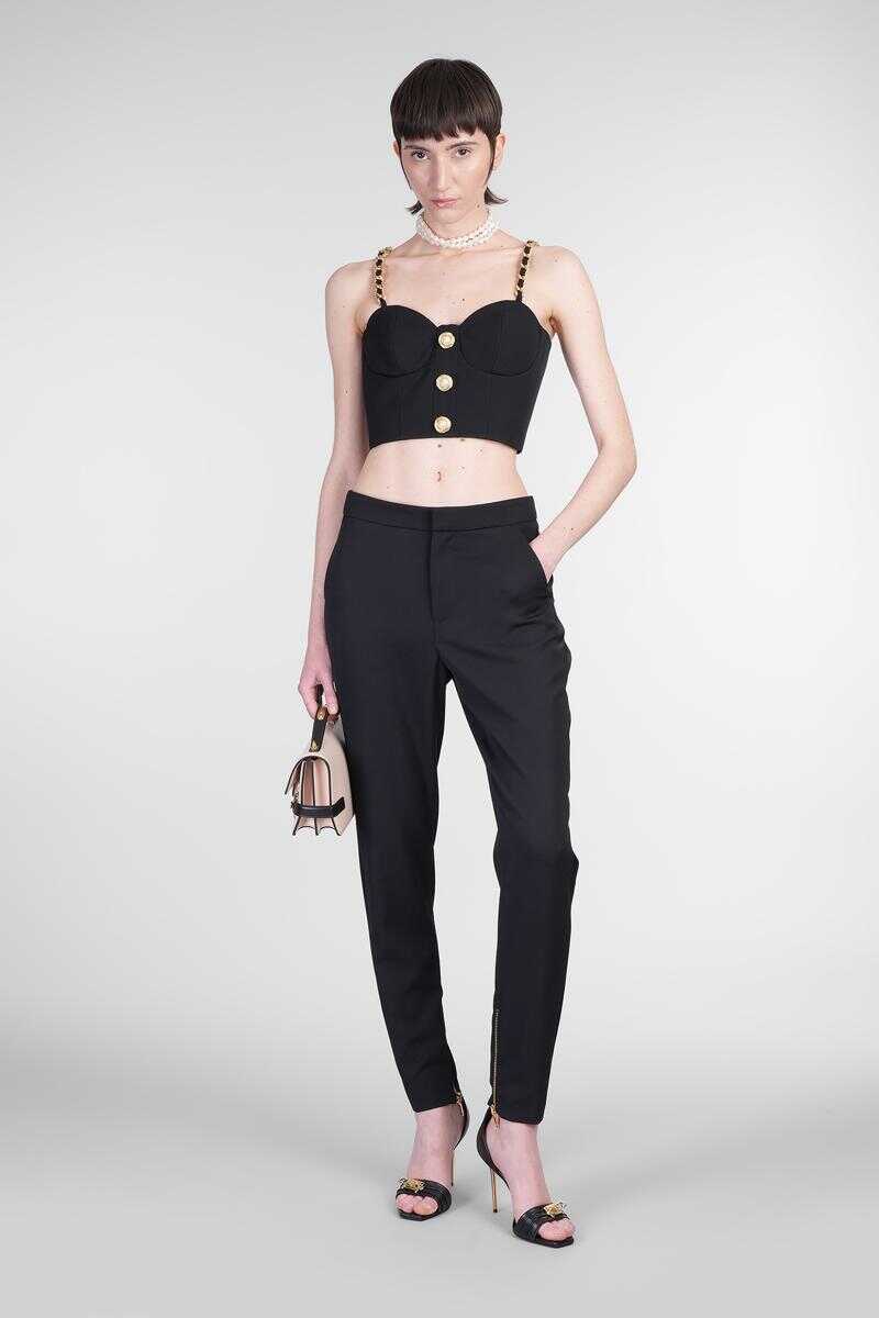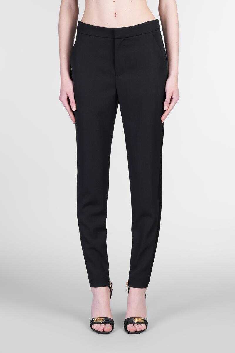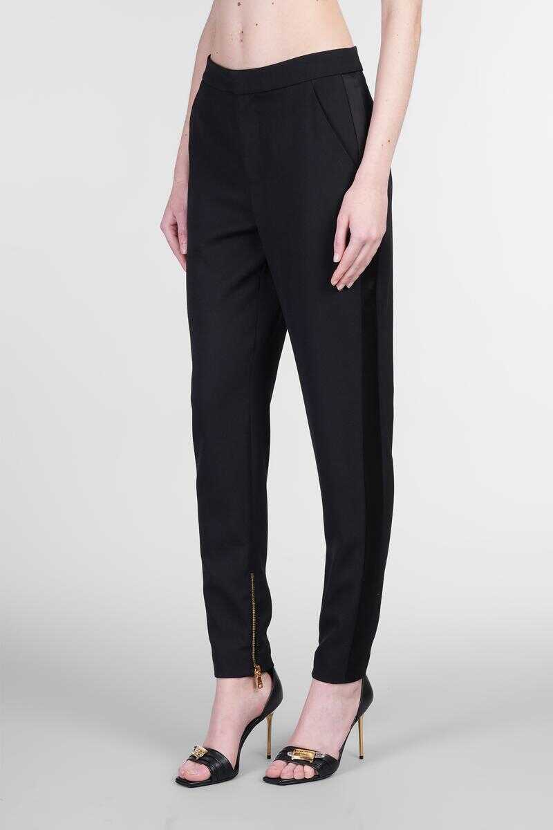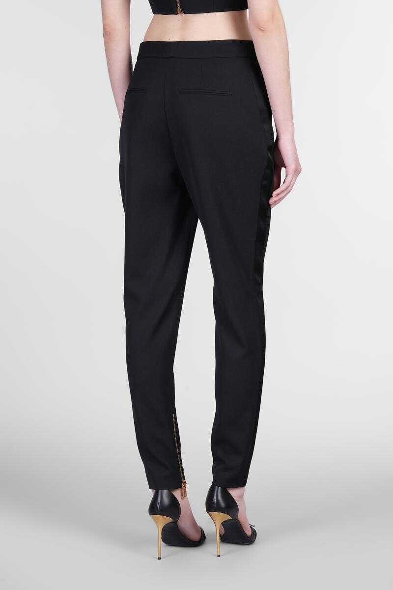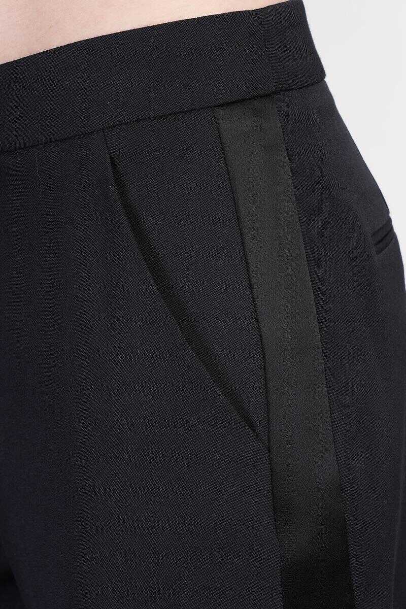 Pants in black wool, concealed front fastening, welt pockets, silk bands on side, zipped hems, gold hardware, 100% Virgin Wool, Made in Slovakia