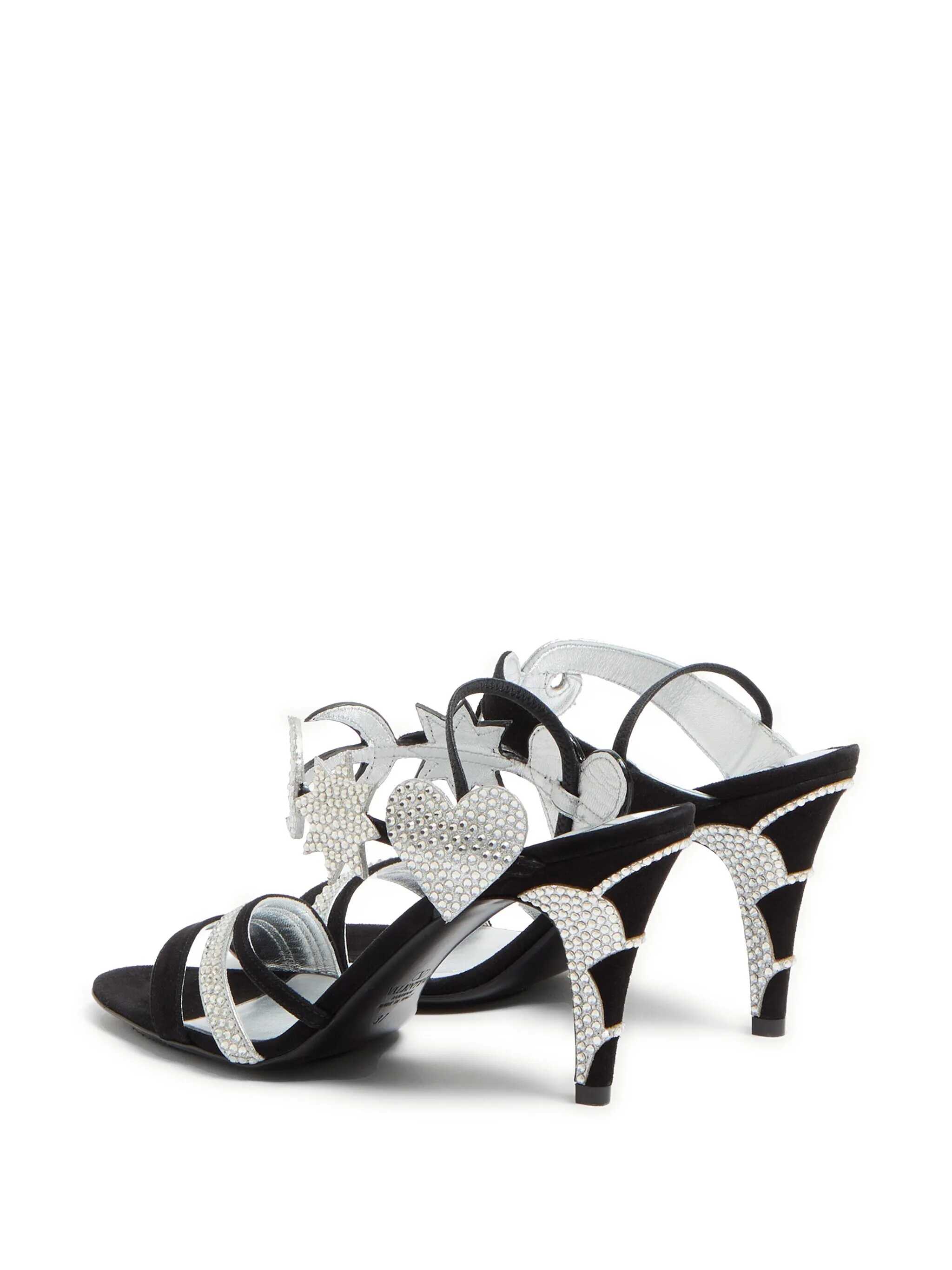 Valentino Garavani sandal made of black suede, adorned with various elements and shapes featuring crystal embellishments. It is characterized by an elasticated ankle strap, almond toe, leather lining, and leather sole. The design is completed by a covered heel detailed with crystals in a scalloped pattern.