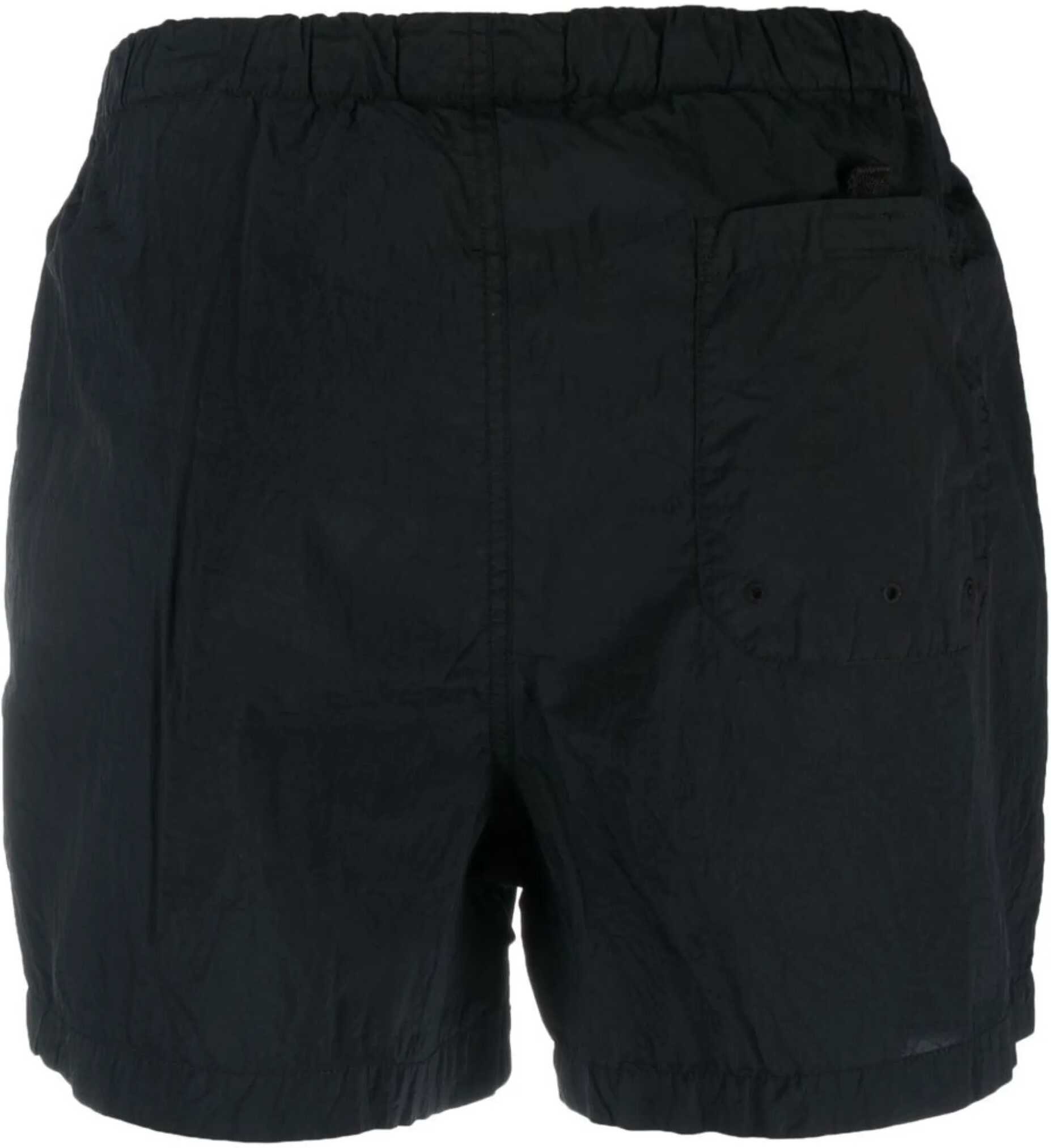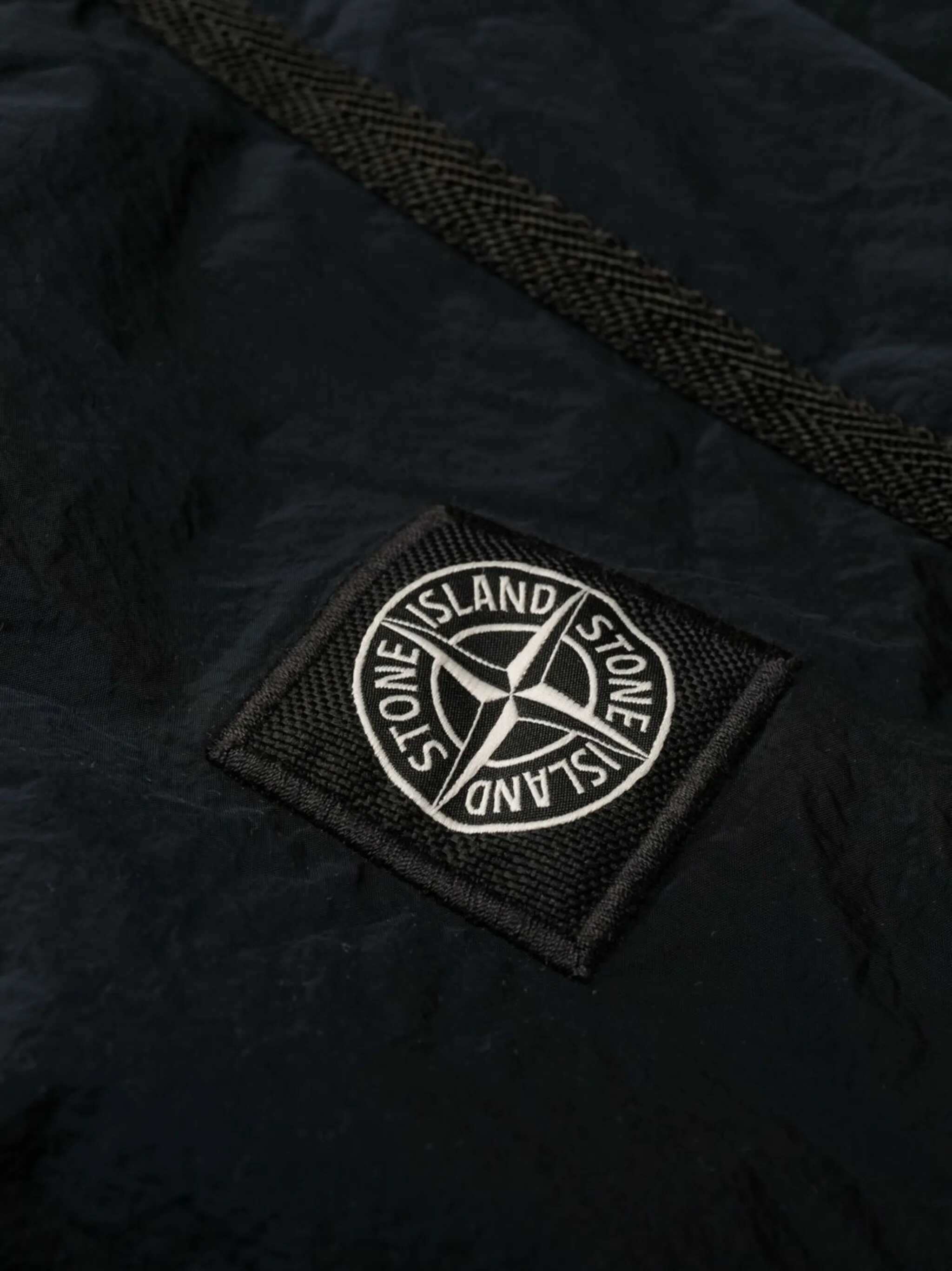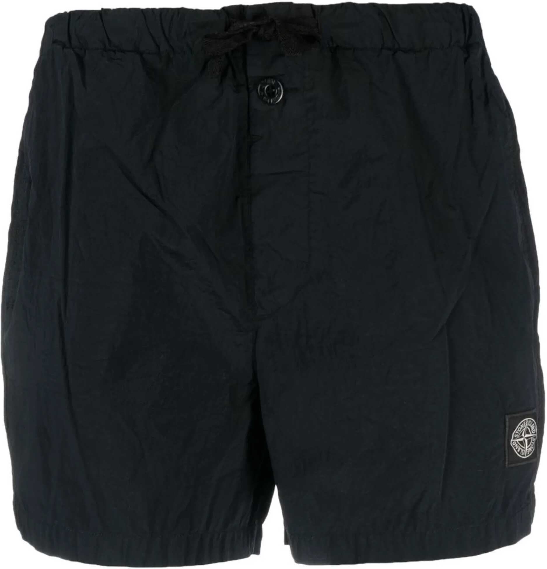 Short swim trunks in navy metal nylon with a mesh lining. They feature an elasticized waistband with drawstring, button closure, two side pockets, a Stone Island Compass patch on the left leg, a patch pocket on the back with Velcro closure, and fabric detailing on the sides. Slim fit.