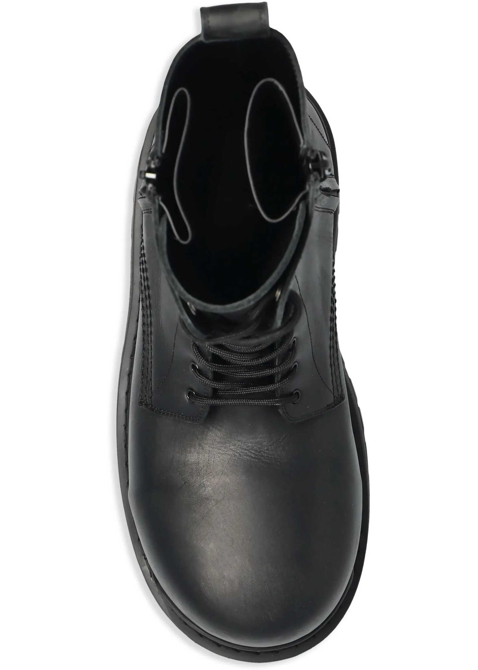 Giant boots in soft black calfskin leather with a worn effect. They feature an ultra-round toe, internal and external zip closures with bellows, a laced upper with twelve eyelets, a BB logo on the front of the sole, a heel tab, and a thick rubber treaded sole. Loose fit. Dust bag included. Any imperfections in the leather should not be considered manufacturing defects, but a characteristic of the material.