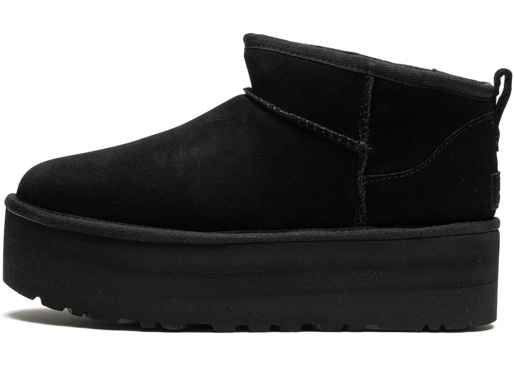 Ugg Classic Ultra Mini Platform in black suede with Uggplush wool blend lining. Sugarsole platform sole. Rear loop tab and Ugg label. Any leather imperfections are not to be considered manufacturing defects, but a peculiarity of the material.