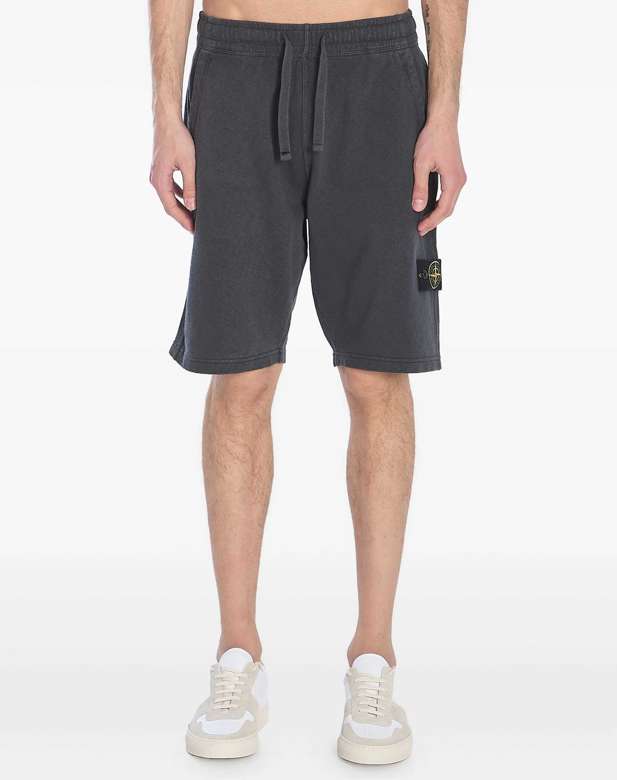 Dark grey délavé cotton fleece bermuda shorts. They feature an elasticated waistband with drawstring, two side pockets, Stone Island patch on the left leg, and two back pockets with snap buttons and engraved logo.