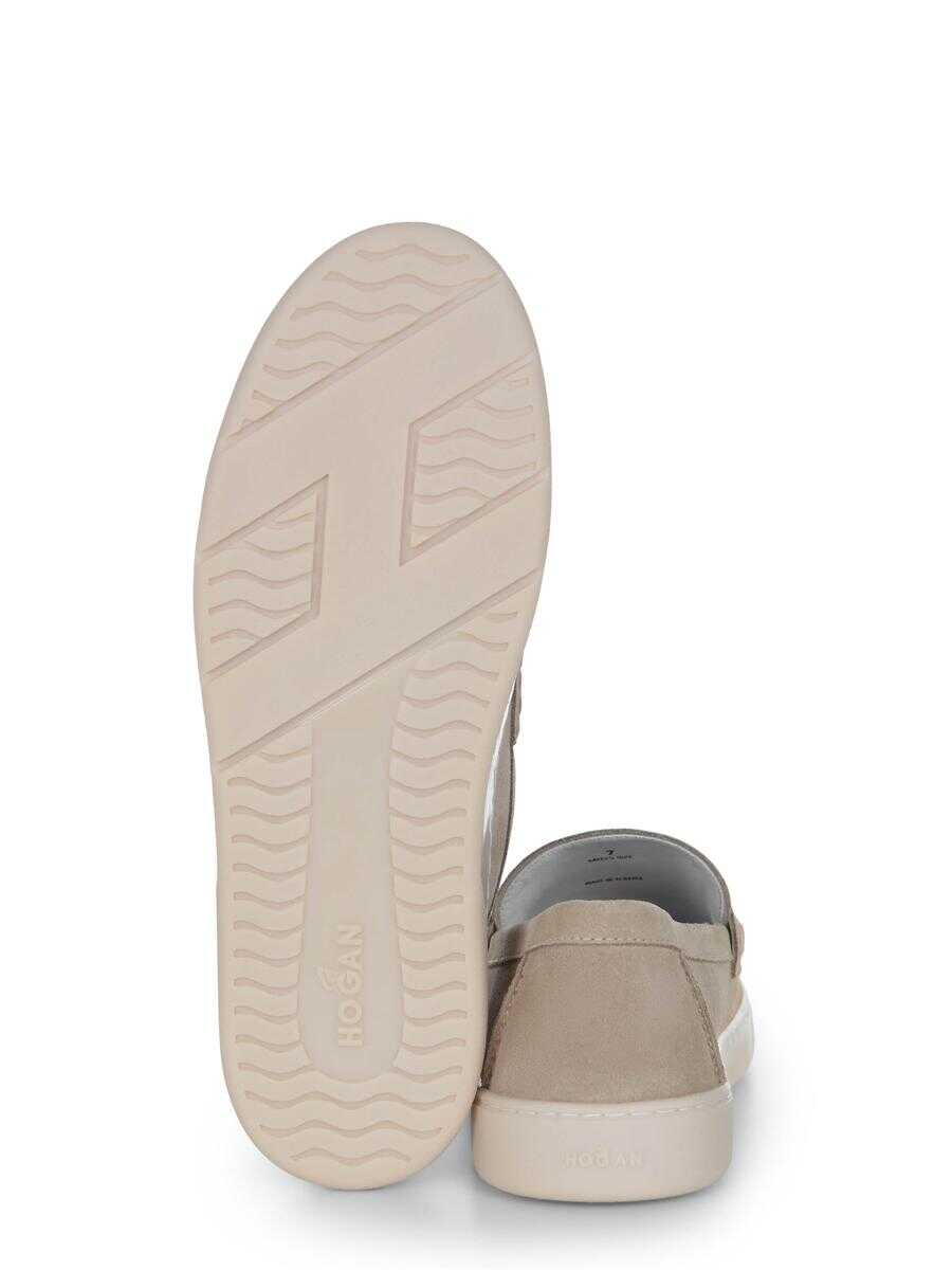 Hogan moccasins made of suede leather in Sand color. Front mask. Logoed memory foam insole. Rubber sole.