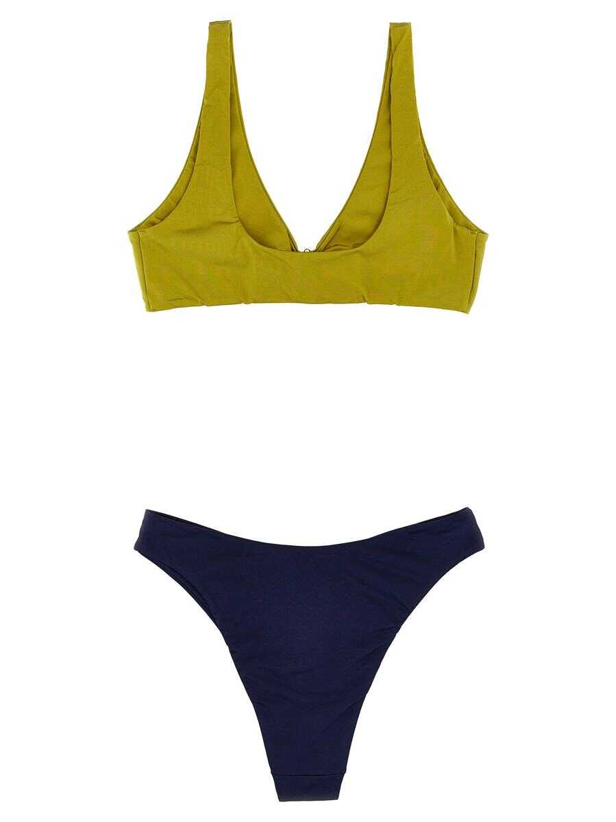 Two-tone Lycra bikini, consisting of top with glossy finish and front curl with removable metal detail and briefs with matte finish and front curl