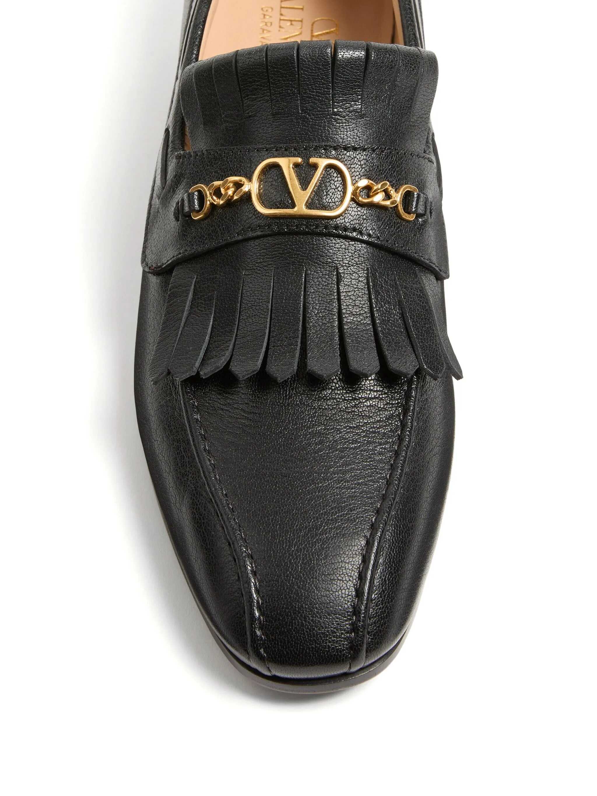 Valentino Garavani loafers made of black grained leather with fringes and an antiqued gold-tone VLogo Signature metal detail. Featuring a round toe, leather lining, and a leather sole.