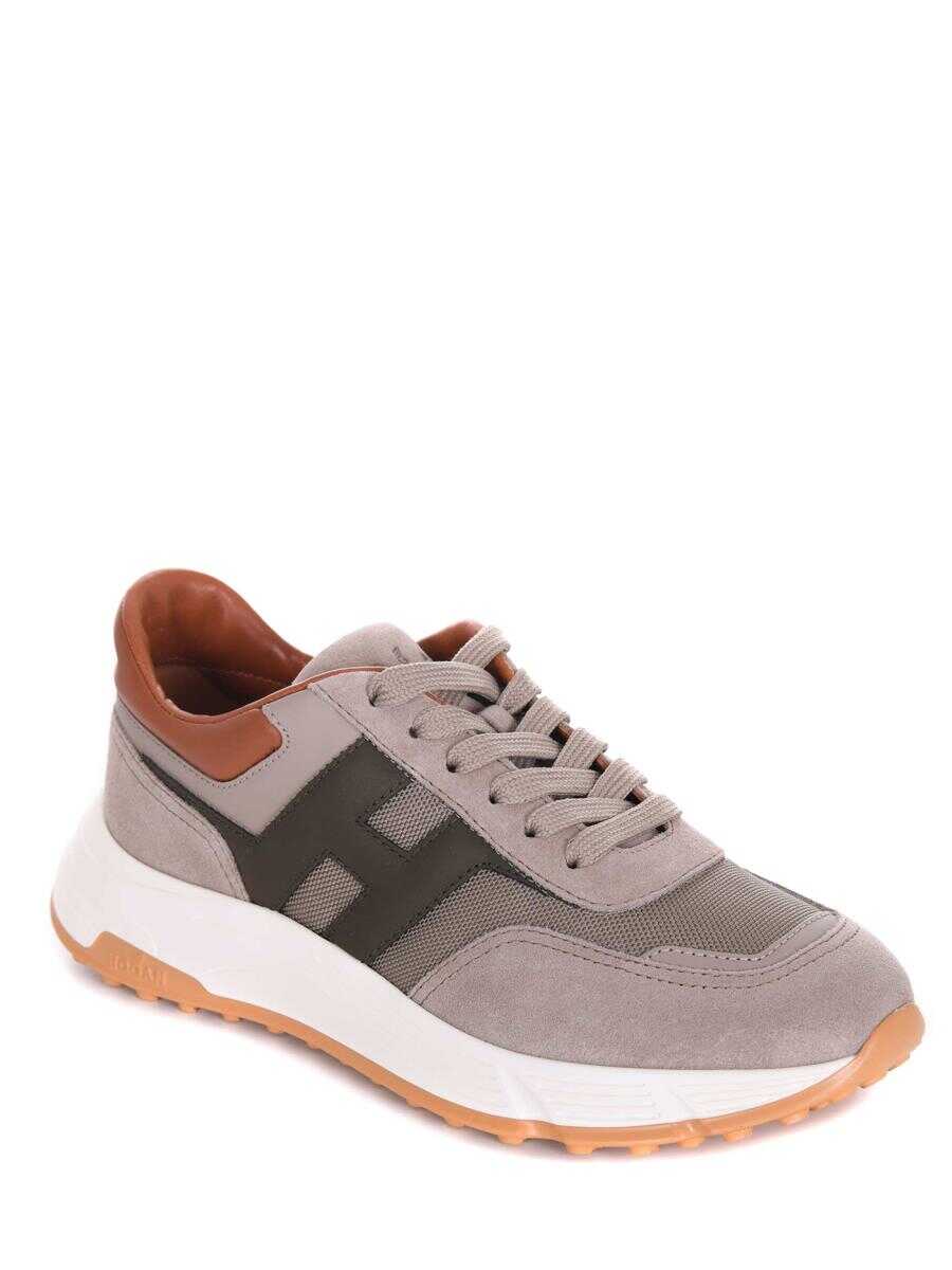Hogan sneakers in leather and nylon Beige/Brown. Lace-ups. Tone-on-tone "Hogan" lettering on the tongue. H on the side in leather. Details in technical fabric. Footbed in 8mm memory foam. White rubber sole. Size in photo 6
