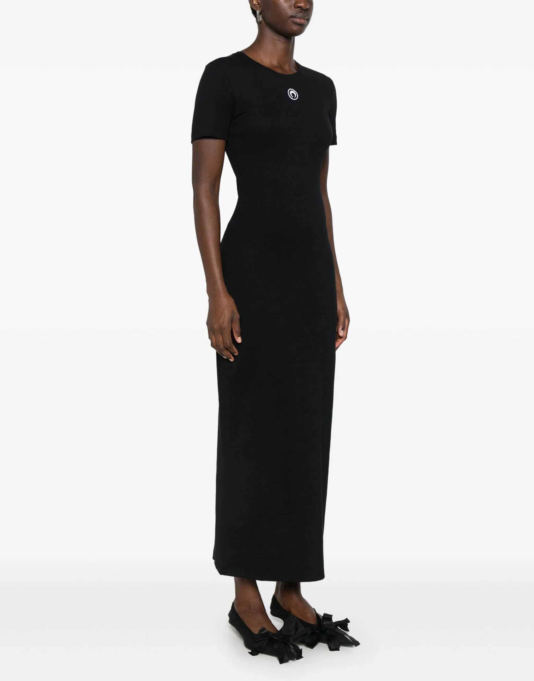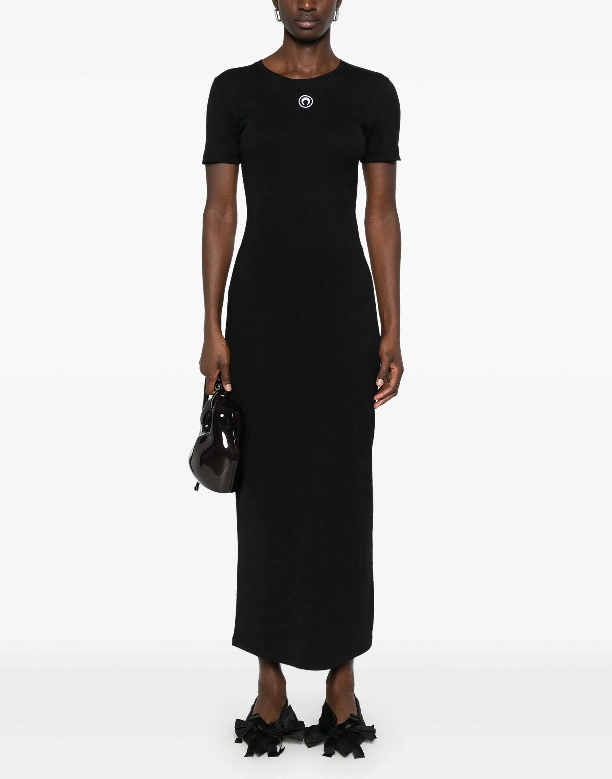 Long black ribbed stretch cotton dress with short sleeves, a white embroidered Moon logo on the chest and a Marine Serre label on the back of the neck. Ribbed crew neckline.