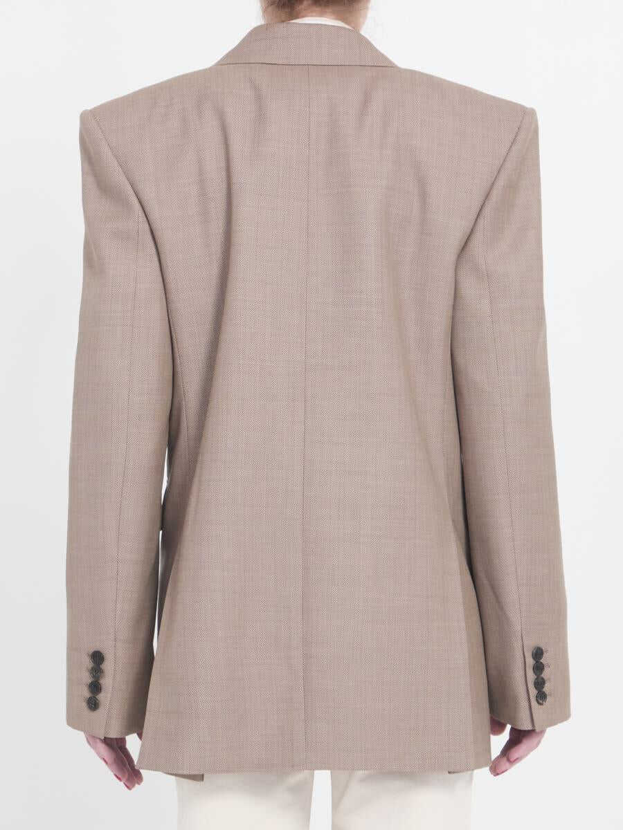 Double-breasted jacket in beige caviar-patterned wool. It features a double-breasted button closure, peak lapels, one welt chest pocket, two front flap welt pockets, padded shoulders, buttoned cuffs, and a double back vent.