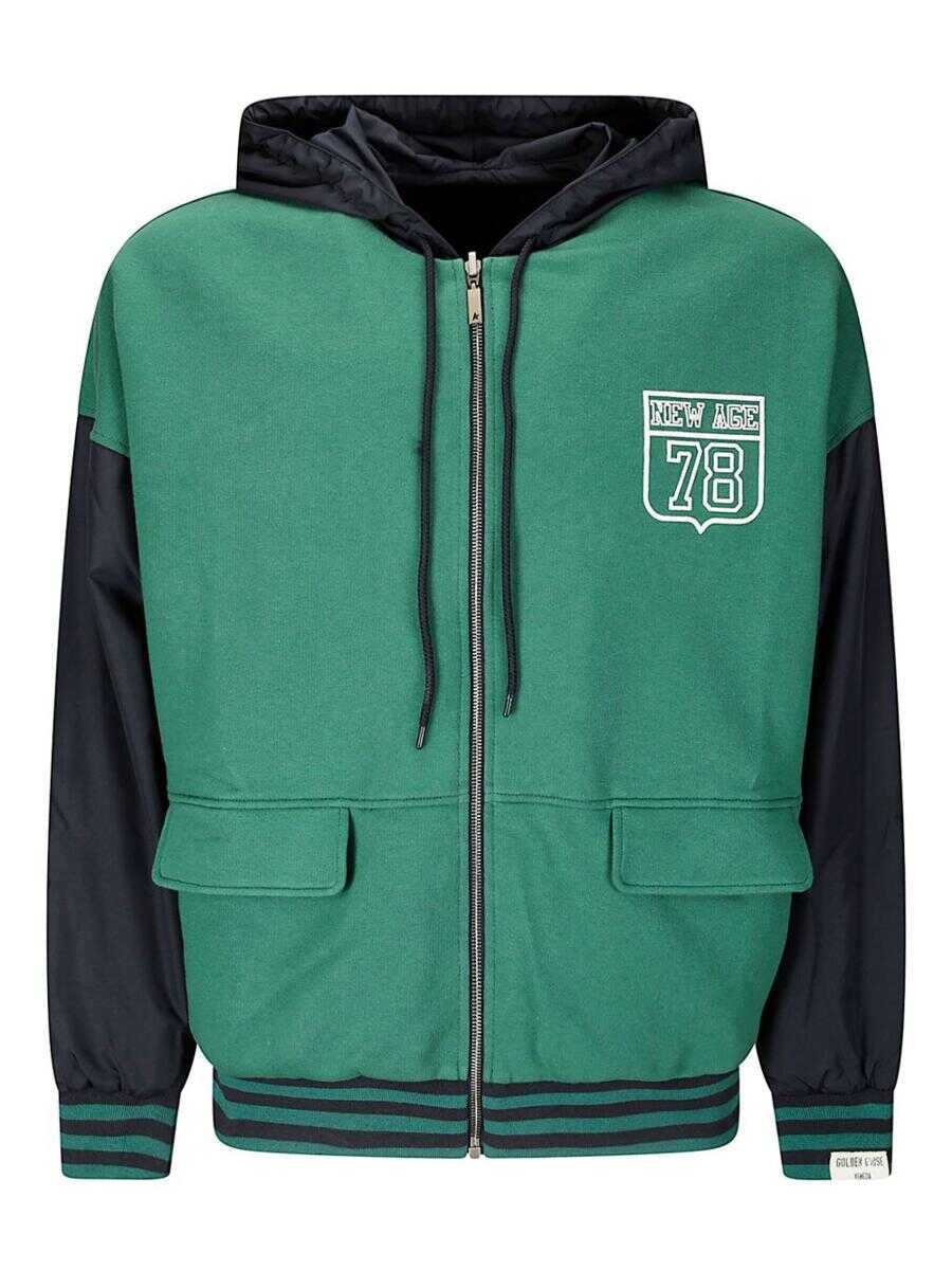 forest green front zip fastening two side flap pockets stripe trim slouchy drawstring hood