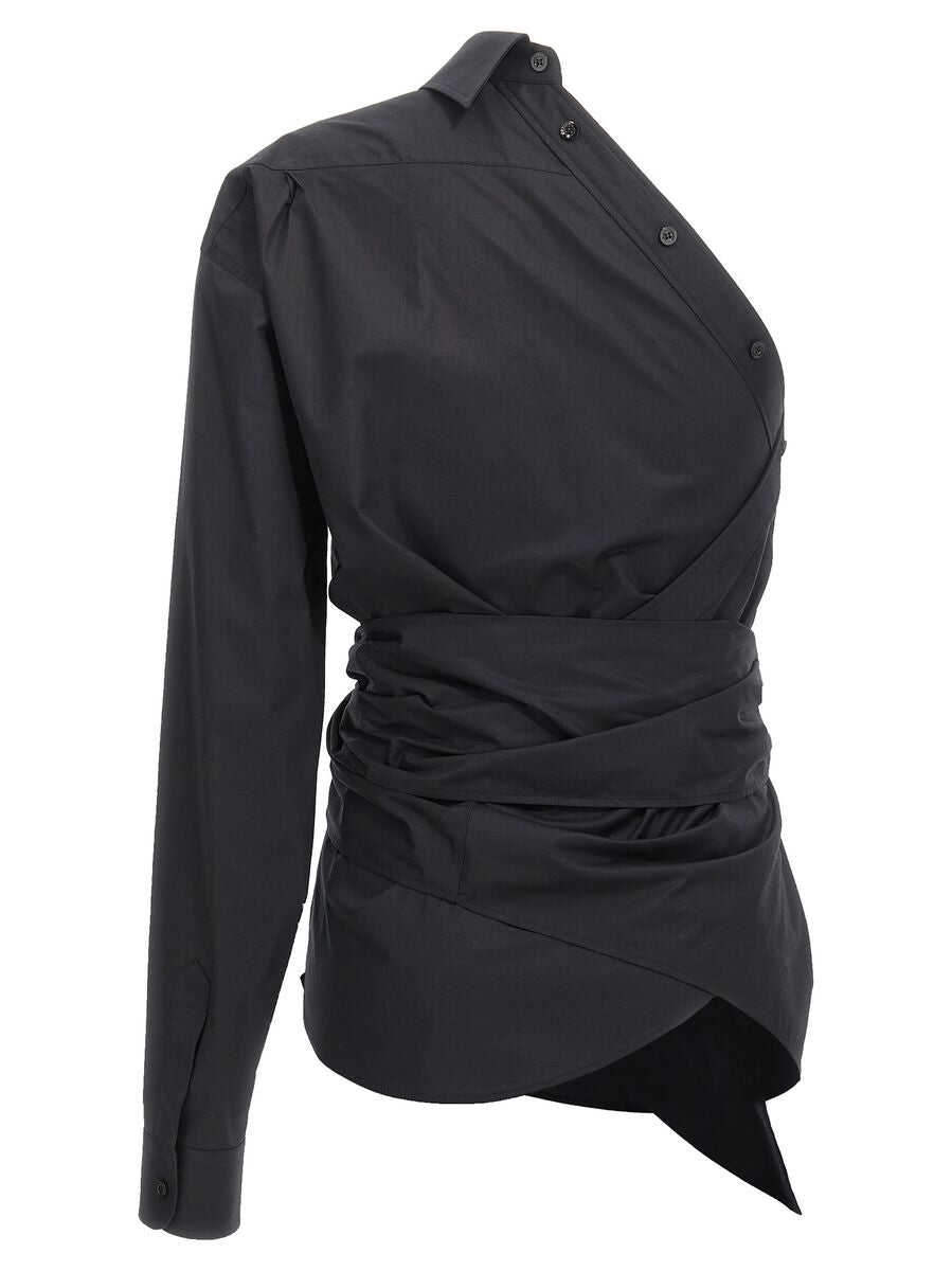 One-shoulder shirt in cotton poplin asymmetric, tailored details, sash knotted at the waist