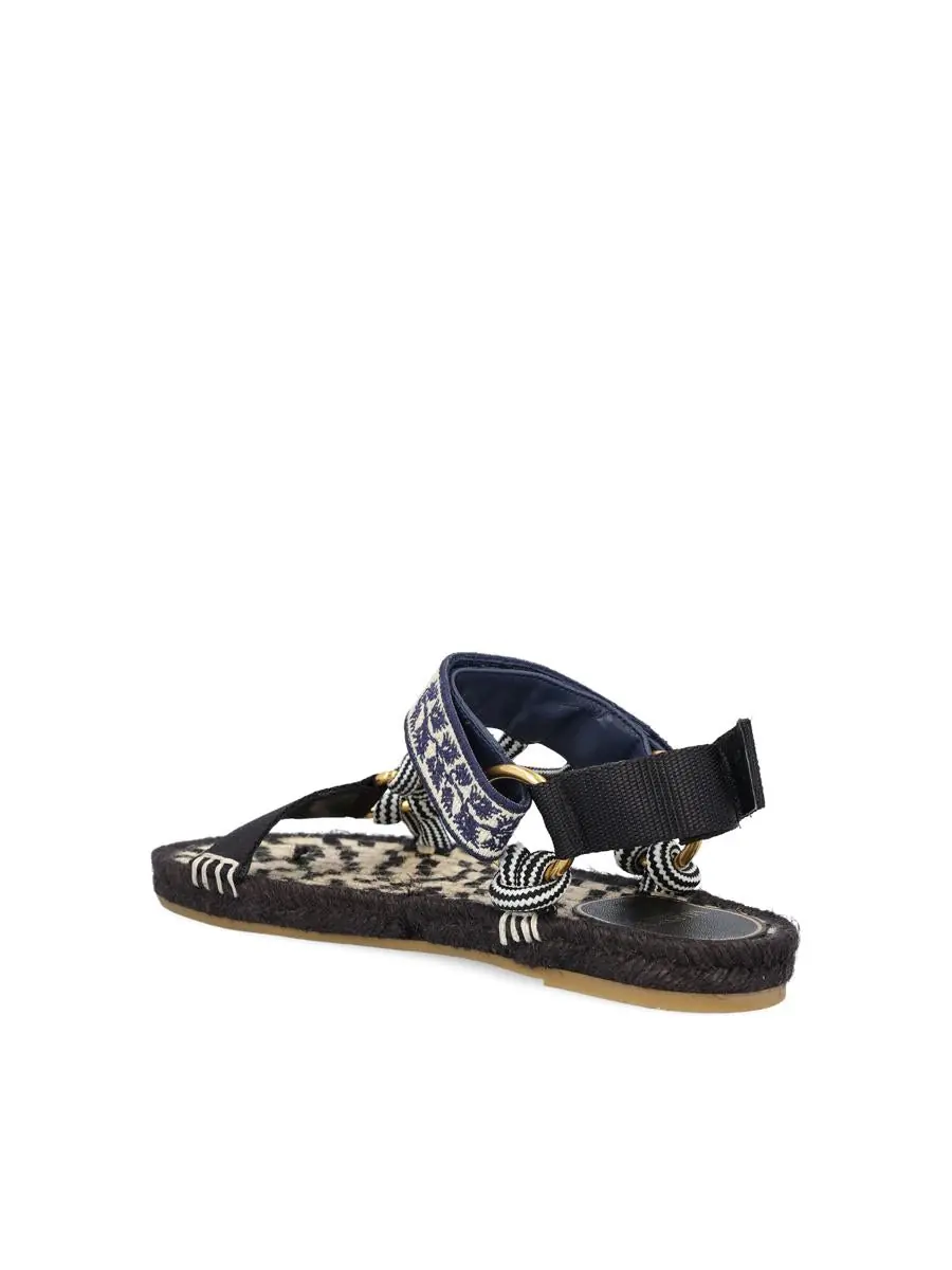 Valentino Garavani's Lake Powell sandal, made of cotton ribbon embroidered with a Grape motif, combines craftsmanship and contemporary design. With iconic details such as the Signature VLogo and a rope and rubber sole, it is a distinctive accessory for summer. - Upper: Embroidered cotton ribbon, nylon, and rope - Color: multicolor/black - Sole: rope base and rubber sole - Heel Height: 20 mm - Signature VLogo detail in brass with antique-effect finish, the iconic symbol of the Maison - Adjustable straps with Velcro, offering a personalized and comfortable fit - Versatile and contemporary design - Made in Italy - Box included - Item code: 6W0S0LZ5PNBN96