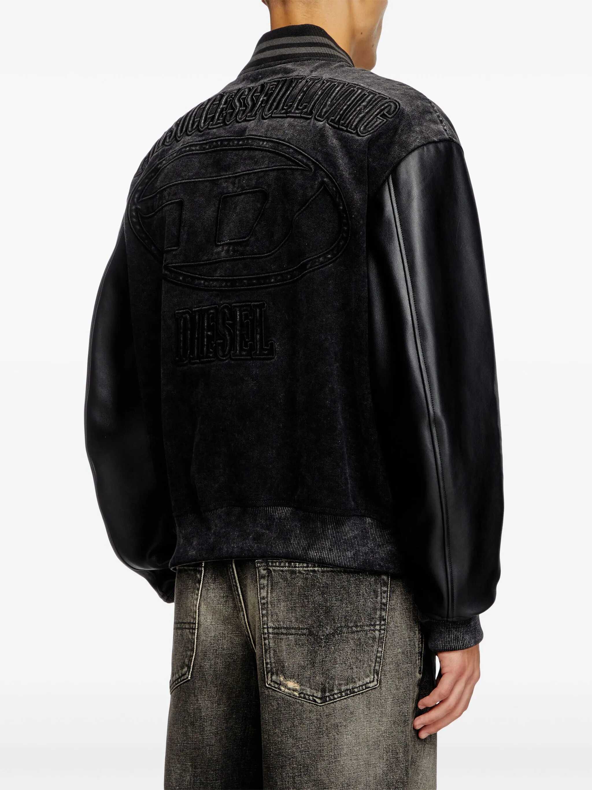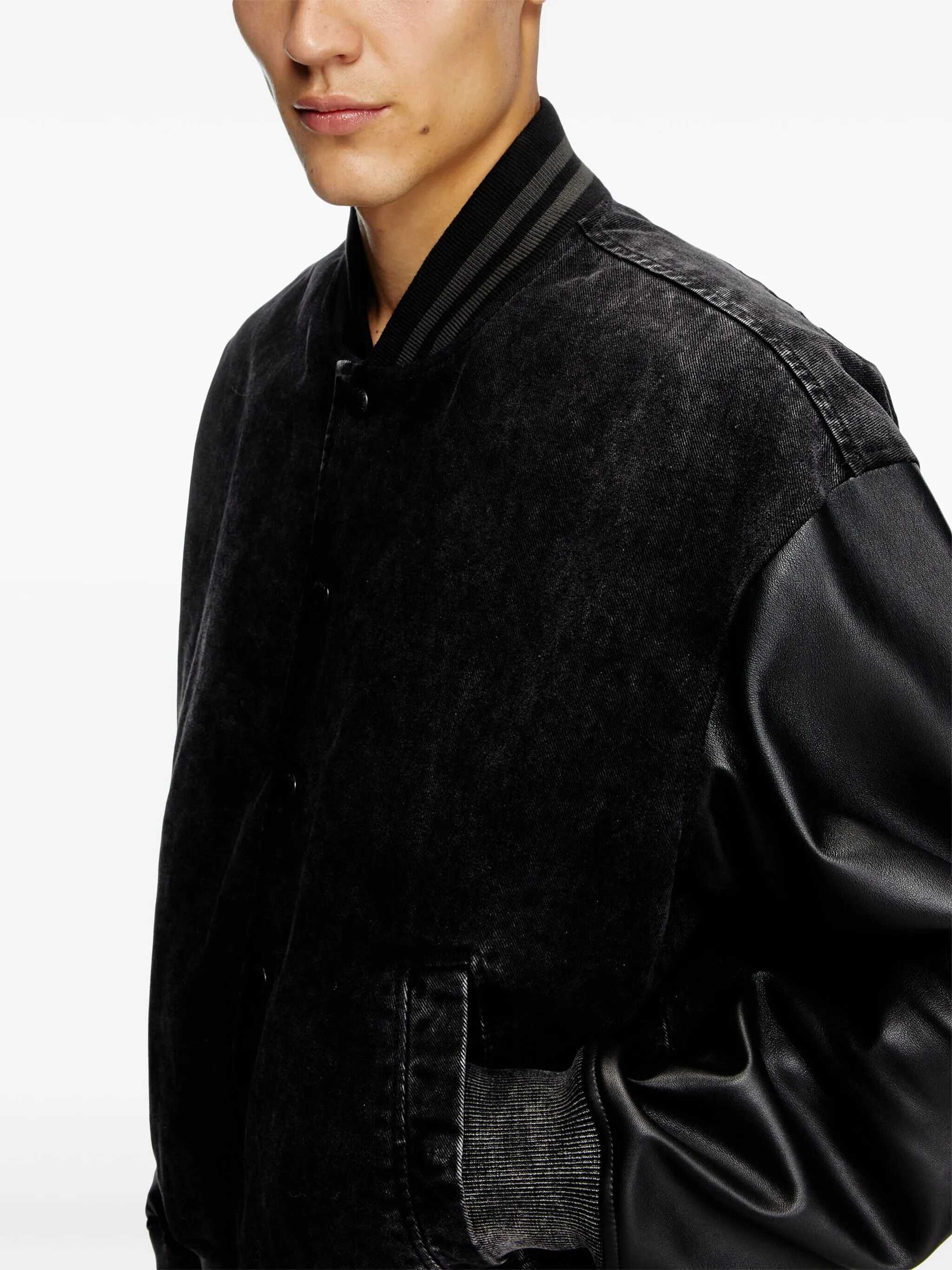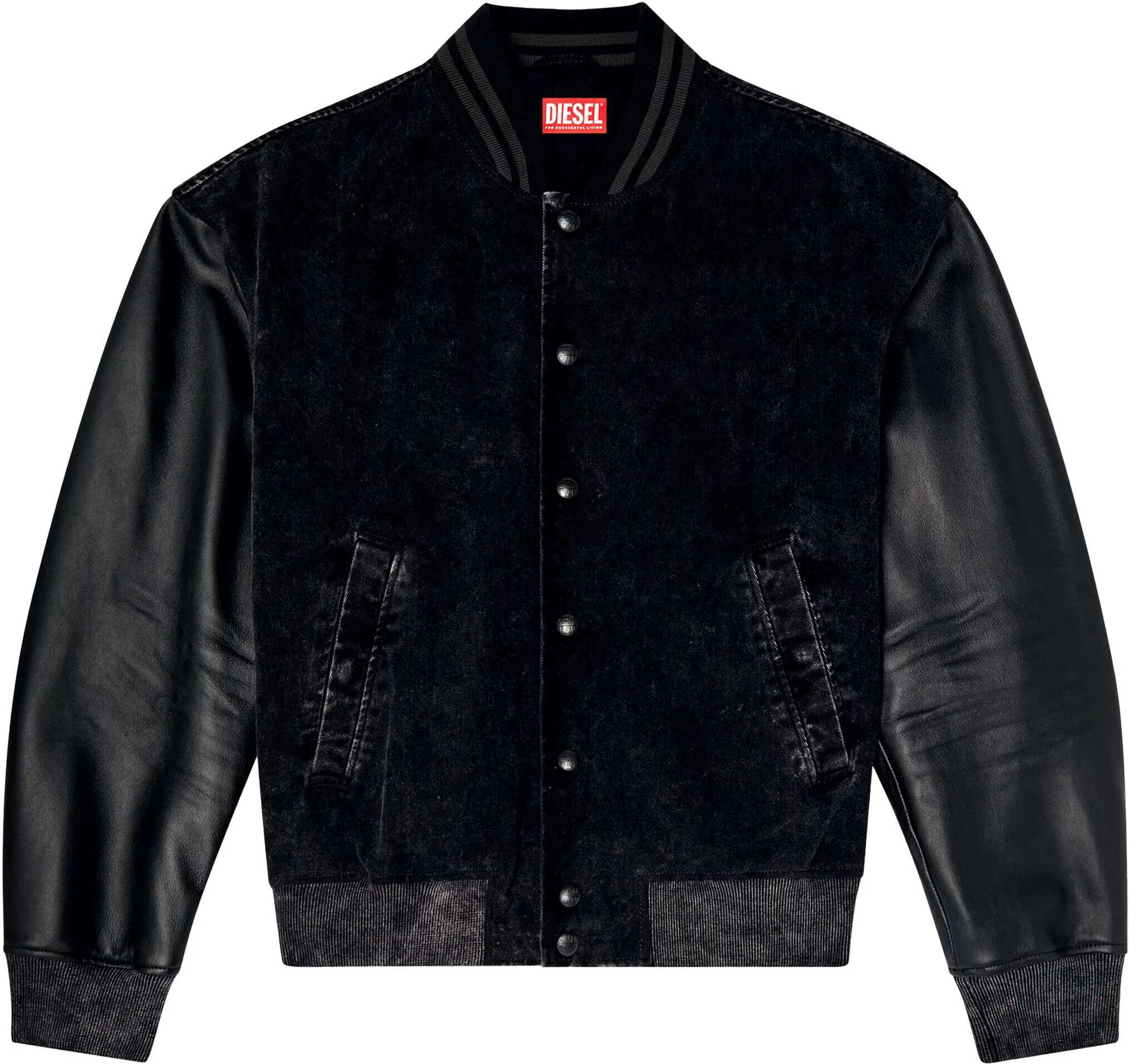 Diesel's L-Nyn Bomber Jacket combines the punchy character of denim with the elegance of tonal leather sleeves. Lined for a more comfortable fit, it features a snap-button front closure for a practical, bold look. Two side welt pockets add functionality, while ribbed cuffs and hem ensure a structured silhouette. On the back, the embroidered Oval D maxi gives a distinctive and iconic touch. A perfect garment for urban and contemporary outfits.