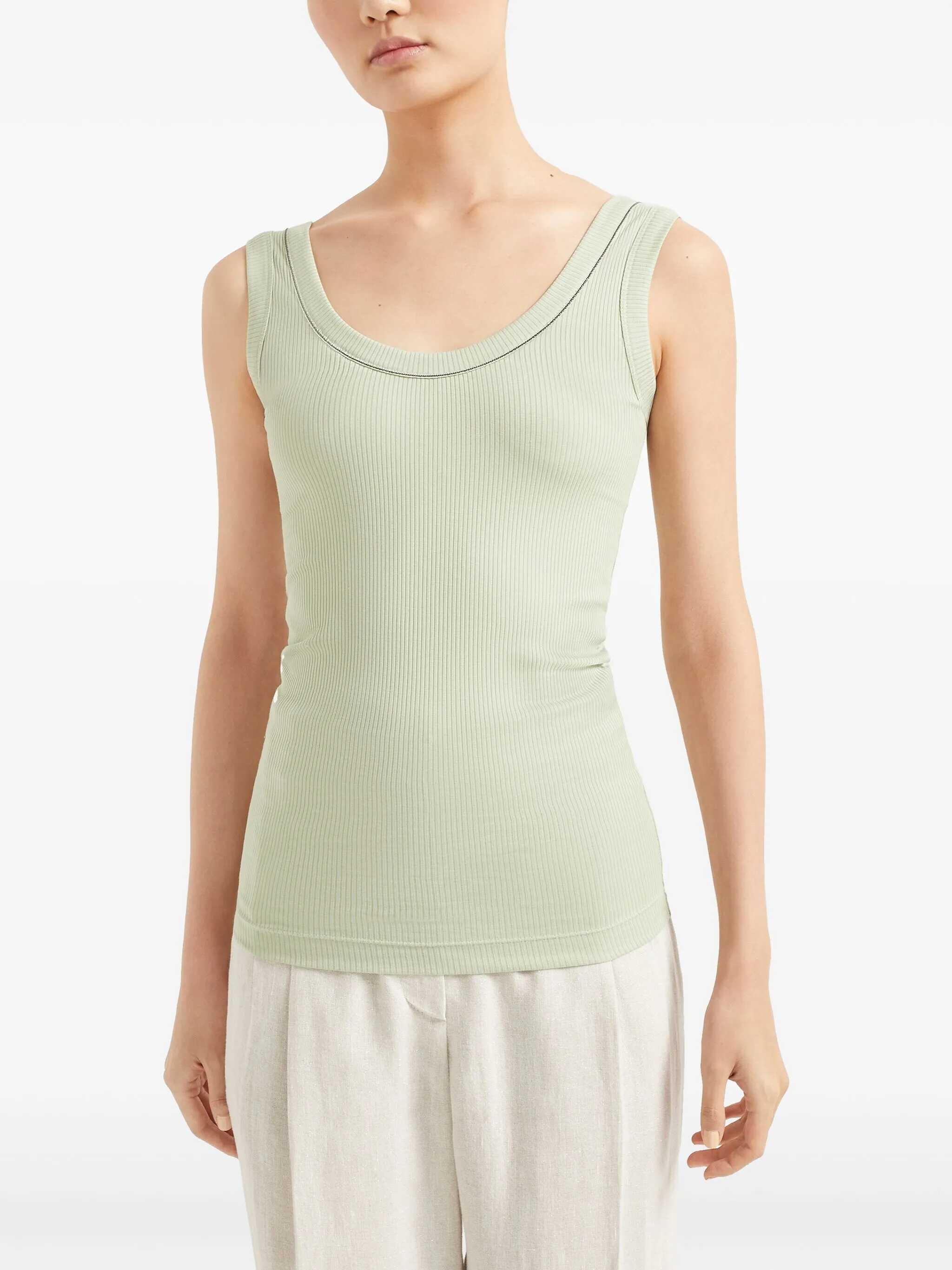 Brunello Cucinelli's ribbed cotton Top features a front and back neckline, adding a touch of understated elegance. The distinctive ribbing emphasizes the model's silhouette, giving it a fitted and feminine fit. The iconic embroidery in thin rows of bright monile completes the garment with a delicate note of light, making it perfect for a sophisticated and refined look.
