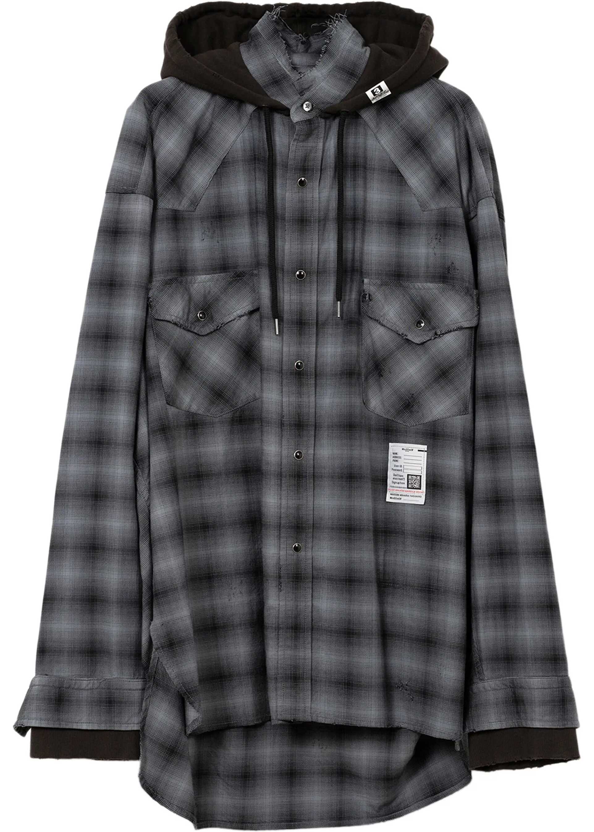 Cotton Shirt by Maison Mihara Yasuhiro with a strong character and vintage style. Model with a drawstring-adjustable hood and front snap-button closure. It features two welt flap patch pockets on the front and elastic ribbed cuffs for added comfort. The worn-effect design with check pattern and iconic monogram patch appliqué on the front lends an authentic, gritty aesthetic. The oversized fit completes the look with a contemporary streetwear touch.