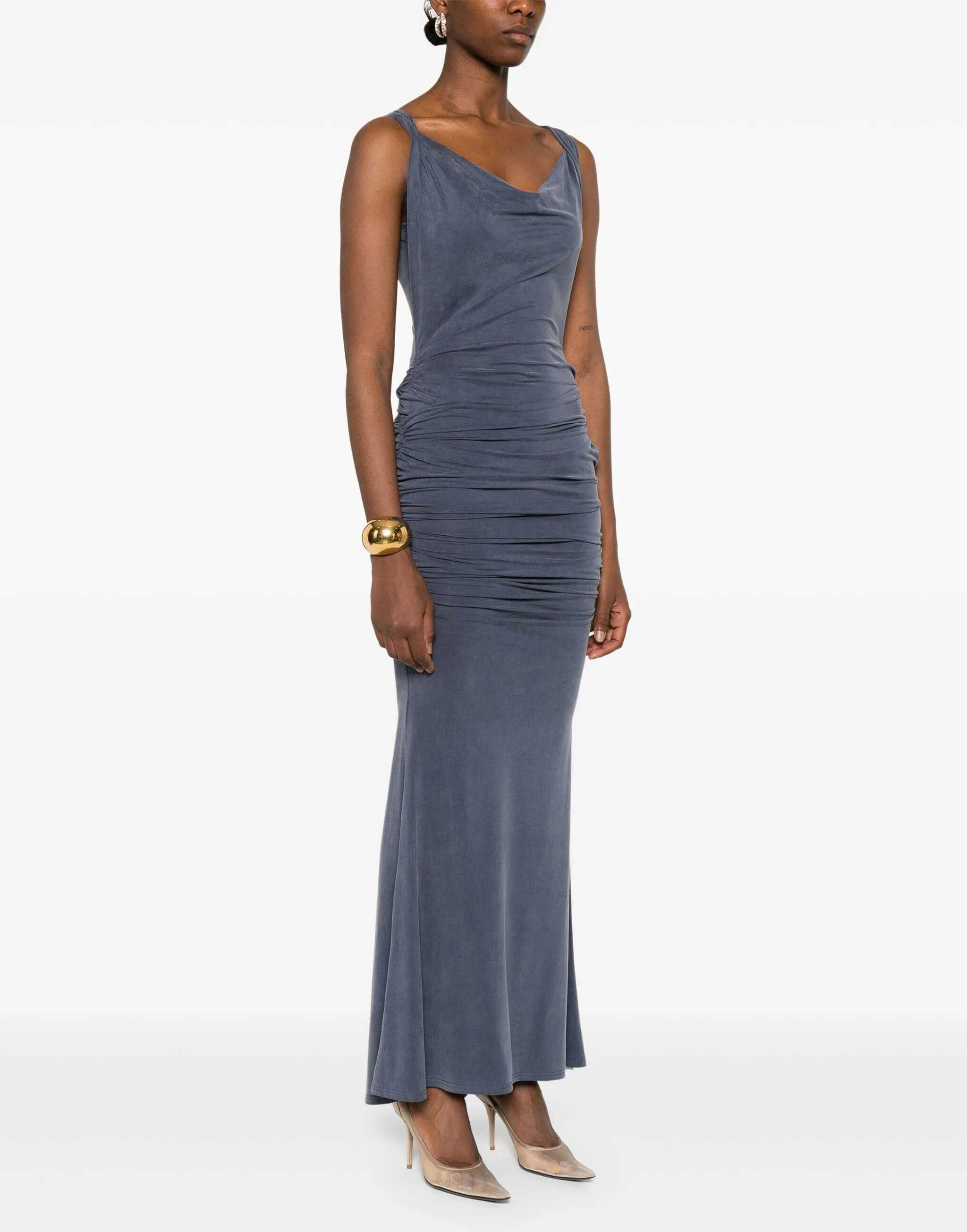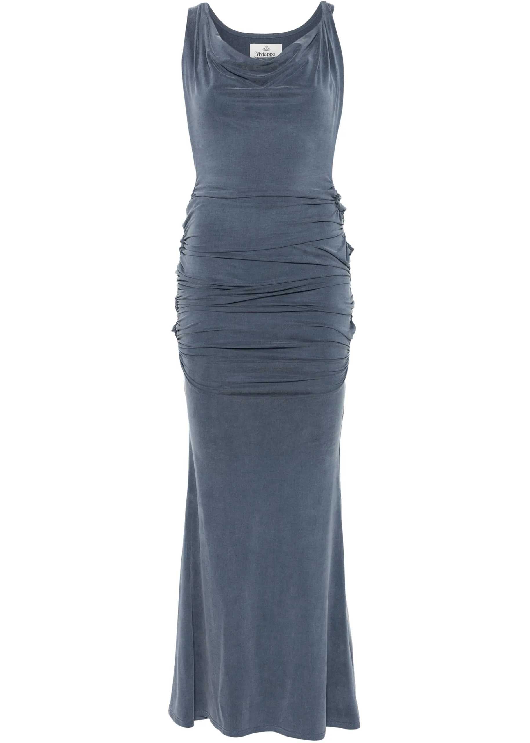 Vivienne Westwood's Liz Long Dress is an elegant and sensual garment with a sleeveless, draped pattern that hugs the form in a highly sophisticated way. Drapes create a fluid, enveloping effect, accentuating the silhouette in a refined way. The cowl neckline adds a distinctive and modern touch, making the dress perfect for special occasions that call for a bold and elegant look.