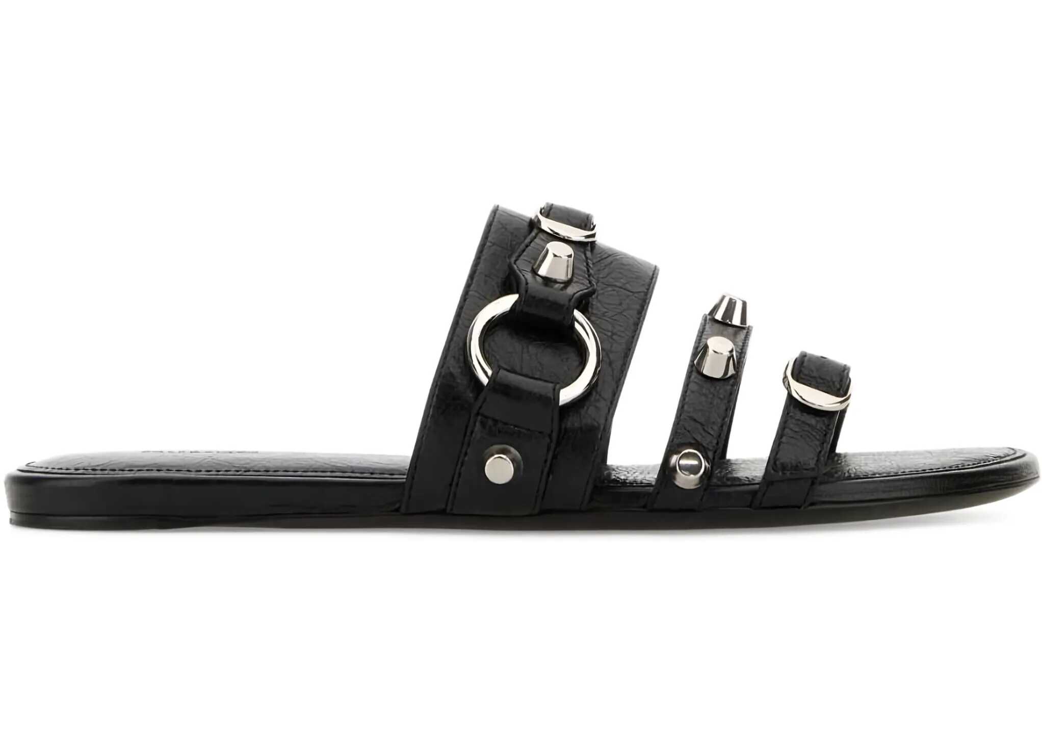 Balenciaga's studded Sandals combine a bold and sophisticated design. A slip-on model with a flat sole, they feature three front straps decorated with silver studs and rings, giving them a modern, rock look. These sandals are ideal for adding a touch of character and style to a summer outfit without sacrificing comfort.