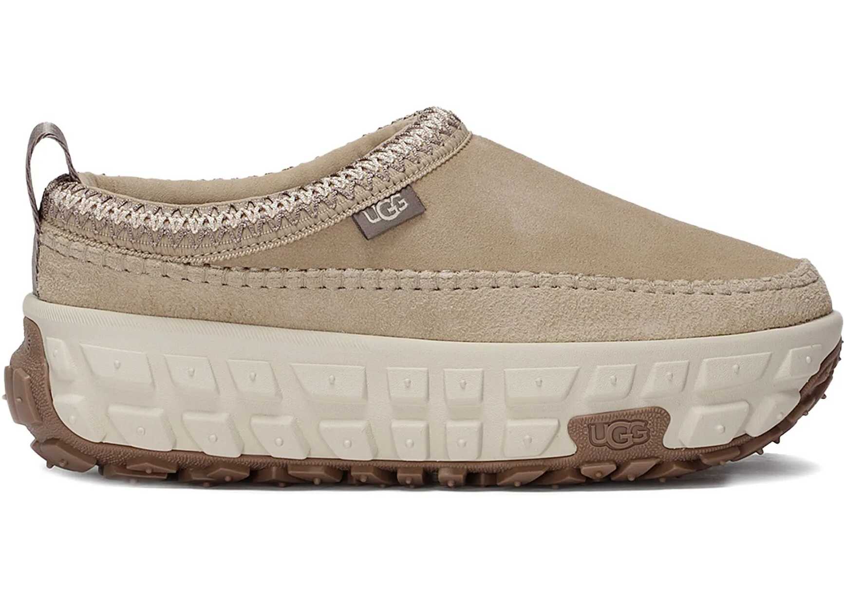 UGG's leather Venture Daze Mules are a bold and comfortable proposition for those seeking a distinctive design. The textured platform sole made of karram-effect rubber offers a snug fit, while the round toe and suede design add a touch of casual sophistication. Multicolored and contrasting all-over stitching lends a vibrant accent, while the brand's iconic monogram embroidered on the side panel provides a luxurious detail. The slip-on style, combined with the nylon pull-on, makes for an easy fit, combining practicality and style. Perfect for those looking for a pair of sabots with a modern and functional design.