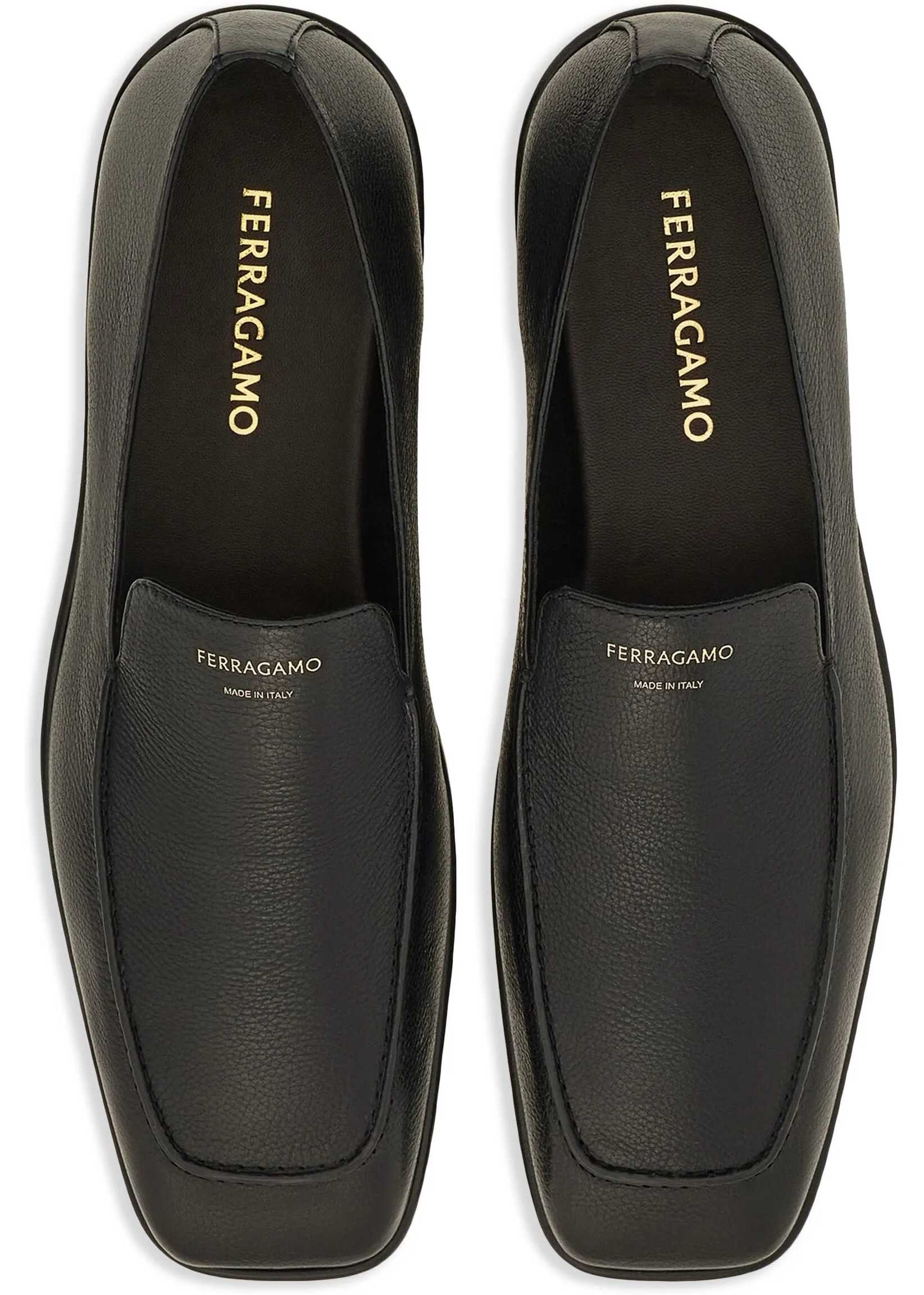 Ferragamo's hammered leather Loafers are an elegant example of sophistication and comfort. The unstructured square-toe design lends a modern and refined look, while the gold logo on the instep adds a distinctive and luxurious touch. The leather block heel provides stability and comfort, while the logoed insole further enhances the Ferragamo-branded design.