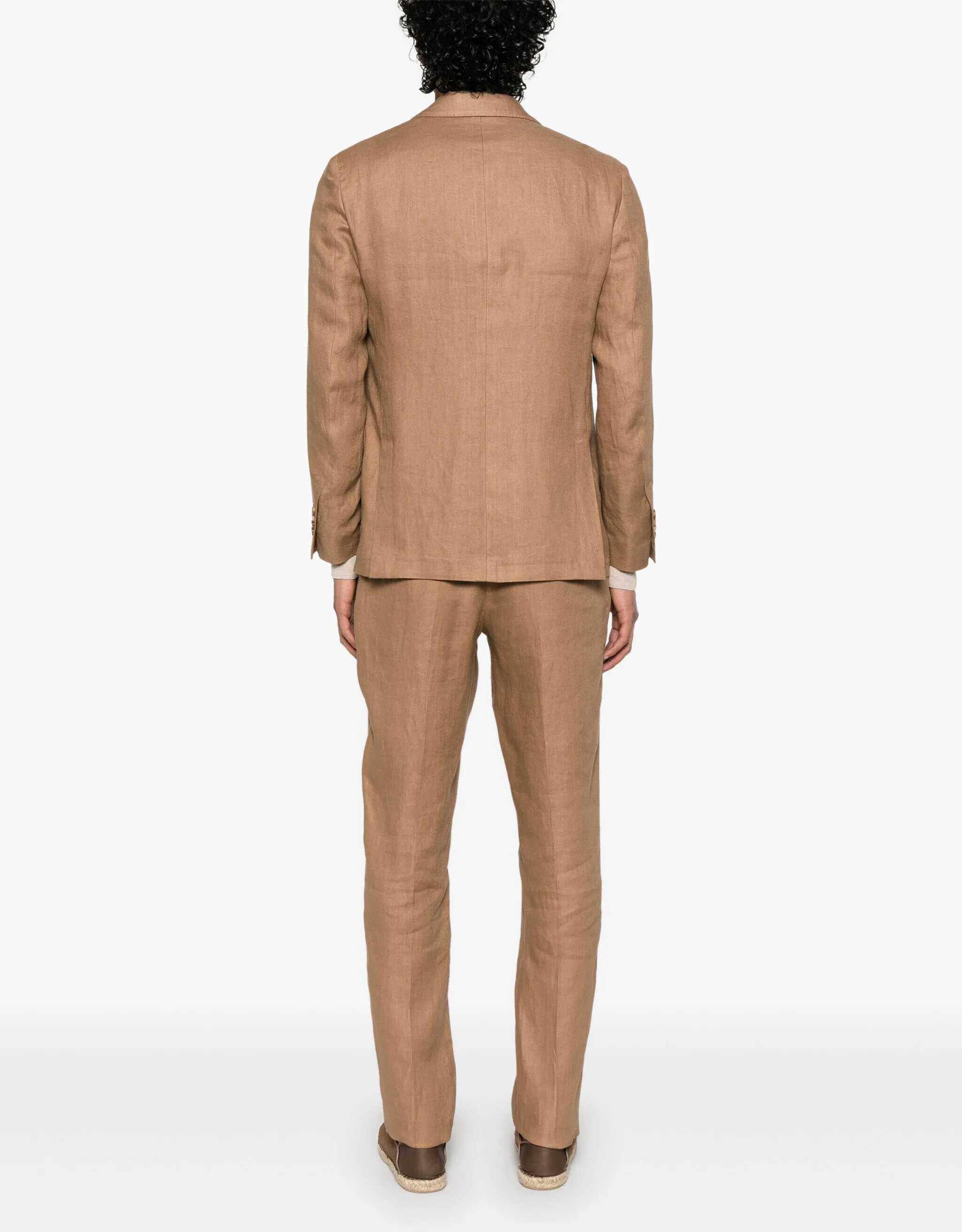 Lardini's single-breasted linen Suit embodies contemporary sartorial elegance with a touch of lightness and sophistication. The jacket, with button closure and peaked lapels, features a versatile and balanced silhouette, enhanced by two slits at the back for added comfort. Patch pockets on the front and a breast pocket add functionality without sacrificing style, while the iconic flower brooch on the lapel sign the garment with a distinctive detail. Featuring side welt pockets and a zipper and button closure, the straight pants ensure a clean, modern fit. Waist loops allow for customization of the fit, making the suit perfect for those who want a sleek, cool and sophisticated look.