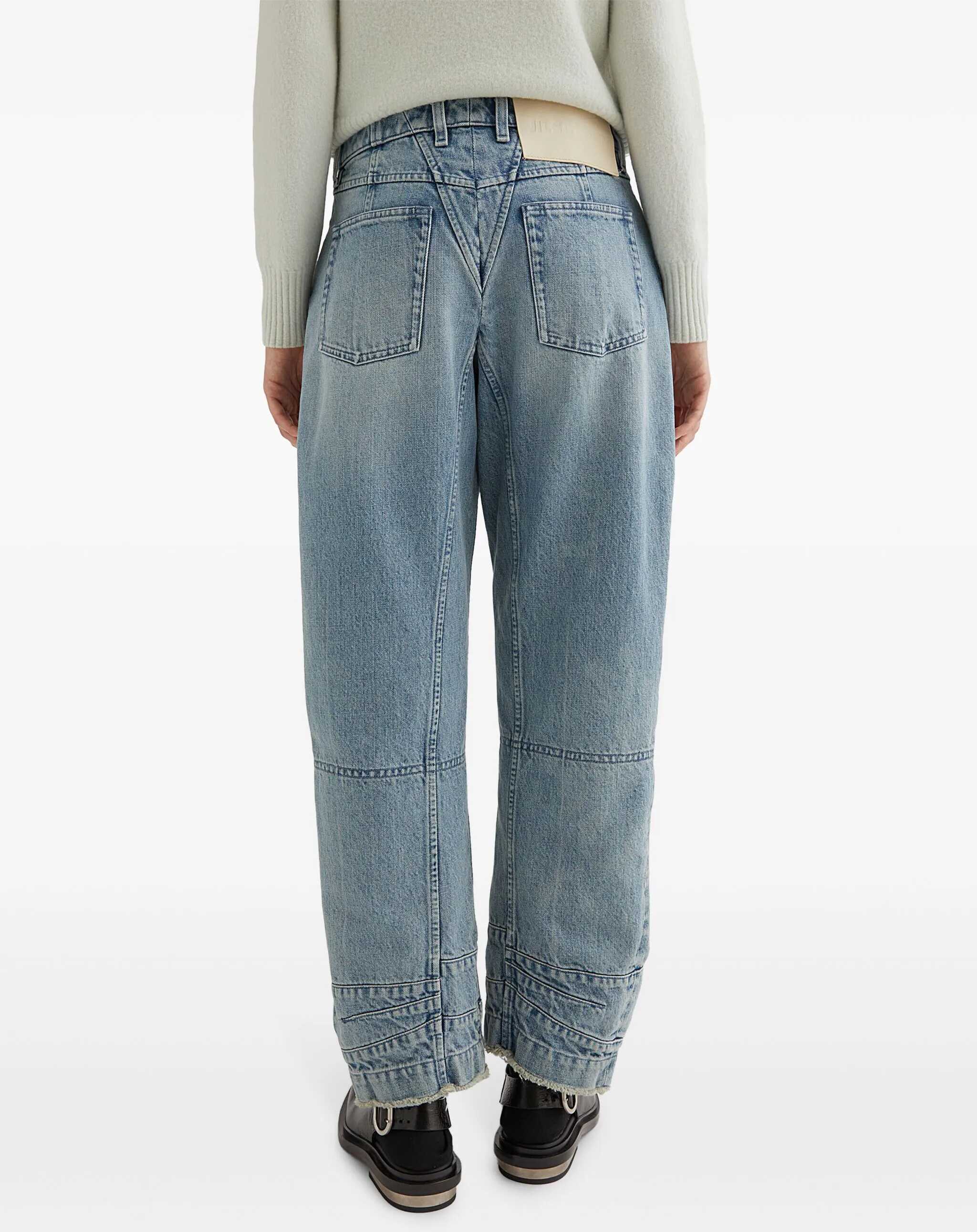 Jil Sander's cotton Jeans feature a structured design that gives the garment a modern, defined silhouette. Seams on the lower leg add a distinctive detail, enhancing the five-pocket style. The mid-rise waist and front button closure offer a classic fit, while belt loops at the waistband allow for further adjustment. The brand's iconic signature leather pressure-printed patch on the back adds a touch of understated luxury, completing the sophisticated, contemporary look.