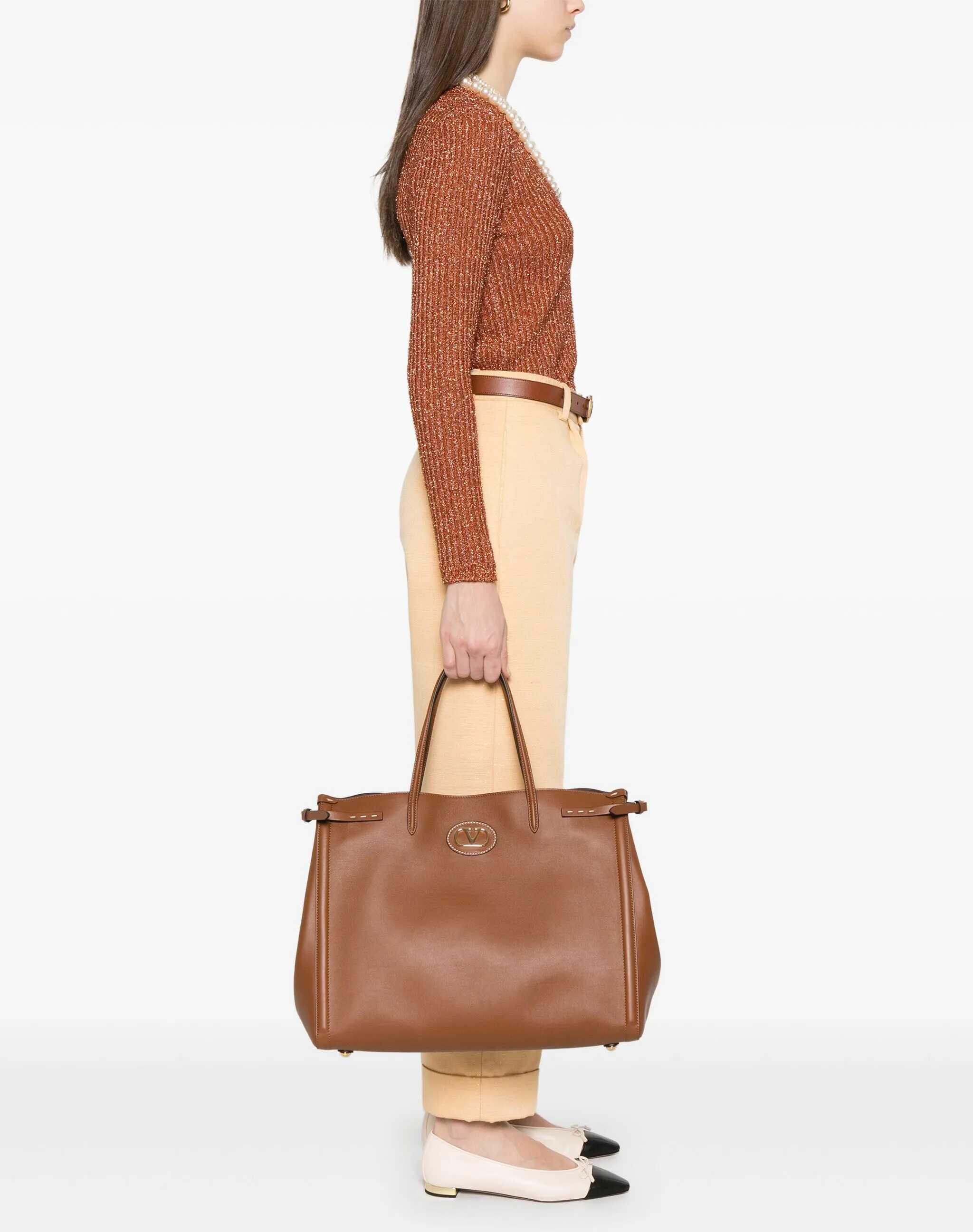 The Valentino Garavani Large Antibes Tote Bag is a sophisticated and versatile accessory. Made of high-quality leather, it features a leather patch with the Signature VLogo metallic element, which adds a distinctive touch. Double handles and metallic parts with a gold finish enhance the elegance of the design, while the magnetic closure provides practicality. Inside, a flat zippered pocket offers more organization, and adjustable buckles on the sides allow you to change the capacity of the bag. Protective feet on the bottom complete the look, making this bag ideal for any occasion.