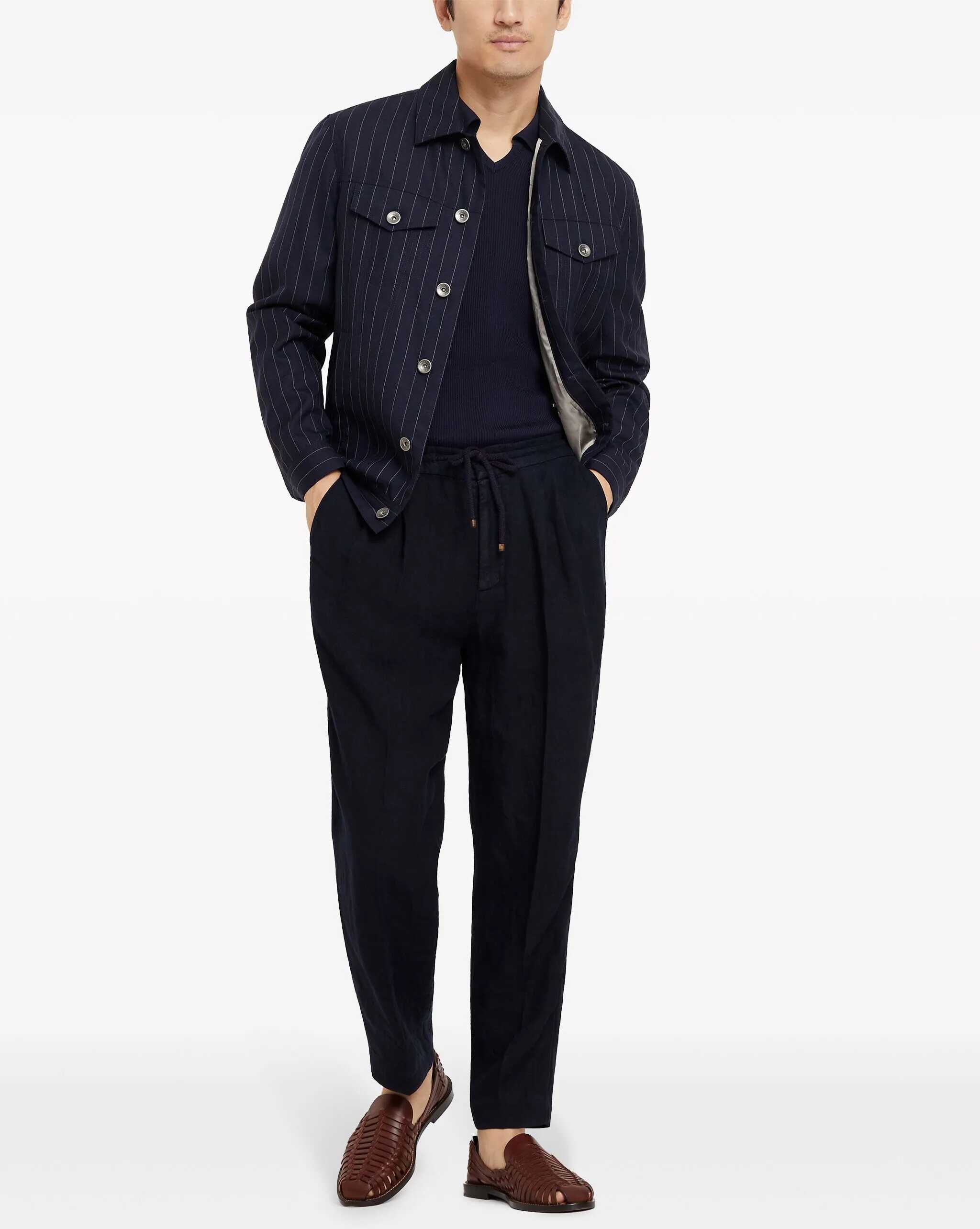 Brunello Cucinelli's linen Pants feature a drawstring-adjustable elastic waistband for a perfect fit around the waist. The front closure has a zipper and hook-and-eye closure for a clean, sophisticated look. Side welt pockets and back slit pockets add practicality and a touch of understated elegance. The monochrome design makes the garment versatile and easy to match, while the regular fit offers comfort and freedom of movement.