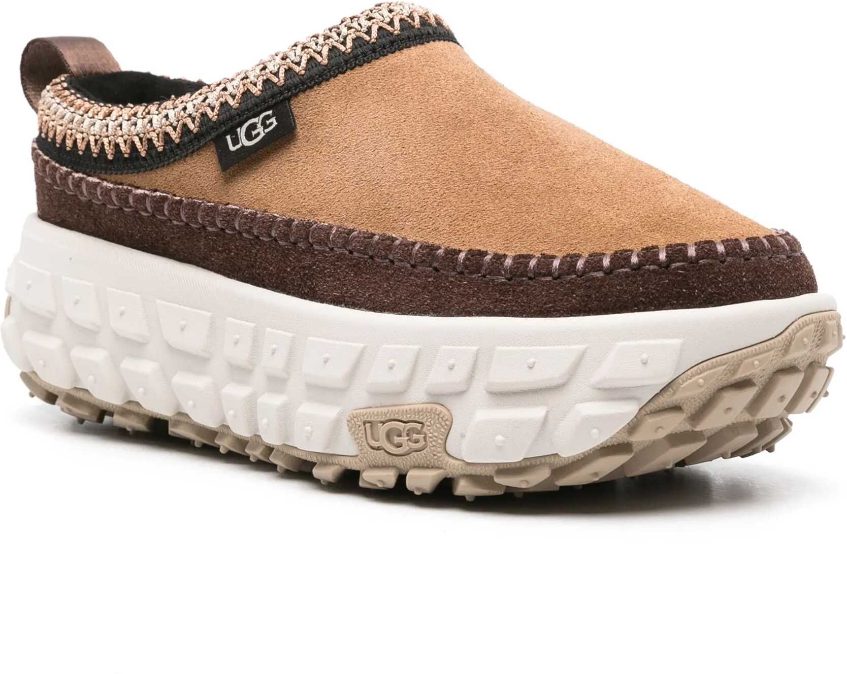 UGG's Venture Daze Mules are made of suede leather, with a textured platform sole made of karram-effect rubber that provides a rugged, modern feel. The round toe and slip-on design ensure comfort and practicality. Multi-color and contrasting all-over stitching add a distinctive element, while the brand's iconic monogram is embroidered on the side panel. The nylon pull-on makes it easy to slip on, completing a style that combines style and functionality.