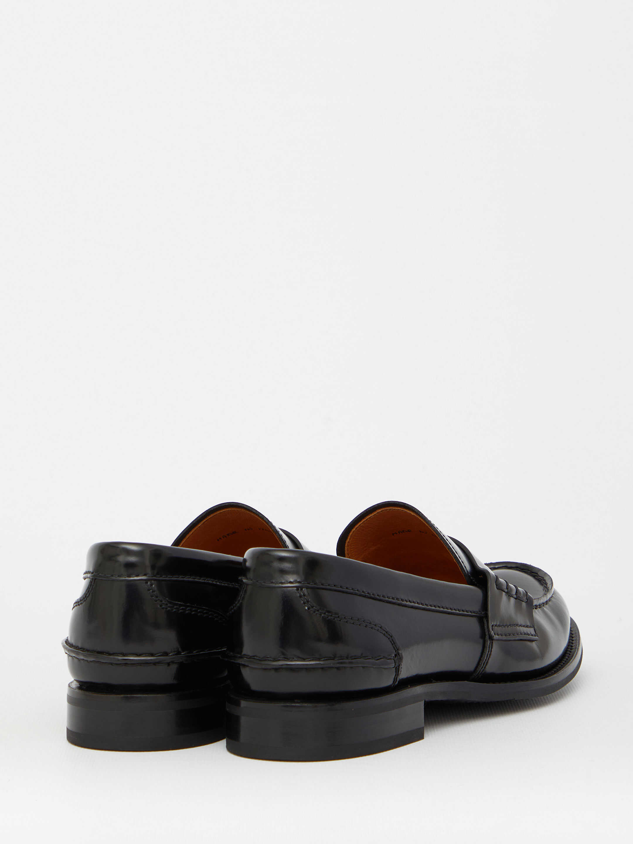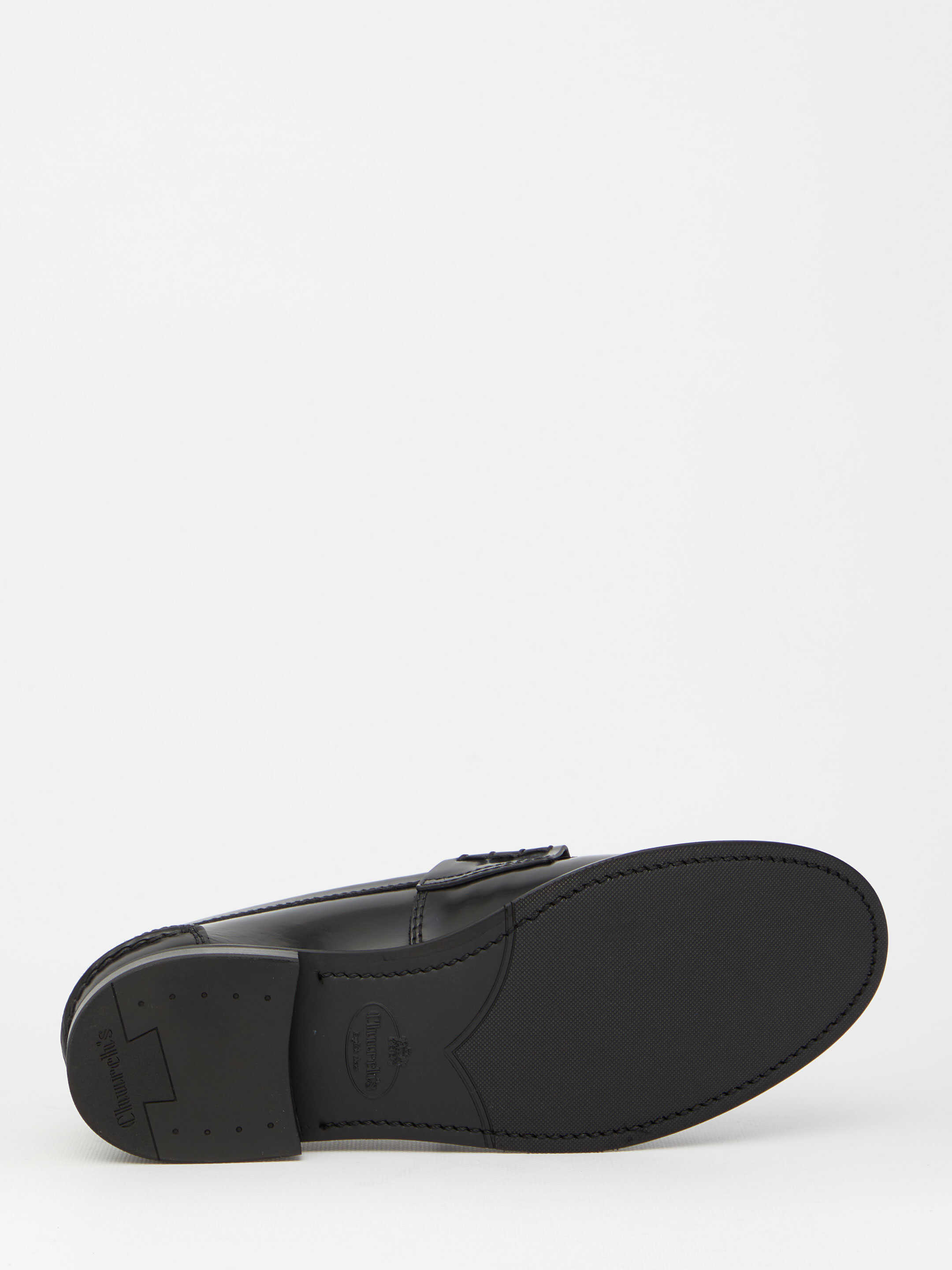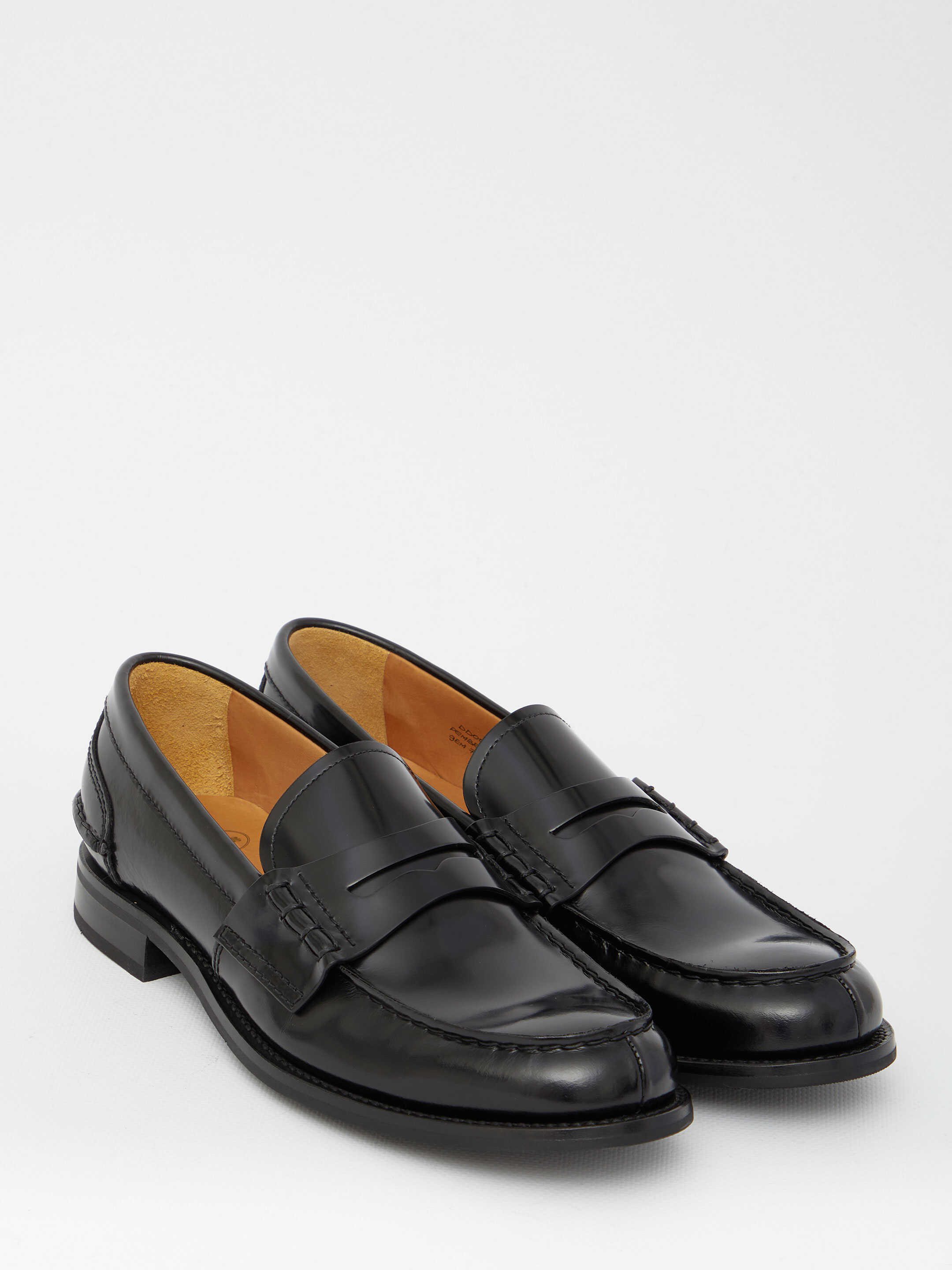 Pembrey W5 loafers in black polished fumé calfskin with side handmade stitching. They feature serrated toe cap, internal heel support detail, Church's logo on insole and sole and non-slip rubber sole. Blake construction.