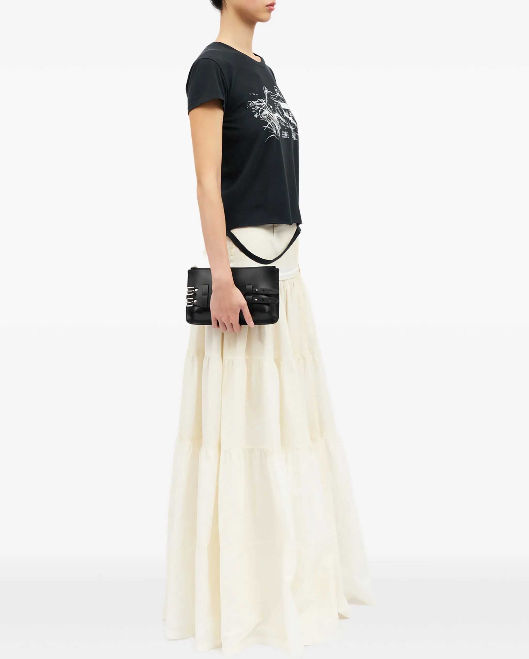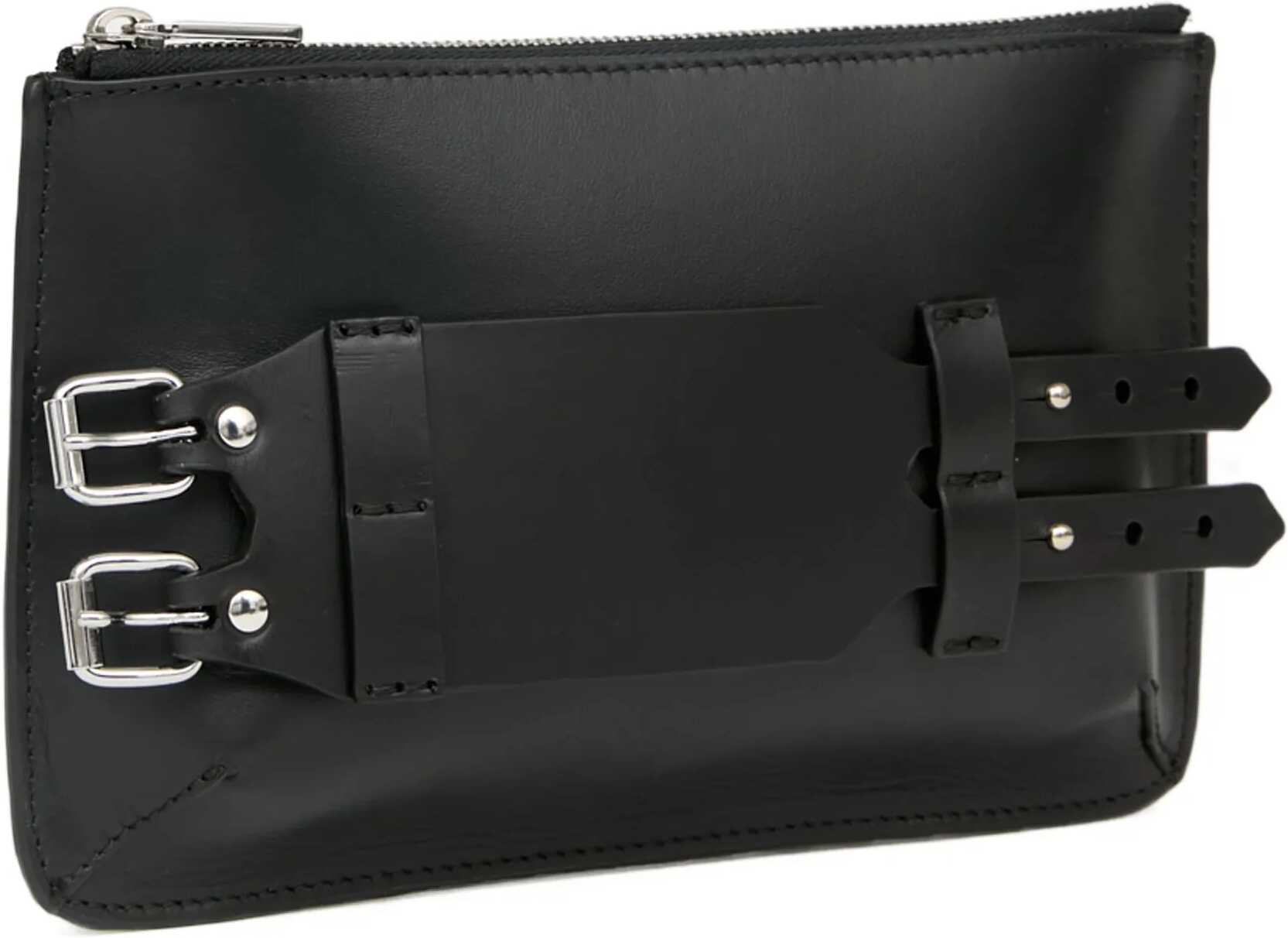 MM6's leather Pouch Bag is a modern and versatile accessory with a cuff design that easily fits around the wrist thanks to adjustable buckles on the back panel. The top zipper closure provides security and convenience, while the leather material adds a touch of elegance.