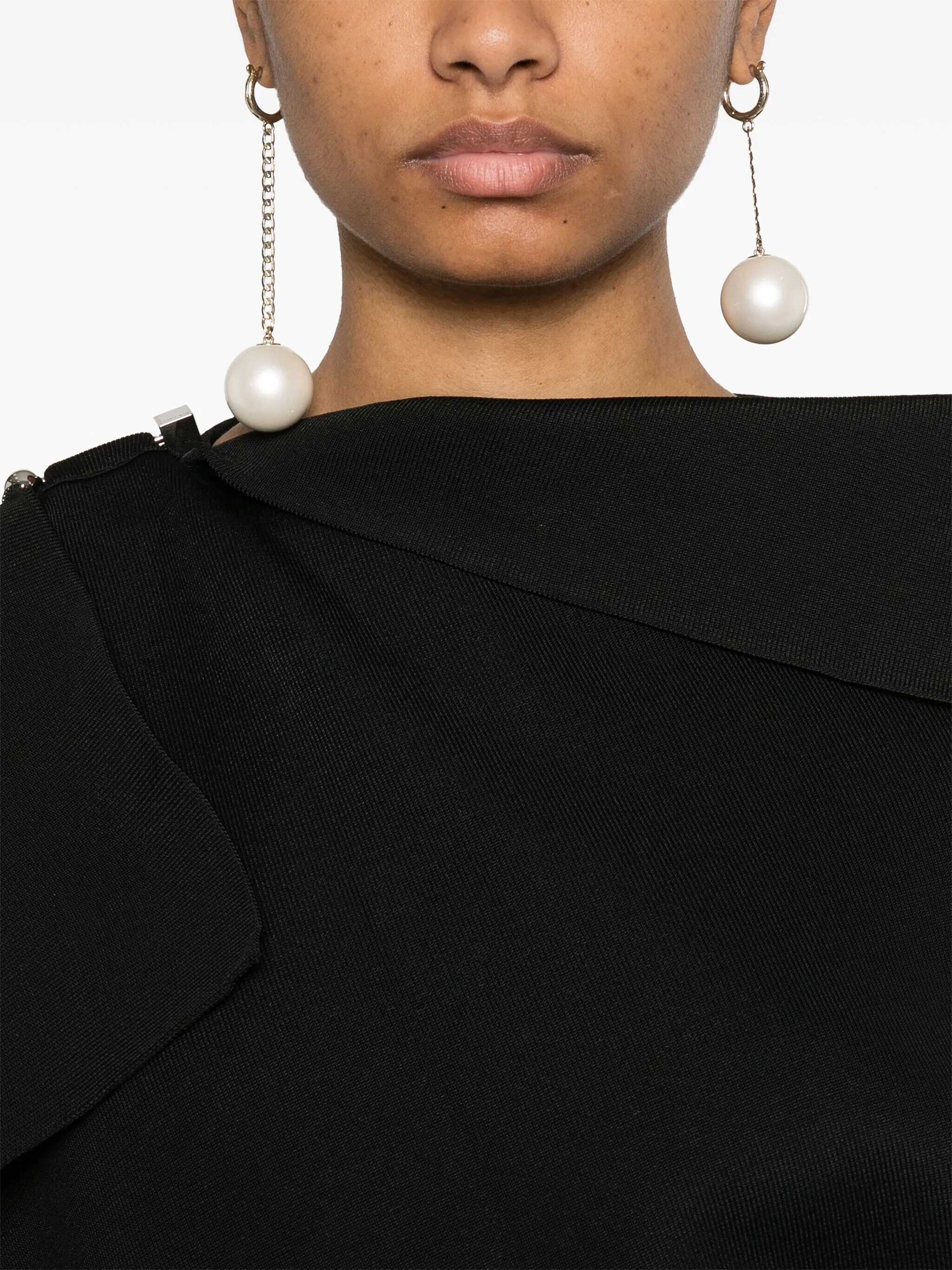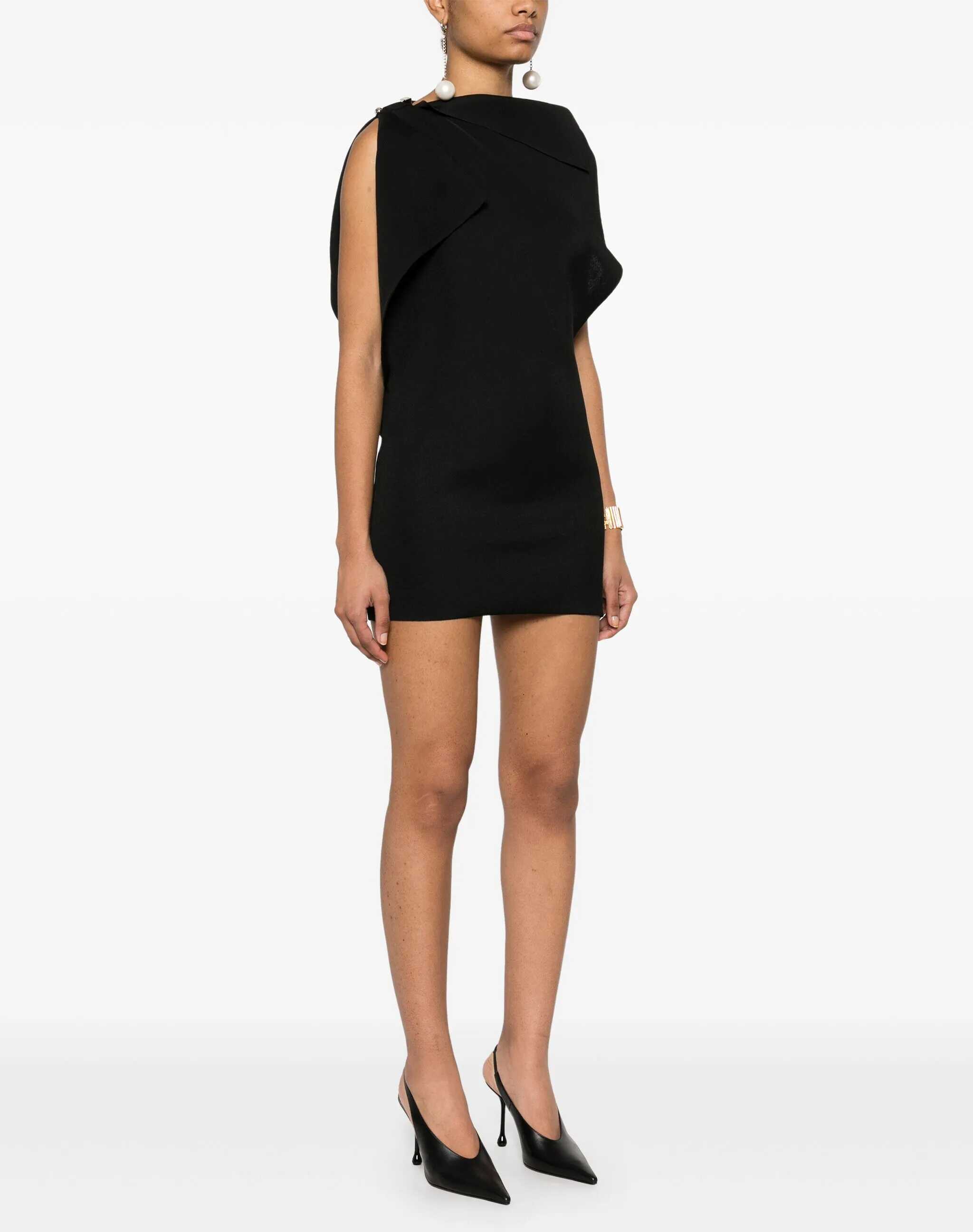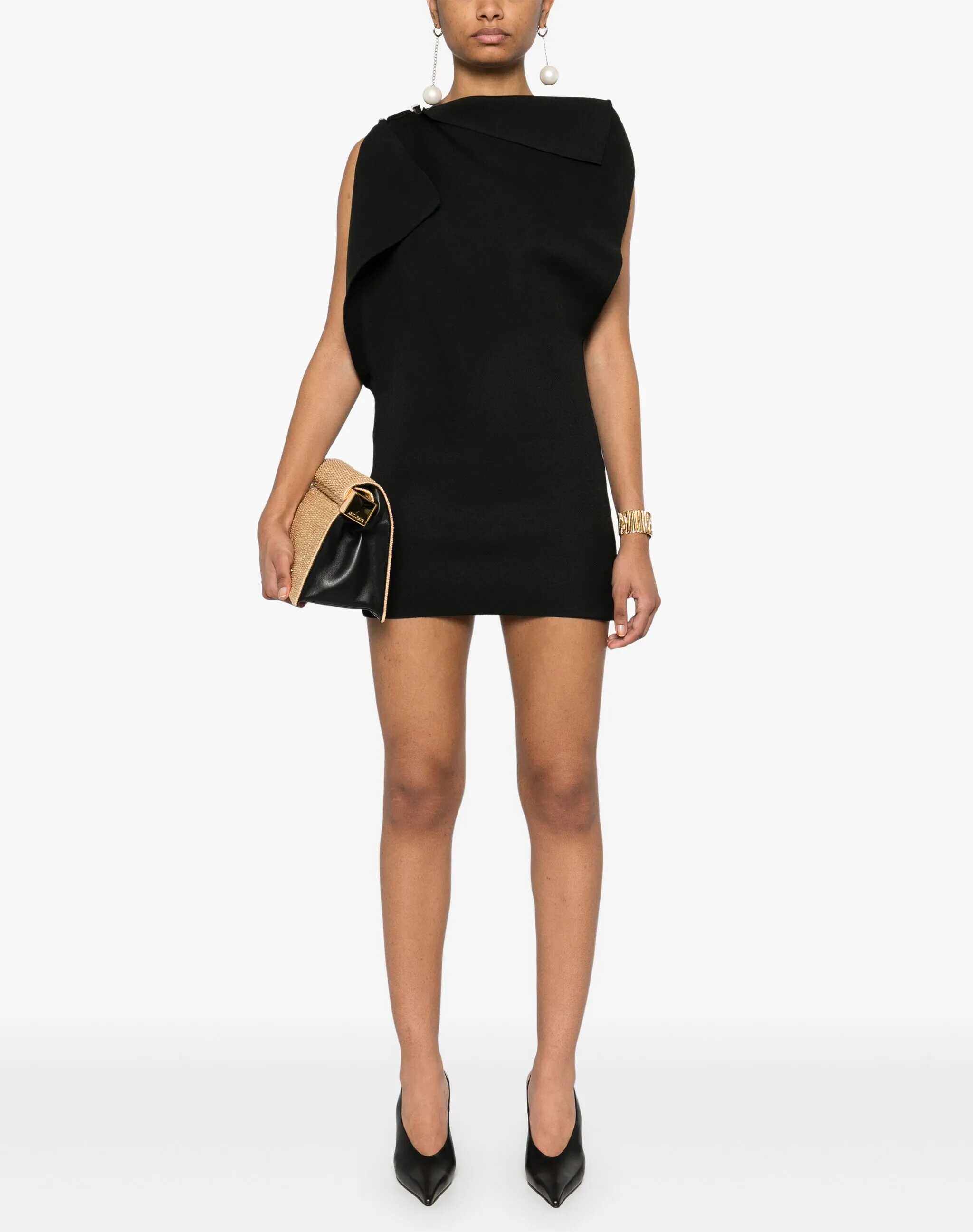 The Trapeze mini Dress by Jacquemus is an elegant and sophisticated piece with a design that plays on flowing, modern lines. The boat neckline adds a touch of sophistication, while the draped pattern creates a soft and dynamic effect on the figure. The strategically placed brooch detail gives the dress a distinctive and refined element. Perfect for a chic and contemporary look.