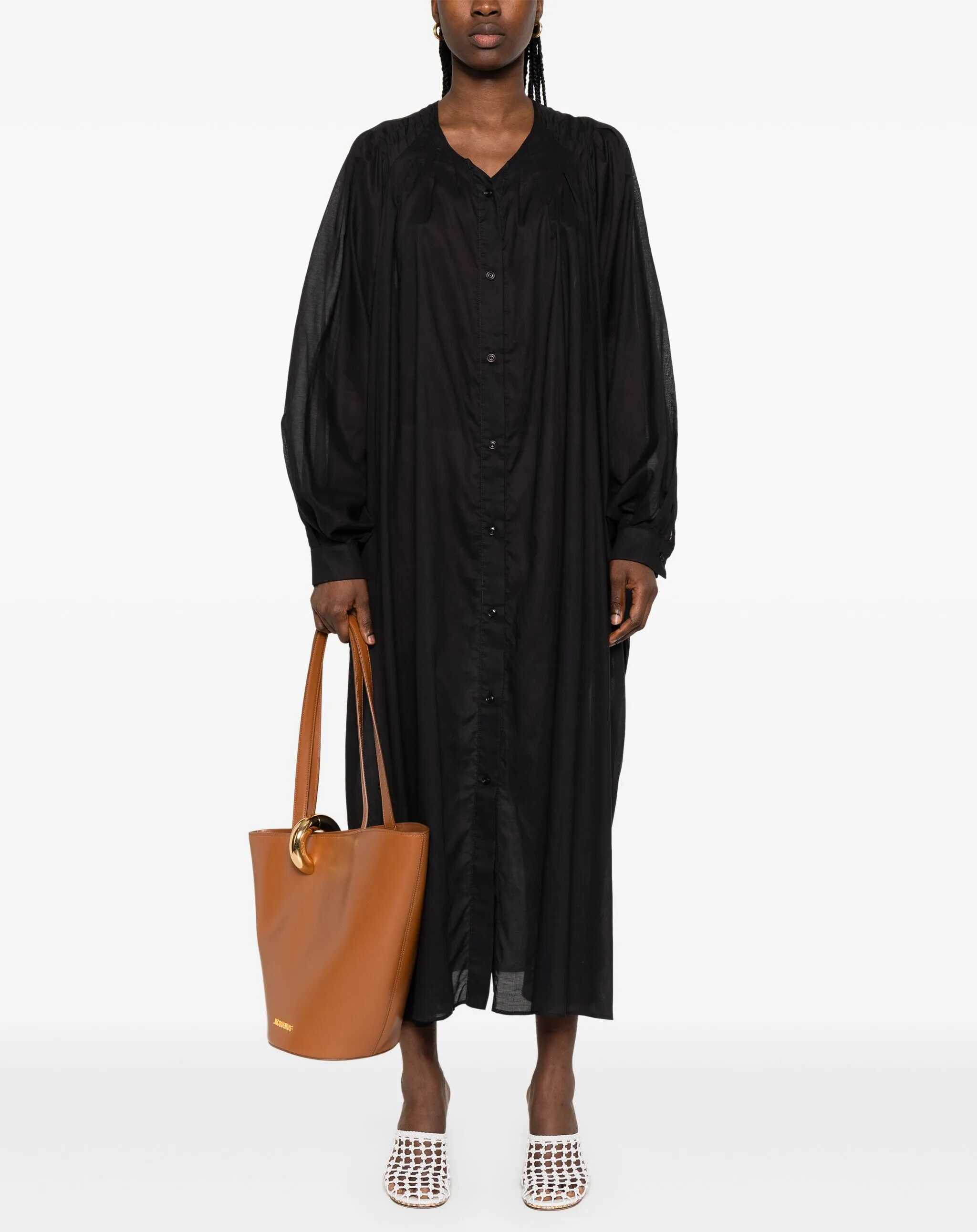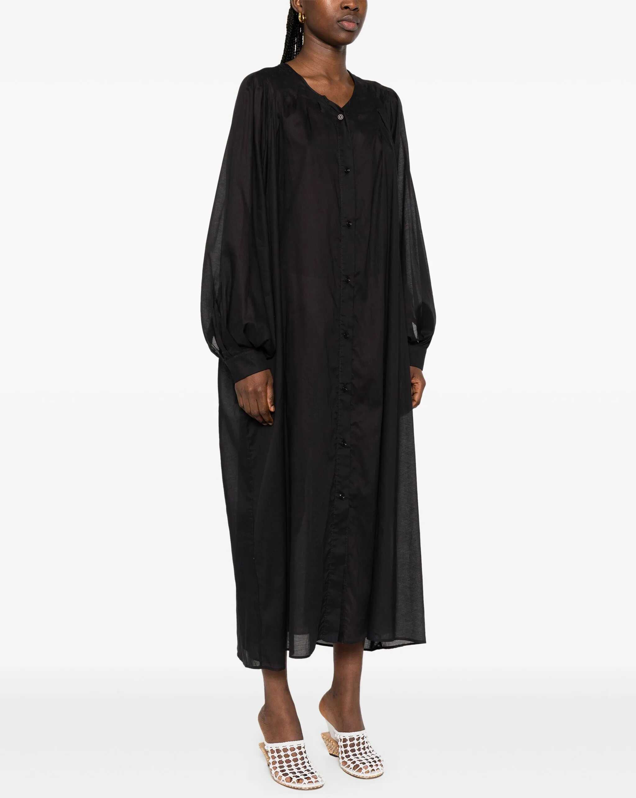 The Latest's long chemisier Dress is made of cotton with a lightweight and versatile design. The front button closure and wide raglan sleeves lend a relaxed yet sophisticated look. Adjustable button cuffs allow you to customize the fit of the sleeves, while the two side welt pockets add practicality. The semi-transparent design and oversize fit complete the dress, creating a sleek, contemporary effect. Ideal for those seeking a comfortable yet stylish garment.