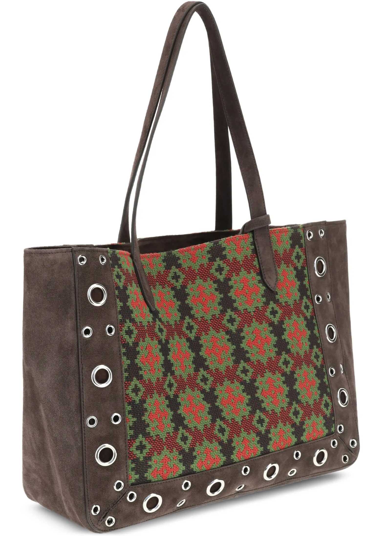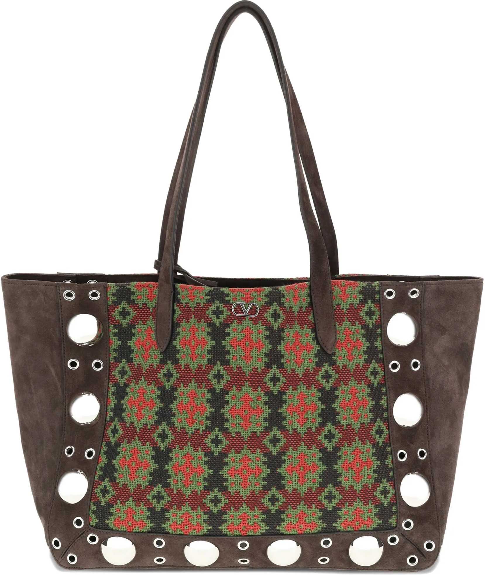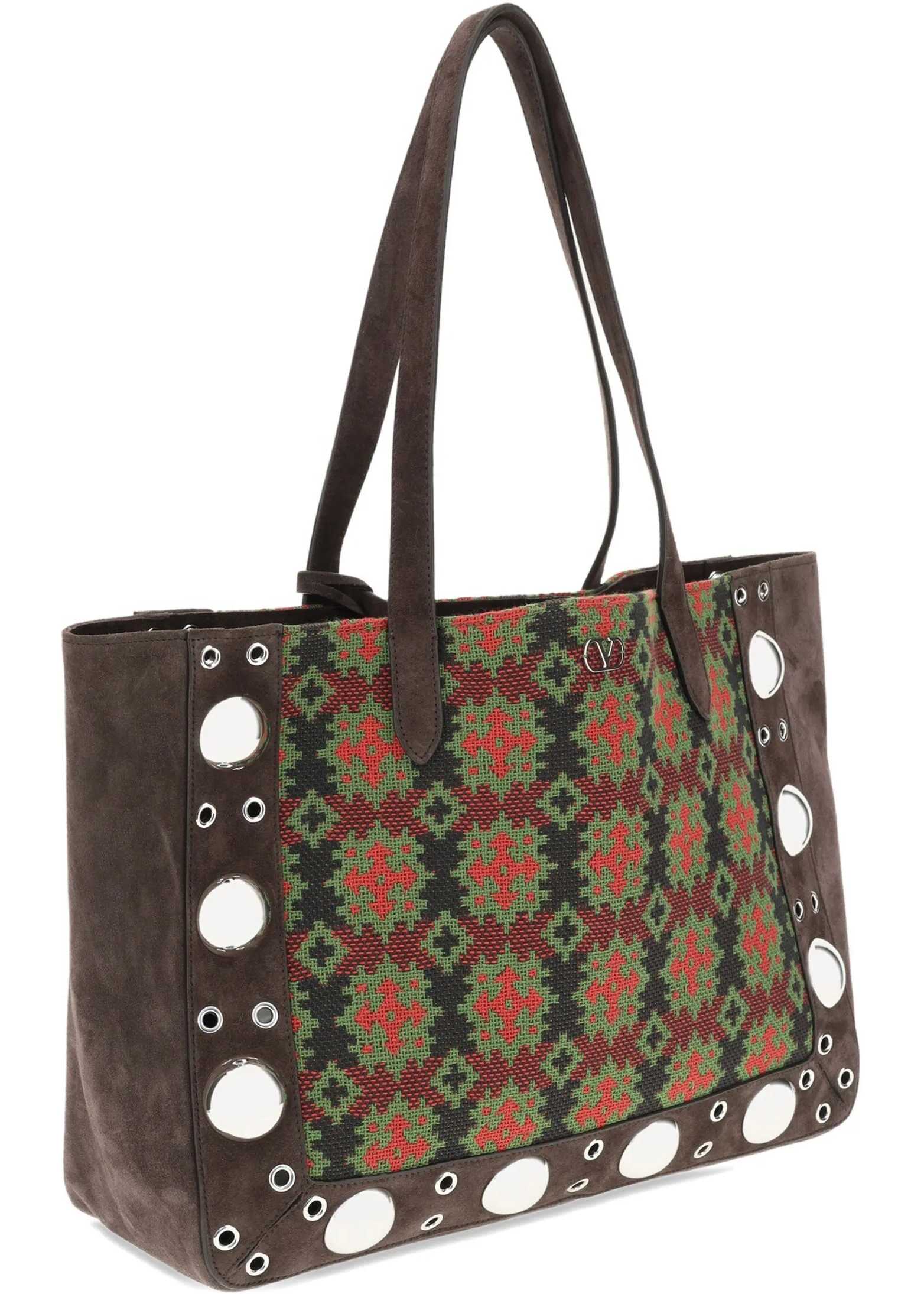 Valentino Garavani's Nellcote Tote Bag is a combination of elegance and practicality, crafted from suede and embellished with geometric cross-stitch embroidery on one side. The sophisticated design is enhanced by an iconic VLogo plaque on the front and ball studs on the front and back, accentuating its bold character. Featuring two top handles, the bag offers a removable pouch and a single compartment inside, ensuring convenient organization. A luxury accessory perfect for any occasion.
