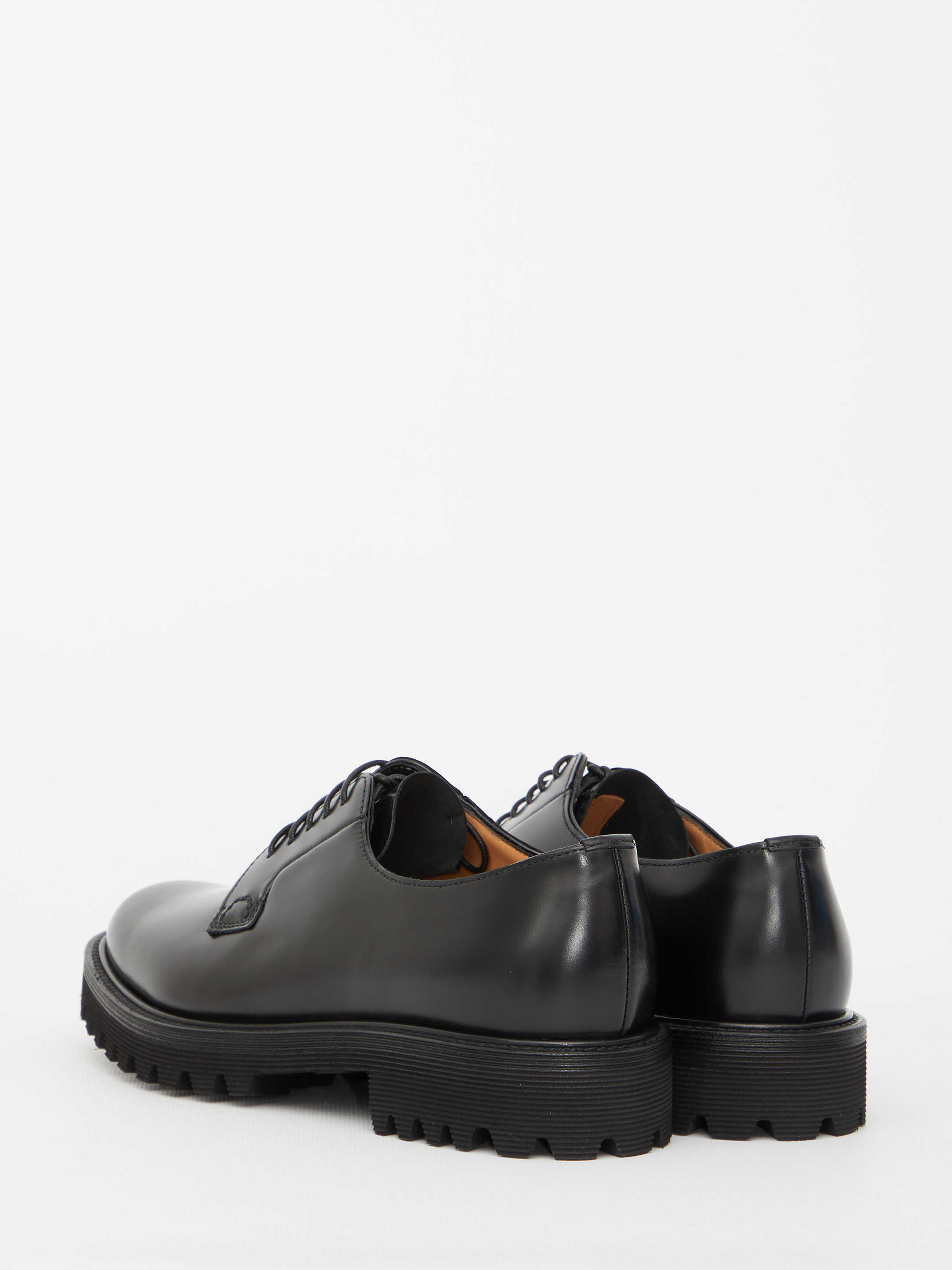 Shannon T derby shoes in black natural-finish Rois calf leather with waxed cotton laces. They feature bellow tongue, half moon stitching detail to eyestay, lightweight rubber St Moritz sole and Church's logo on insole and sole. Fit G.