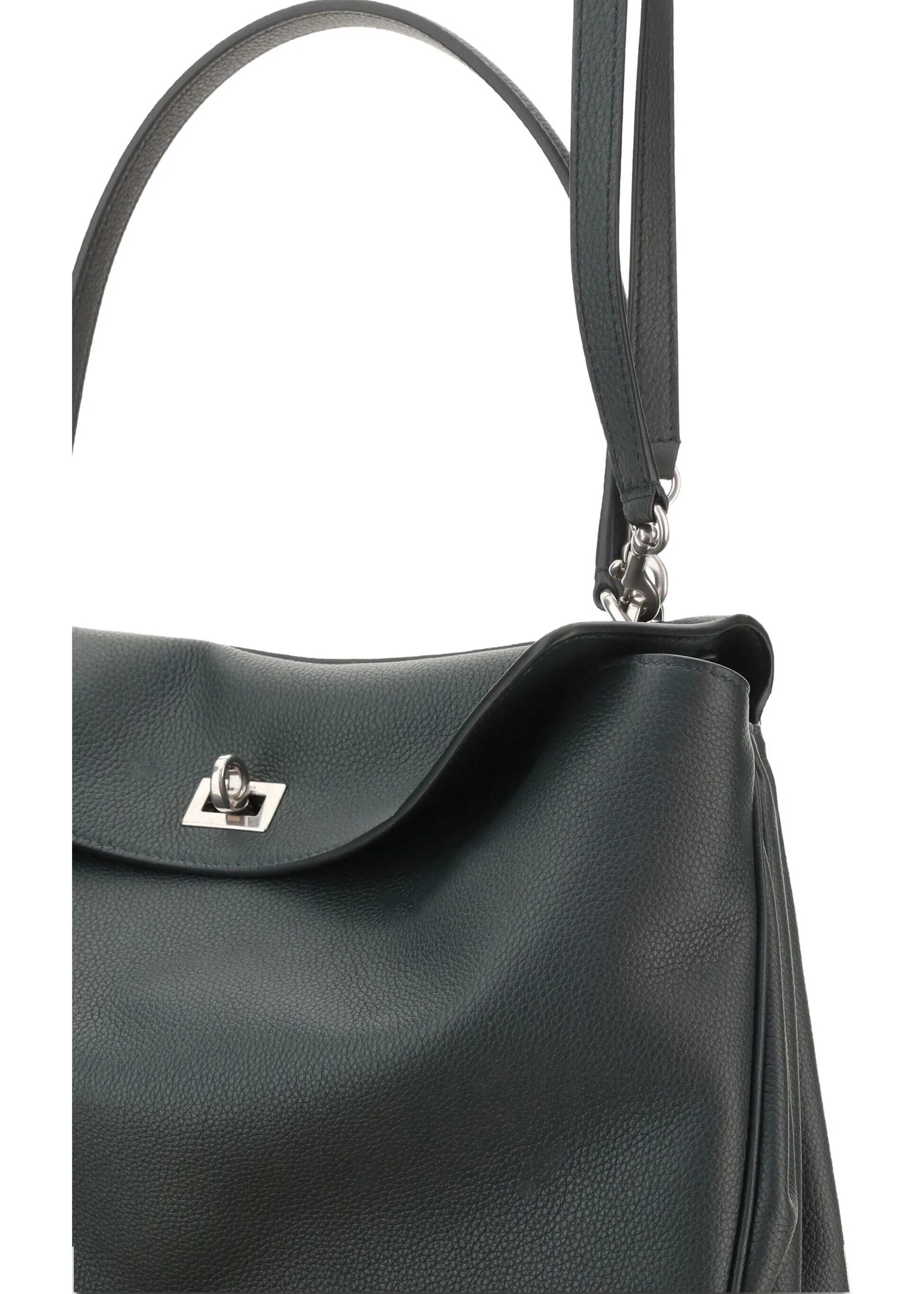 Balenciaga's Rodeo Leather Shoulder Bag features a top handle for a comfortable and stylish grip. The front closure features a flap and swivel, adding a distinctive and functional detail. Applied keychain detail on the top handle. The removable shoulder strap is attached by snap hooks, allowing it to be carried either on the shoulder or by hand. Inside, the bag offers single interior compartment, ideal for organizing essentials. In addition, there are metal feet at the base of the bag to protect it and keep it in place.