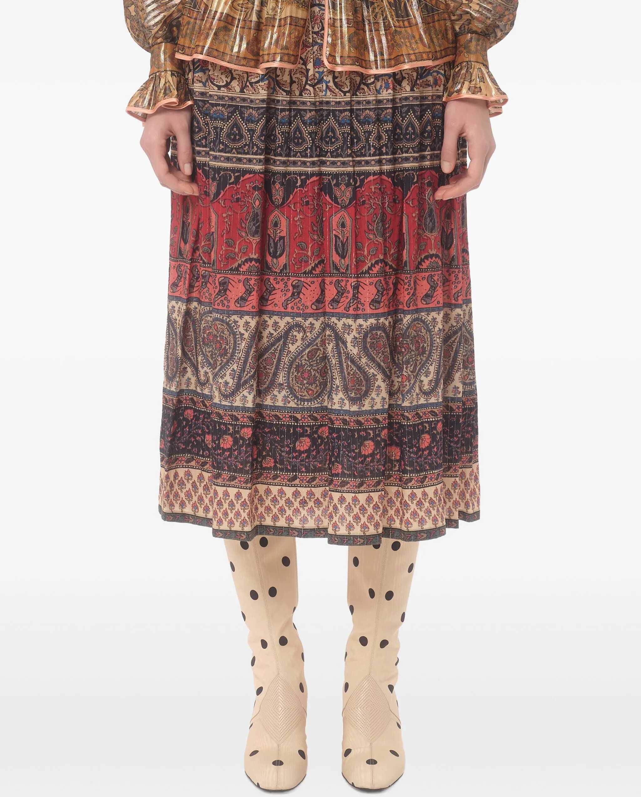 Valentino's midi Skirt is a sophisticated and refined piece with velvet details that add a touch of elegance. The basque at the waist accentuates the silhouette, while the side zipper and hook-and-eye closure ensures a perfect fit. Made of Lame' muslin with theVoyage Imaginaire print, the skirt has a light, flowing texture that gives it delicate movement. Perfect for those looking for a chic and contemporary look, ideal for special occasions or elegant evenings.